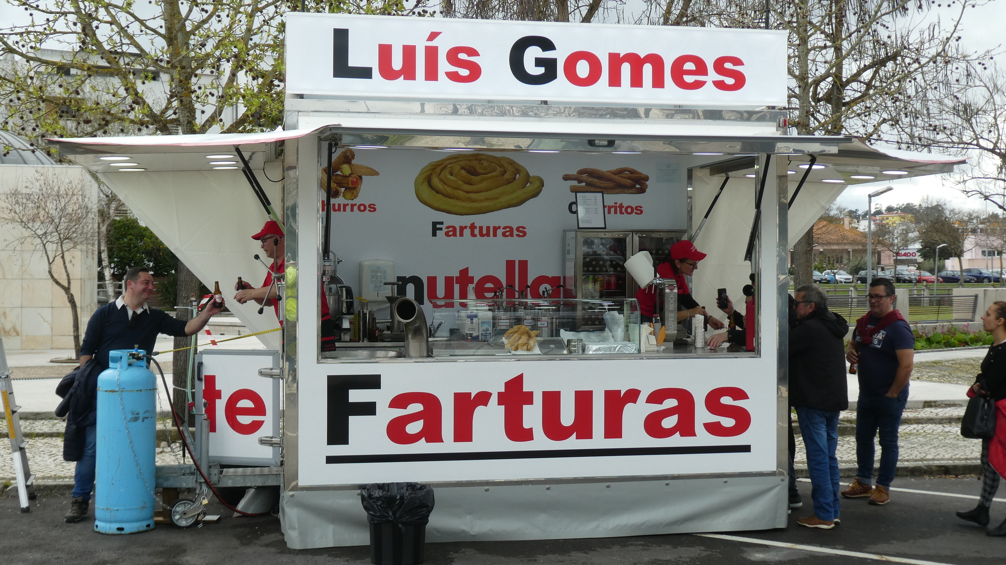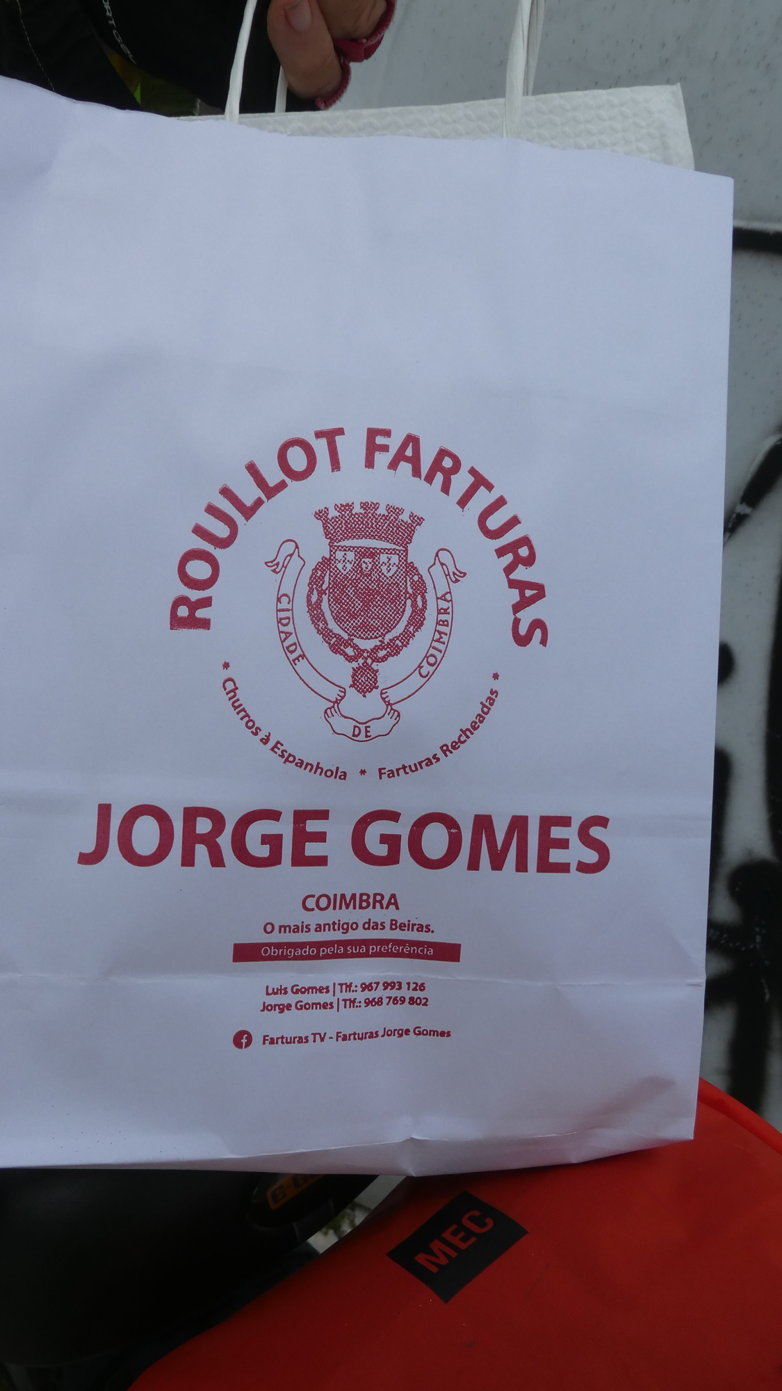 This shop seems to be a chain with HQ in Coimbra. The bag is a little confusing. They mention Spanish churros, and this came to us stuffed with Nutella. But Farturas Recheadas means stuffed Farturas. The one thing I thought I had learned was that Farturas are dusted and not stuffed. This may need more research!