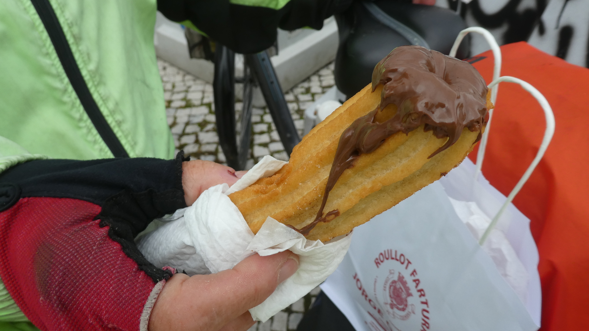 On learning that we were coming to Spain, our friend Cam hoped that we would find Churros, which is a kind of donut that gets filled with chocolate, or maybe Nutella. We did pass a lot of churro stands in Spain, but they were all closed - out of season? Now, in Portugal, we spotted what looked like our first live one.