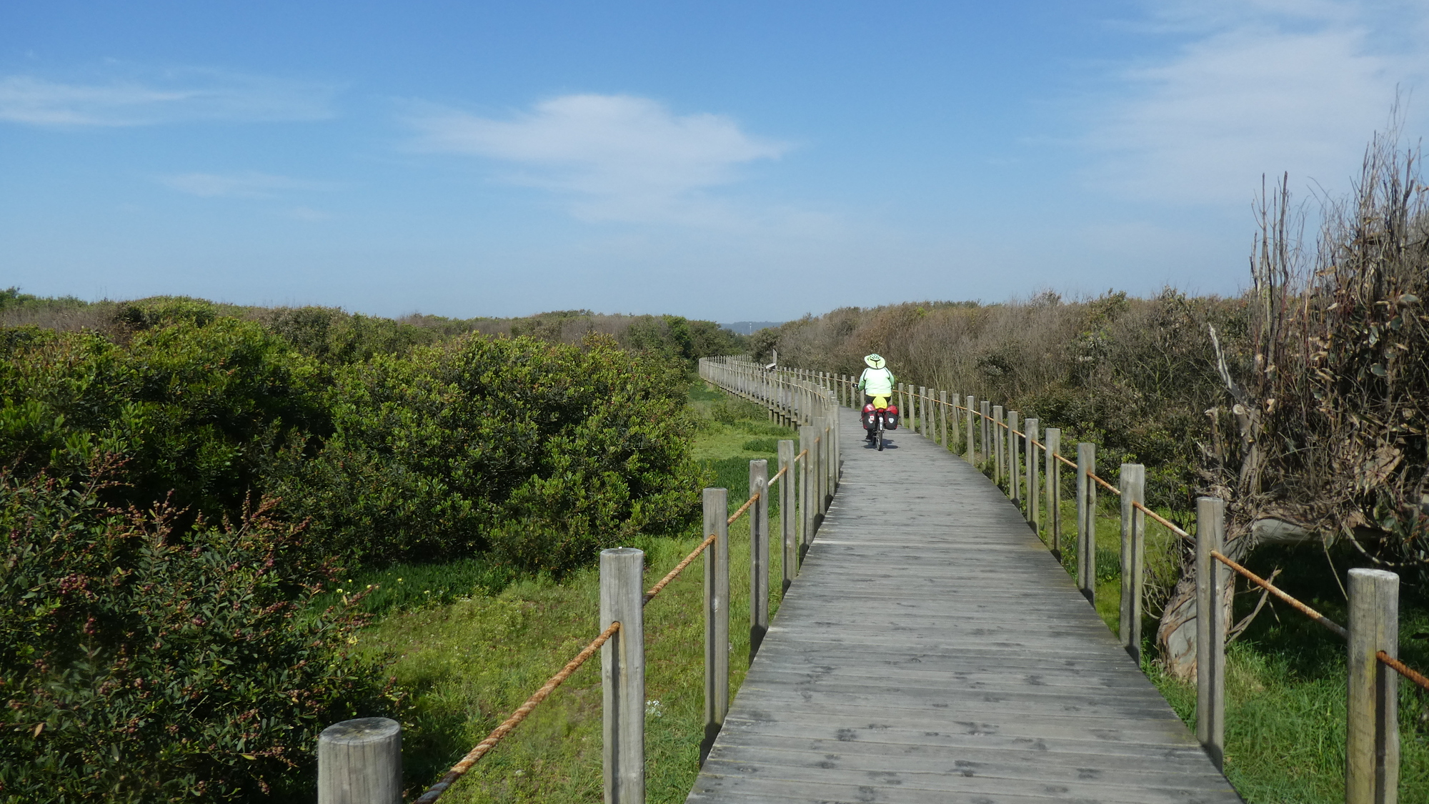The trail set off through the dunes and salt marsh on a raised boardwalk. It was a bit harrowing, because some of the boards were missing, and I had a ringside view of the remaining ones flexing as Dodie's bike rolled over them.