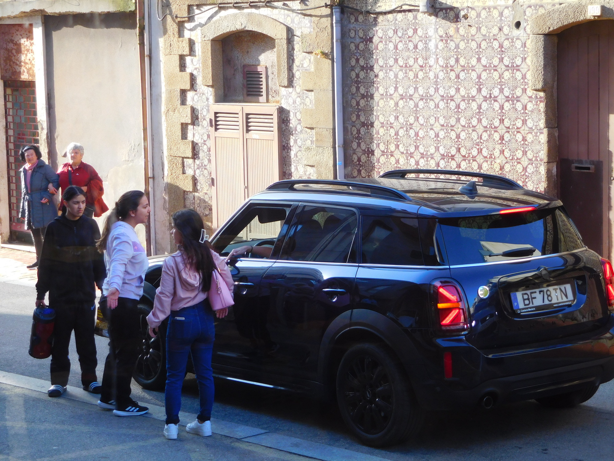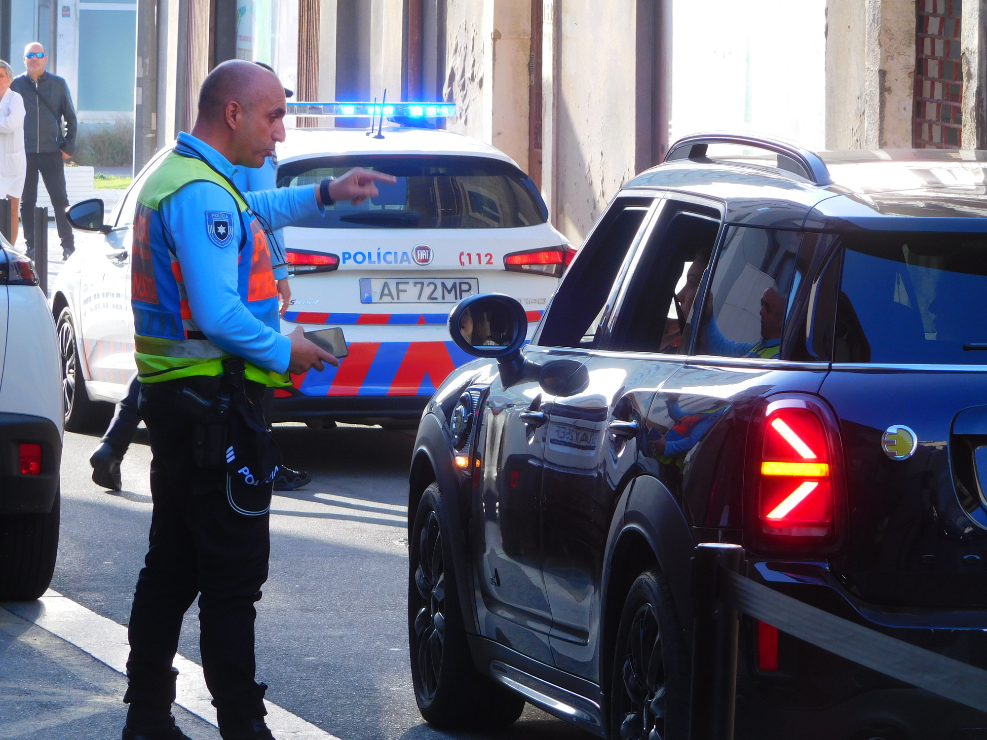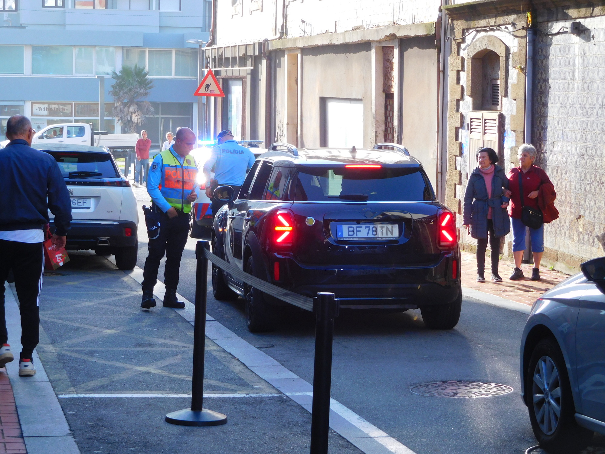 We went into the Pingo Doce, and like many in the store, we watched out the window to see the next act. This came quickly as the police arrived (presumably backing up the blocked, one way street). The police did a lot of yelling at the girl, but made no progress. Finally, with a lot of arm waving, they directed her to back her car into a parked position on the side of the street. We watched in amazement as the girl moved the car forward and back, but was not quite succeeding in parking it. Did she not know how to drive?