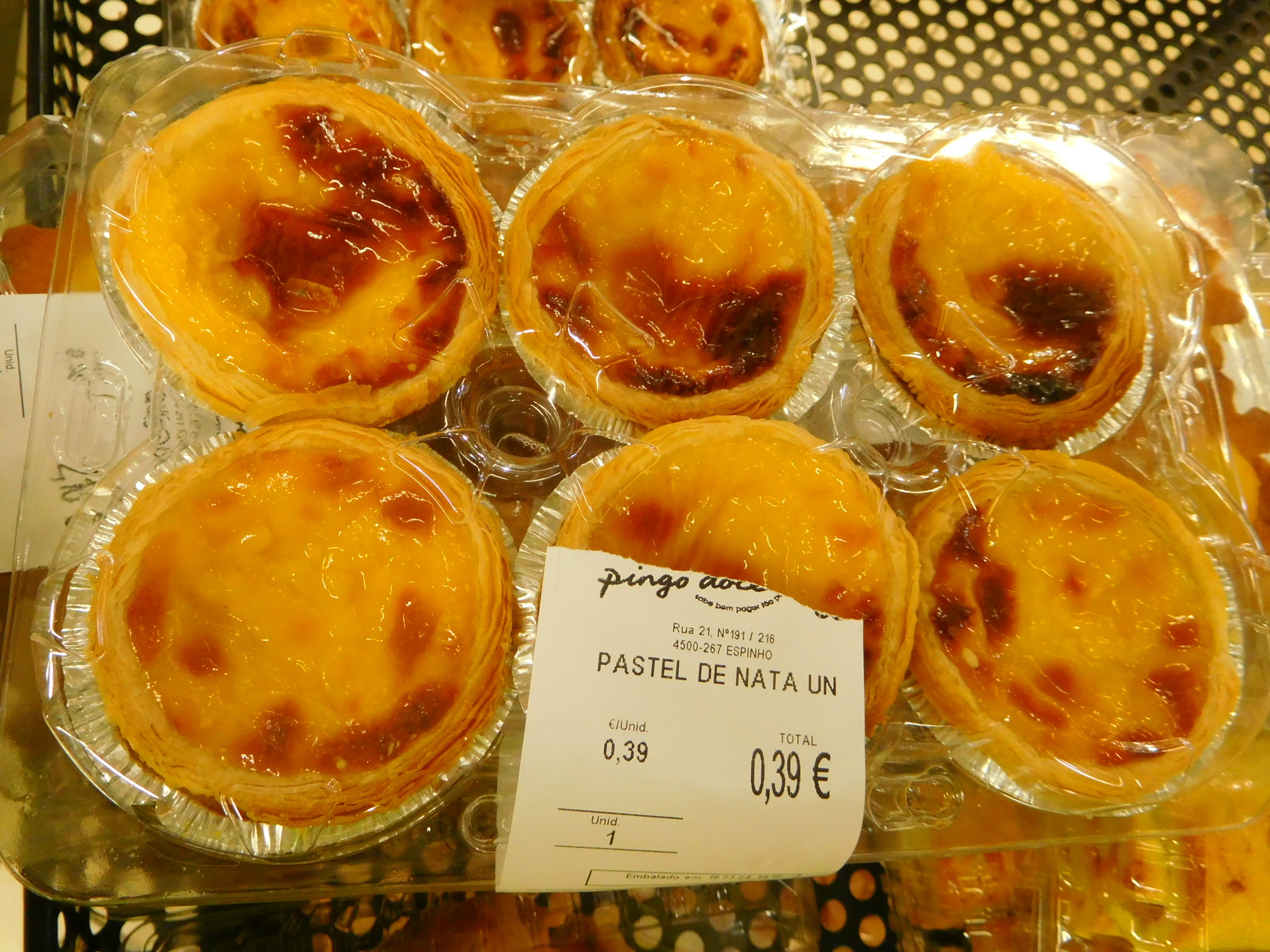 By the way, at .39 euros each, Pastel de Nata is five time cheaper than in Spain, although these are not gourmet specimens. Also of note, the six pack shows a per unit and not a total price. In Canada, the tray would be marked 2.34 (.39 x 6). On the other hand, there is no sneaky value added tax slapped on at the till.