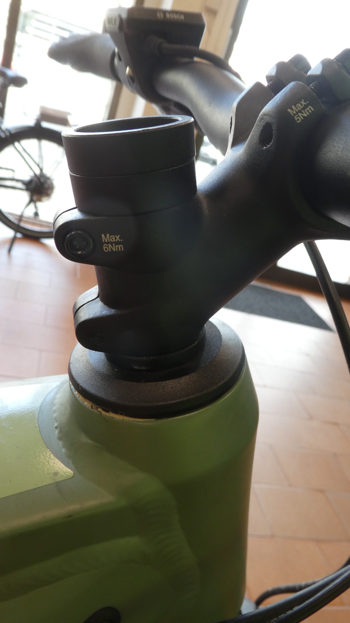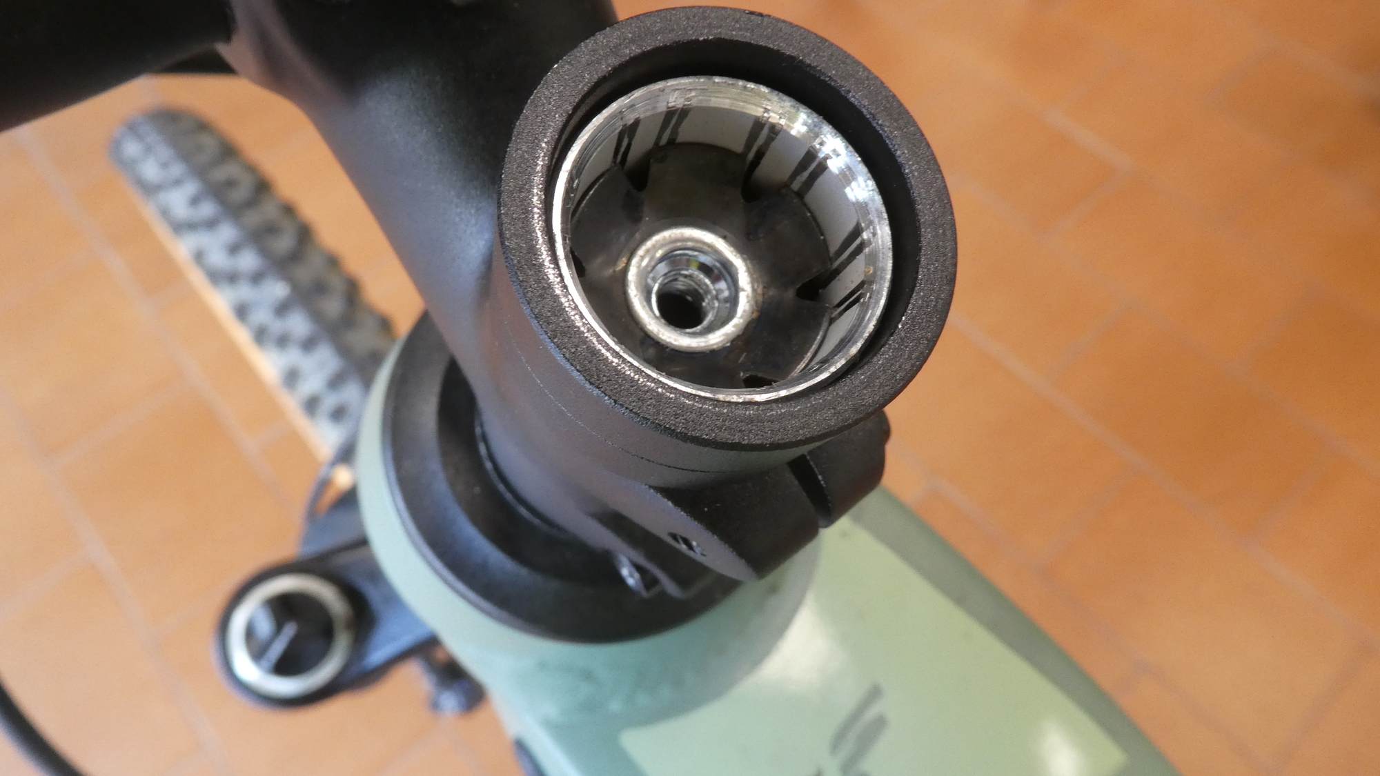 Our elation turned to despair as Beñat looked at the twin part, from Dodie's bike, that we had brought to show what we needed. He explained that ours is an old old system, for which he had no parts. Nowadays, the stem is held on with two bolts, and a part that presses down into the head tube. This is wedge-like, but it's not at all the heavy cylindical wedge we needed for our "quill style" stem.