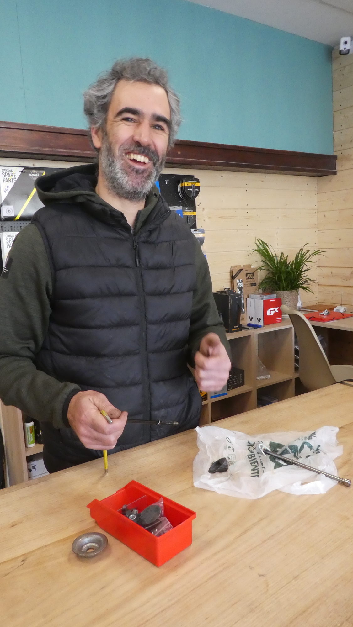 It was really looking like curtains for us. Even if we waited till Tuesday, it was not clear we would find a solution. But Beñat set about trying to find an answer. He thought about some alternative bolt and nut solutions, but no. So then he took a stroll through the bikes in the back, awaiting repair. Each one had the not ours system, except one! This is where we see the mark of a really decent person. Beñat decided to pull the part from that bike, and to gamble that he could source a replacement before its absence would cause a problem. He also guessed at the cost of the replacement, in suggesting to us a totally modest and reasonable price.