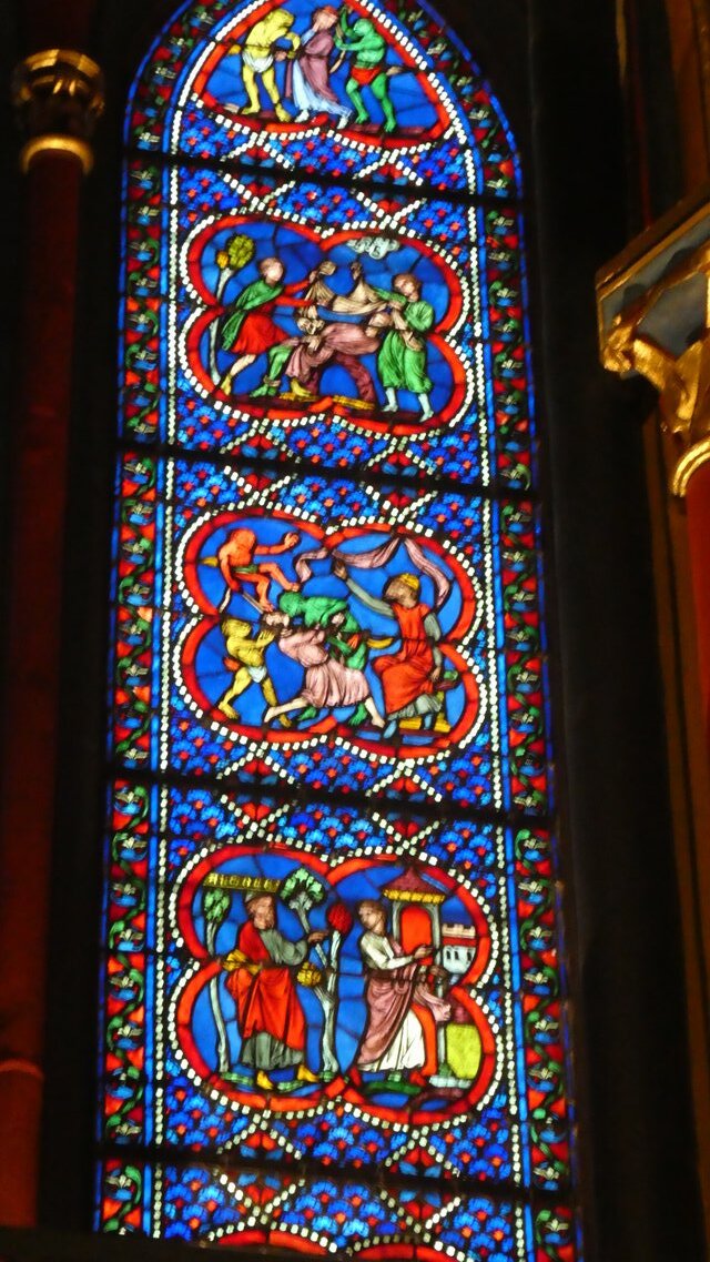 The hotel is a super narrow 17th century building, wedged in, on a narrow main street leading to the cathedral. We are on the walk up third floor, not bad, because there are five floors in total. As to the quality of the place, it's tricky. Objectively, it has wildly not level floors, low quality flooring and walls, tiny bathroom, rickety bed, and so on. This compares to the amazing high quality hotel rooms we had at all price levels in Spain and Portugal, with tile everywhere, amazing plumbing, good windows, and so forth. But this rickety old place is what we have come to expect for France. Not to mention the croissant, orange juice, coffee breakfast offered for 8.50 euros.