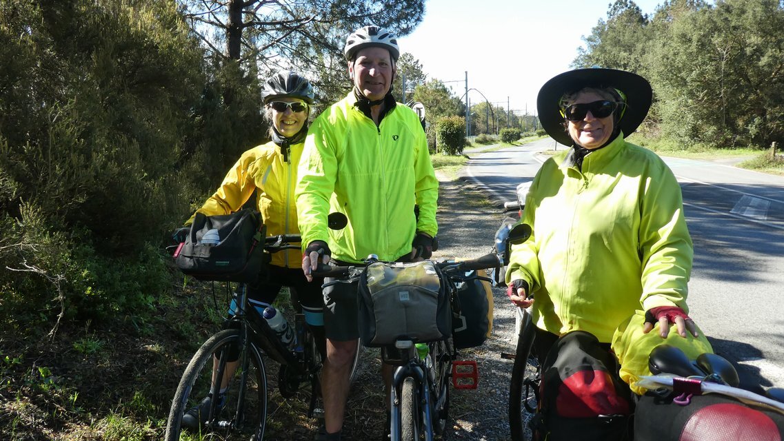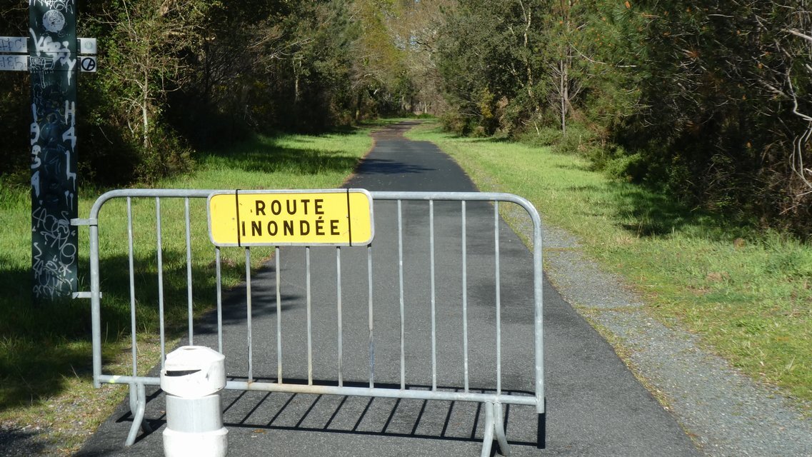 We were deciding whether to try the flooded route when some cyclists emerged from the path. I asked them in French if it were truly flooded, and they replied "Oh yeah", or the French equivalent, that's why they were retreating. At this point I glanced down at their gear and saw that their panniers were from MEC (Mountain Equipment Coop). "Canadians!", I exclaimed.