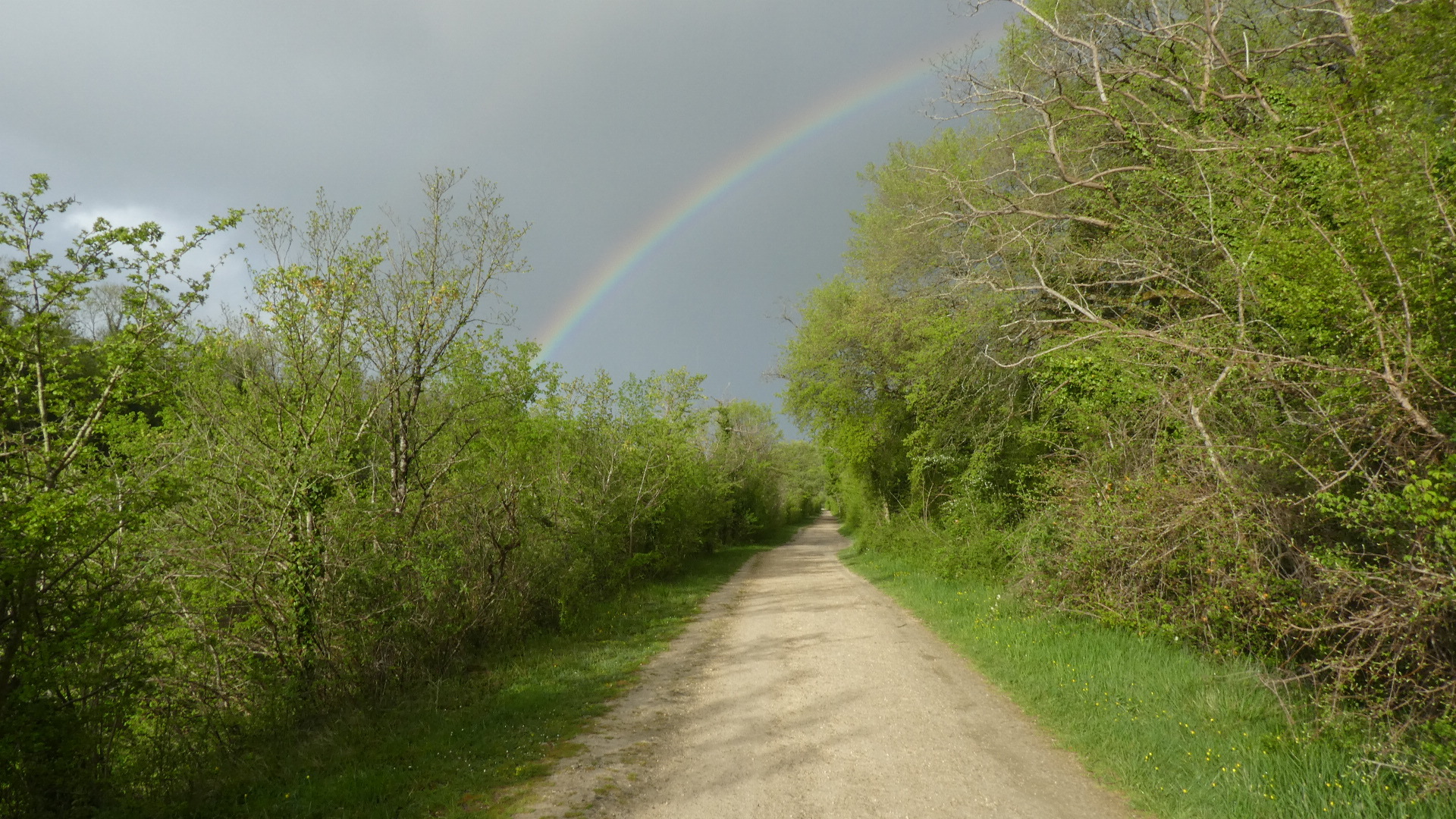 The path soon deteriorated to gravel, but it had a rainbow over it. Dodie was not falling for the rainbow as a magical sign of nature's cooperation, but rather as a sign of moisture in the air. She was right, and nature was gearing up to give us a hard time today. In fact, this evolved as one of the toughest days of the trip. A couple of more photos, and we'll be right into it!