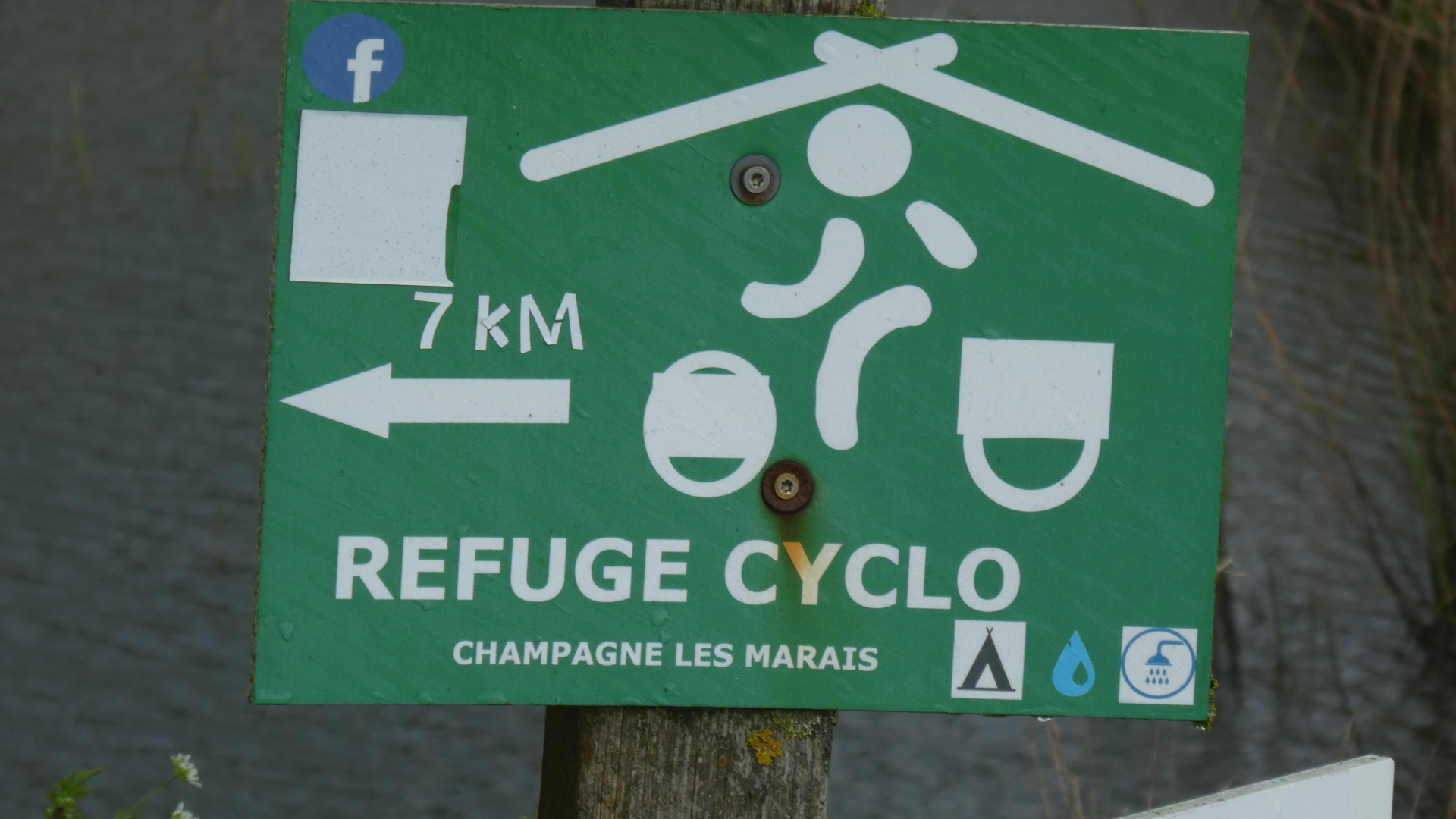 Finally we came to the one shown below. This at least gave a distance - 7 km - off route! This was not a gift from the Departement, but just an ad for some kind of BnB! At the time we came to this sign, the wind and rain were so hard that there was no way I should be able to get a photo. But I was ticked, and got one anyway, just to remember. (You can see "Champagne les Marais" easily on our track map above. It's nowhere near the track!)