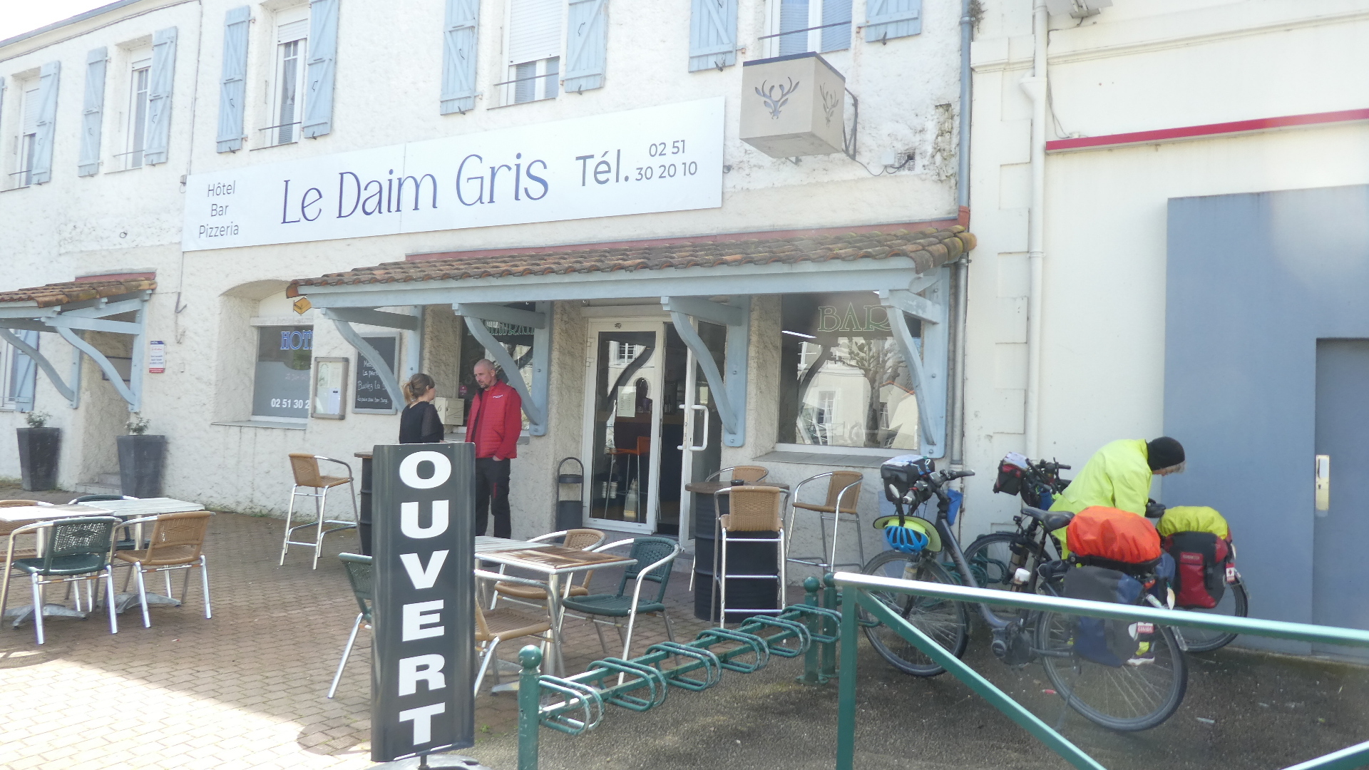 We unlocked the bikes and dragged them across to the other restaurant, the "Daim Gris". Daim is suede, so it was the Grey Suede? I repeated the inquiry process, and this time my victim was a "boy", looked about 14 to me, serving behind the bar. " Can you make a "plat du jour" was my foolish introduction. No, they were closed, only the bar functioning, said the boy. Dodie, behind me, hearing this, said "Fine, we'll just go to L'Aiguillon-sur- Mer". By this she meant we'd forget food and go to find our hotel. But a customer at the bar heard this and smugly chipped in "It will be the same there too!"