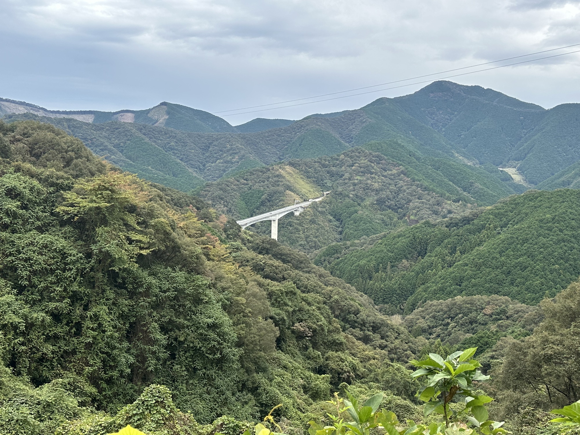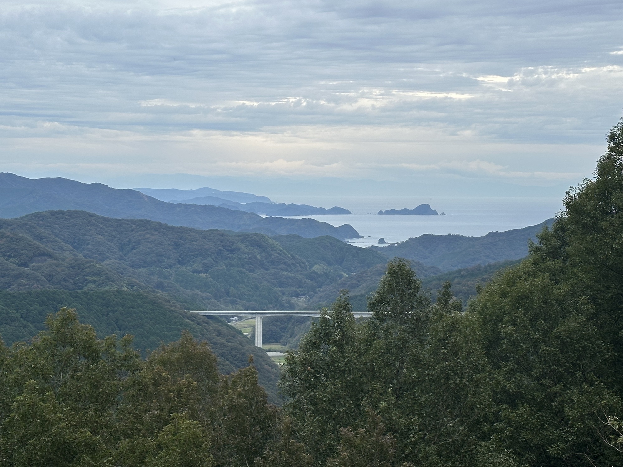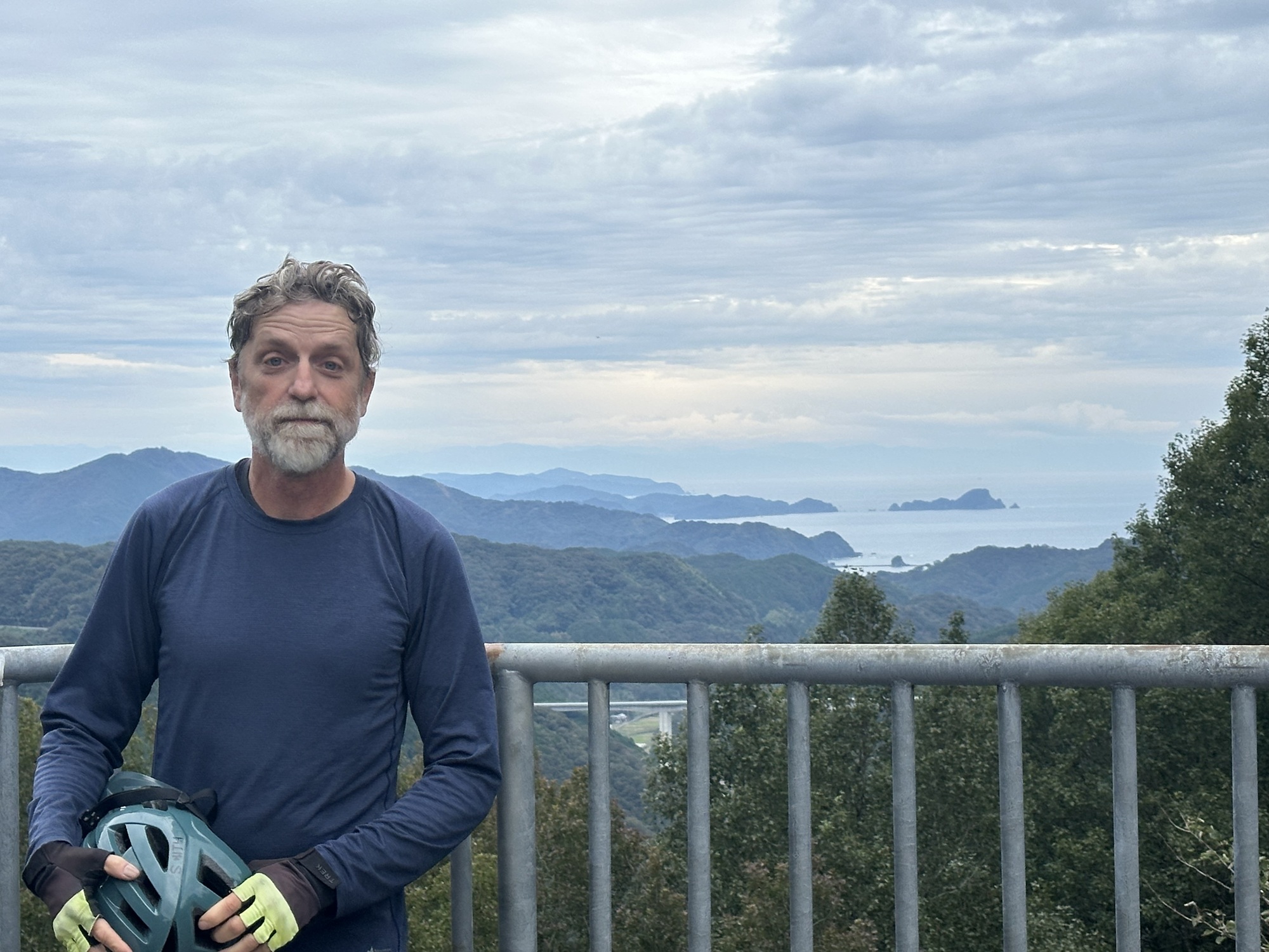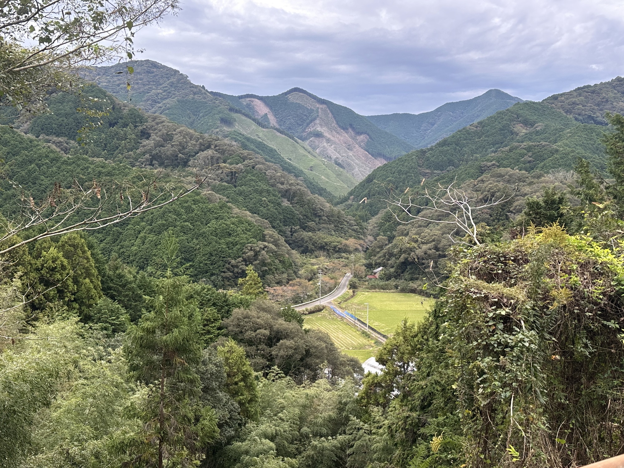 As roads in Japan so often do, this one went up into the hills and over a pass to reach the next valley — providing opportunities for scenery admiration and photos, but also much puffing and panting as we pedal up and up.