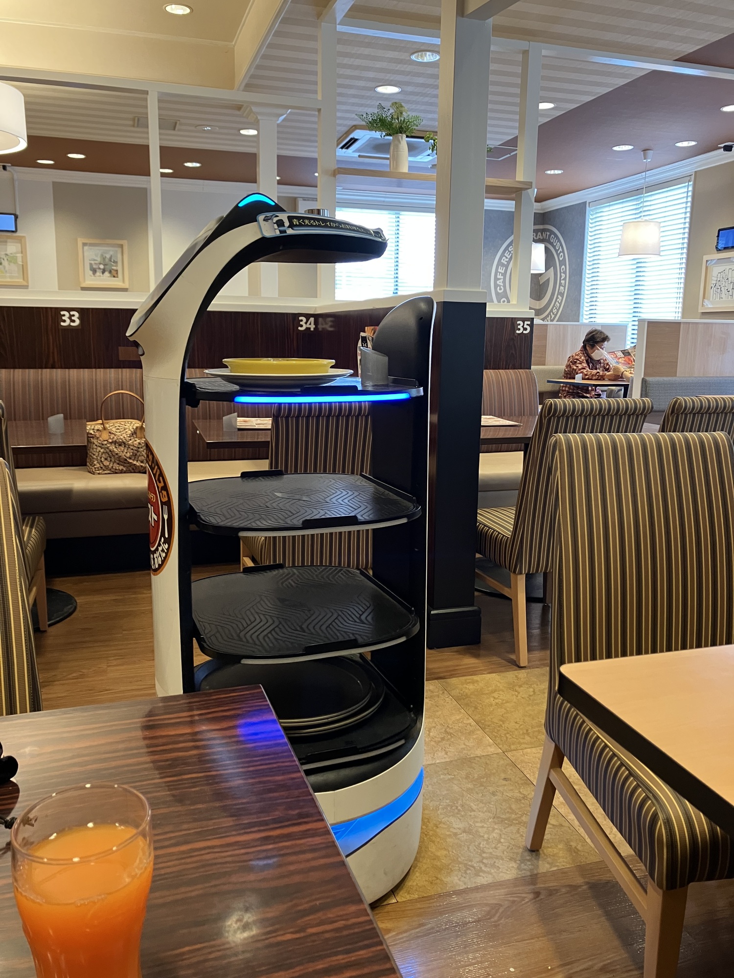 We made good time through the morning, so — unusually for us — we decided to break for a proper sit-down lunch. We’ve seen lots of little roadside chain restaurants and we opted to give one of them a try: the Cafe Gusto. As in many places here, you order from a tablet at the table. But at the Cafe Gusto they’ve taken automation a step further — our meal was delivered by a little wheeled robot.