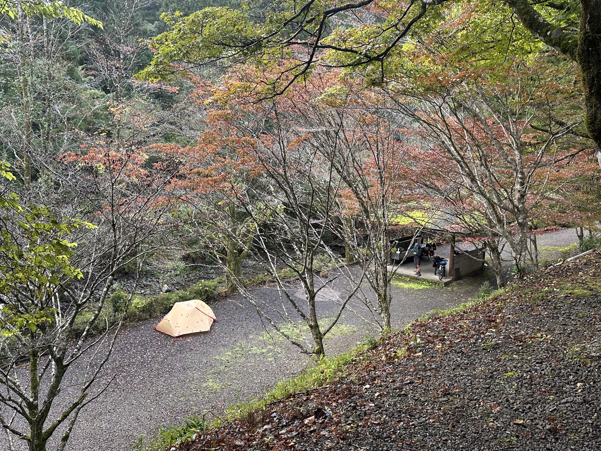 In the afternoon we met up with another cyclist — who turned out to be a Canadian, Will from Montreal, who had started biking in Hokkaido about the same time as us, and was also intending to make his way down to Okinawa. He was heading for a nearby campground for the night, but decided to join us at the campground we had in mind when we told him that it had an onsen nearby. The lure of an onsen is powerful after a day of riding! We rode together for the last hour or so, chatting about our adventures and impressions of Japan, over a succession of increasingly narrow, winding roads to the campground. Which turned out, like many of the campgrounds we’ve been to recently, to be deserted. We set up our tents and then hiked down the forest road a kilometer or so to the hotel that had the onsen, where we were a bit startled to encounter several other foreign tourists in such a remote location. It turned out they were part of a cycling tour group, staying in the onsen hotel.