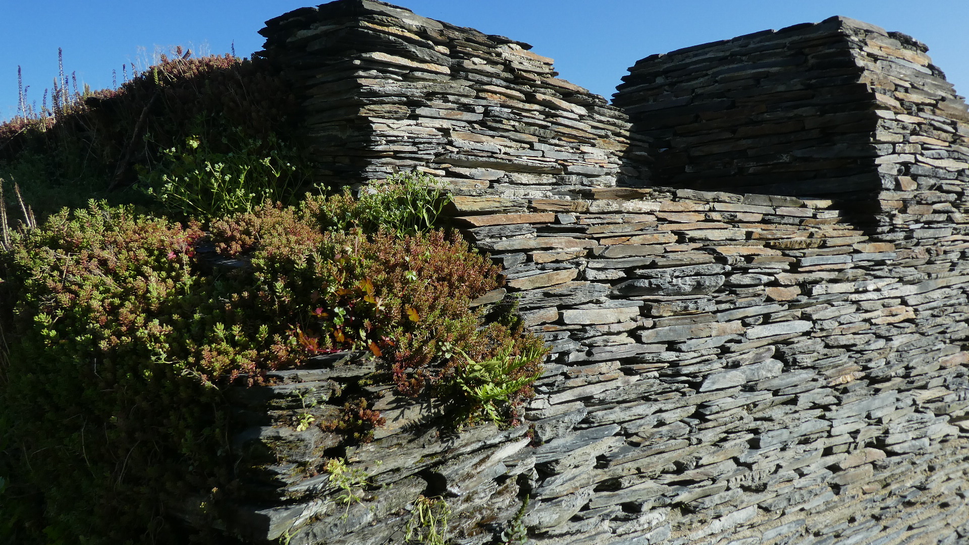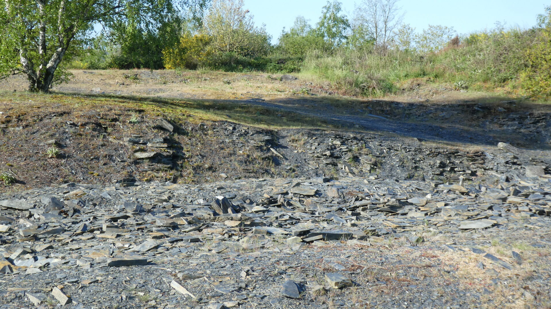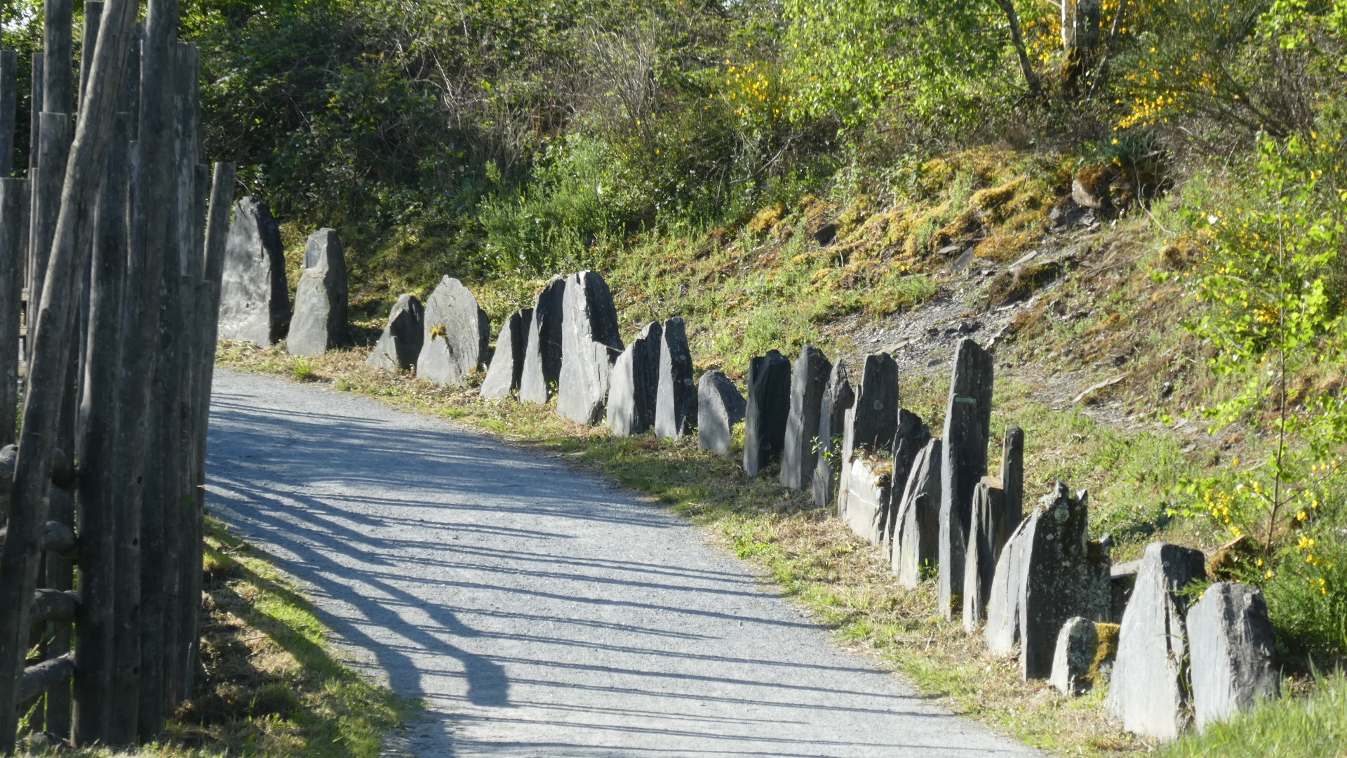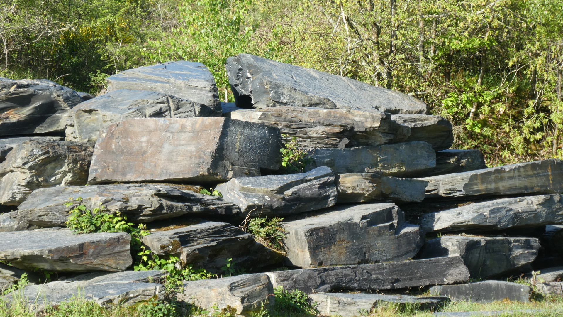 For our time in the park today, we had sunshine, and we really enjoyed every part of it. There were the unaccustomed piles of slate, slate slag, slate chips, and slate boulders; there were roadside panels covering the plant and animal life, describing the deep blue water filled holes, talking about how the slate was extracted, etc. etc. We collected one sliver of souvenir slate as well, to replace the one taken nine years ago, but since misplaced.