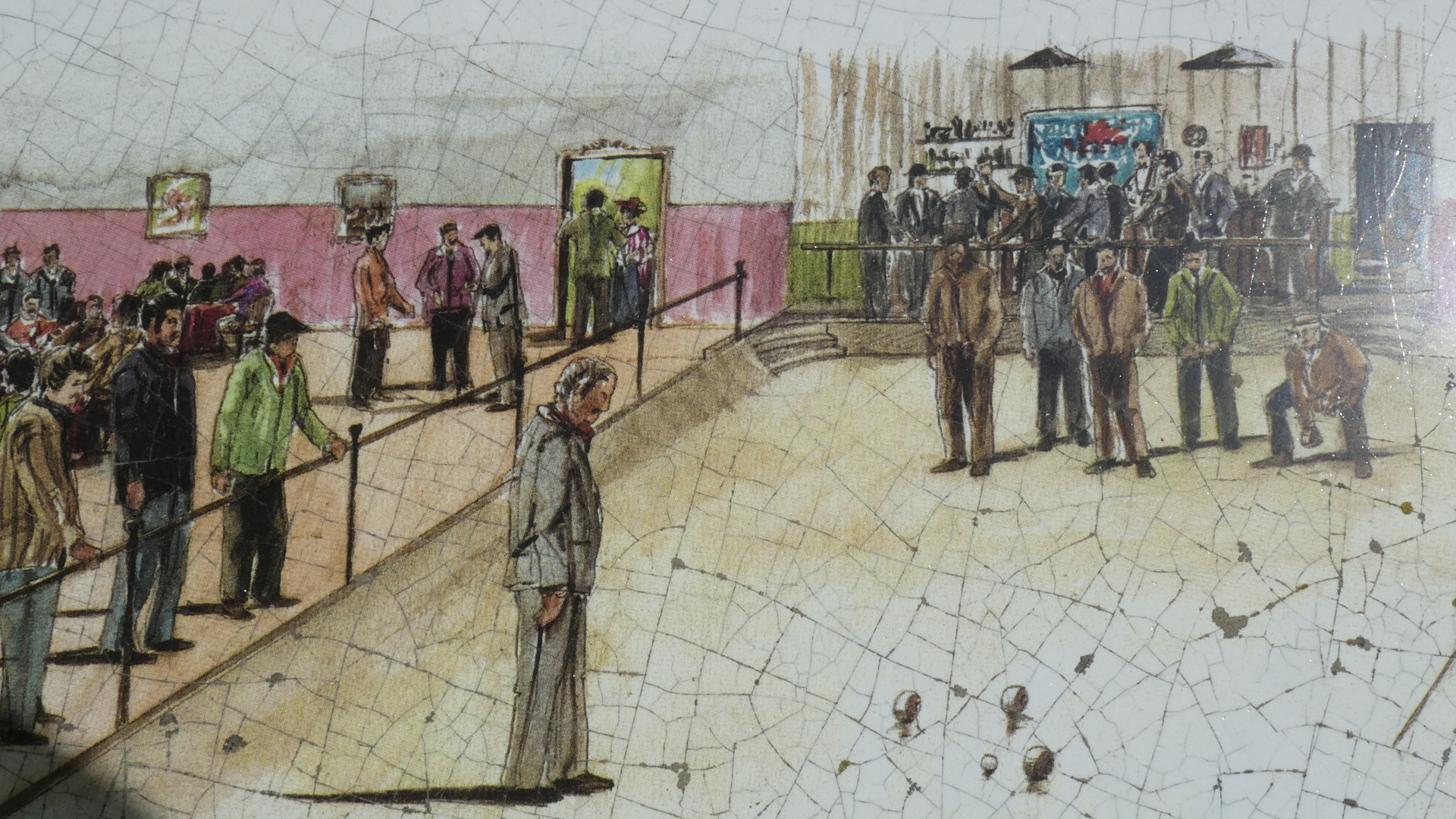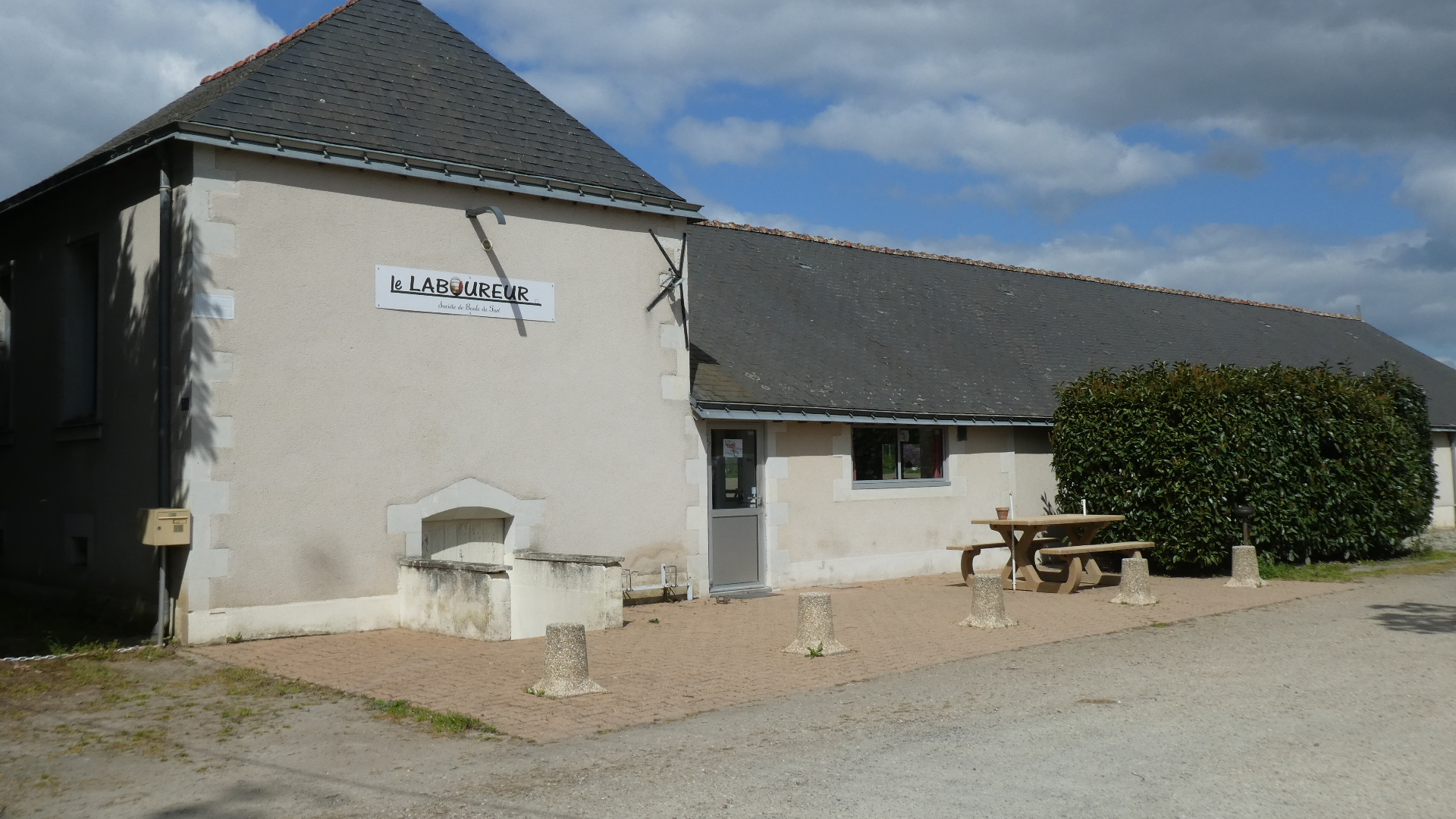 Next door was this hall, which is a site for Boule de Fort. We take this to be a form of Boules, the game of throwing balls, in a manner reminiscent of Curling. There are three halls like this in the neighbourhood. They used to be a men's domain, but have long since been opened up to all. The players belong to "societies". This hall is the home of the "Laboureur" society.