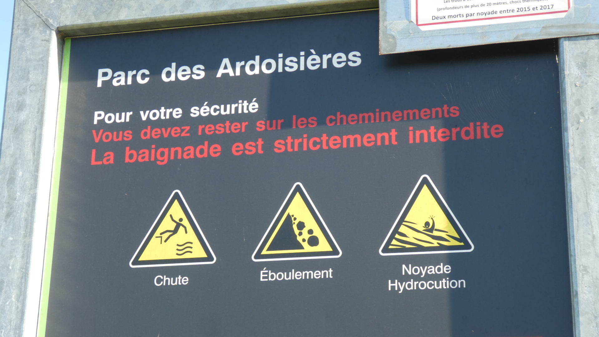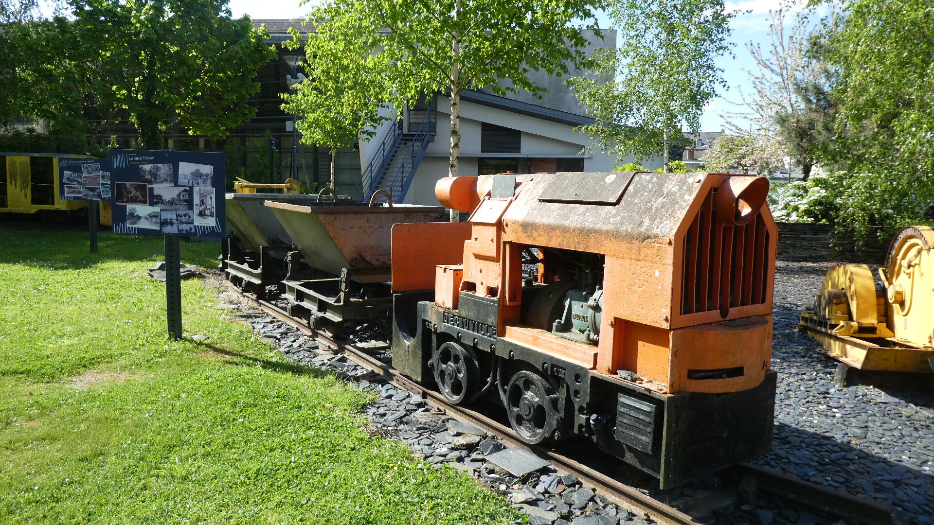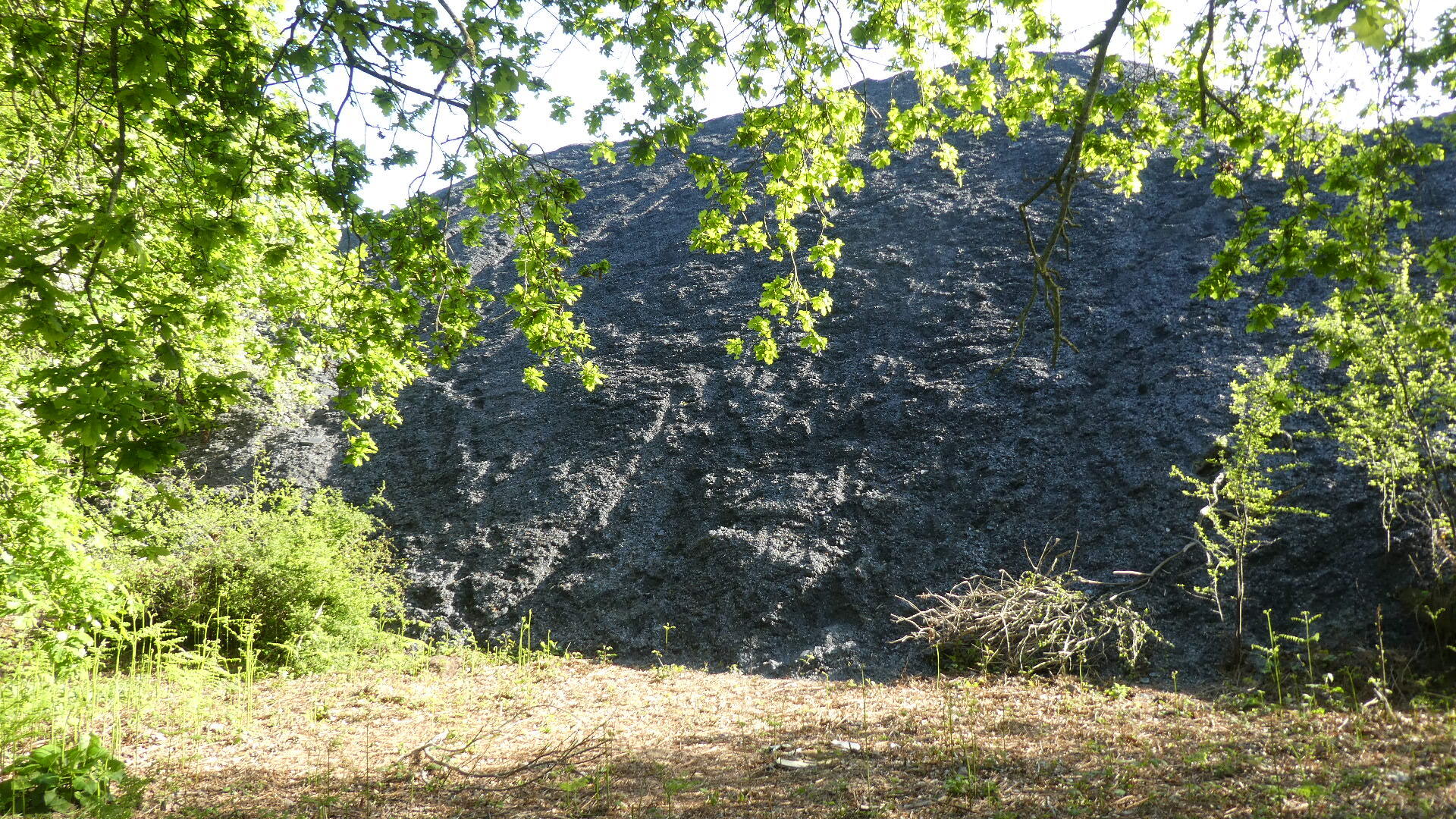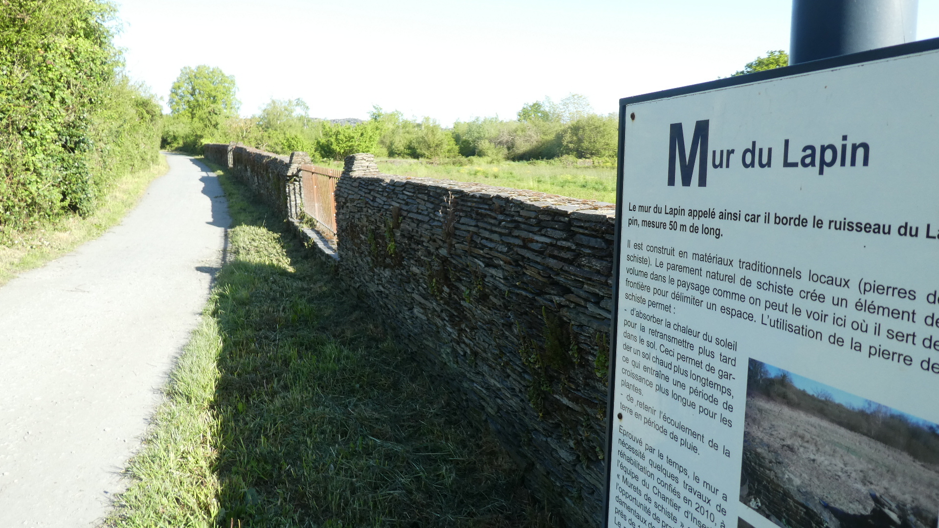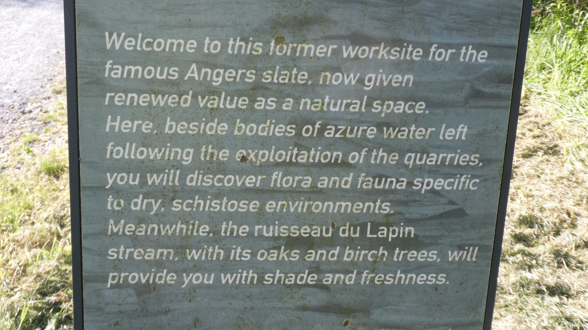 There was still a chance for the city to degenerate into car dealerships and box stores, and maybe it does, in some direction. But for us, within 4 km of downtown we were already at the entrance of the Ardoises park. What this is about is that a little southeast of Angers there were huge deposits of slate. From the 8th century this was used for walls and from the 11th for roofing. Extraction began in open air pits with manual methods, and progressed as steam and heavy equipment became available. The industry began to falter in the early 20th century, with competition from other building materials, such as clay tiles. By the 1970's, all the larger quarries had closed. However, as we have seen with other mining landscapes (such as coal around Leipzig), environmental restoration can turn moonscapes into valuable parks.