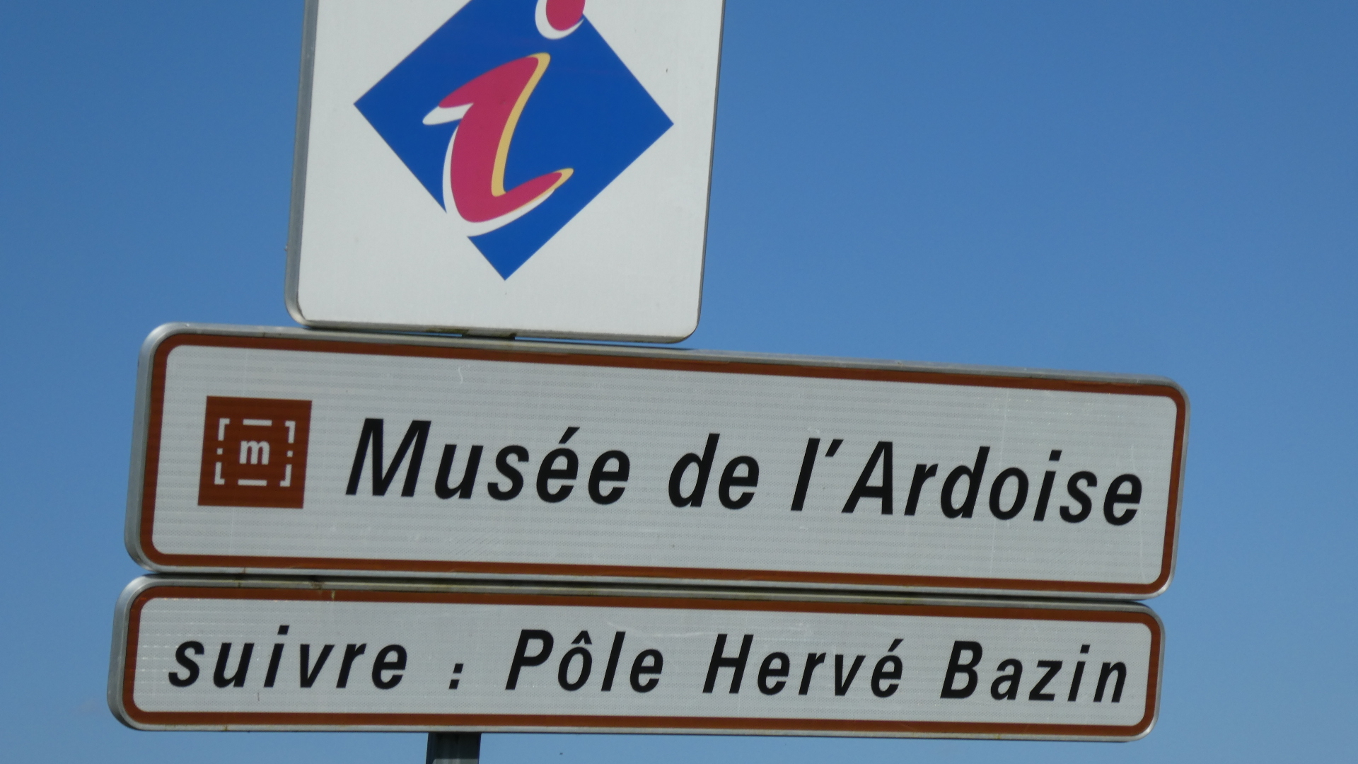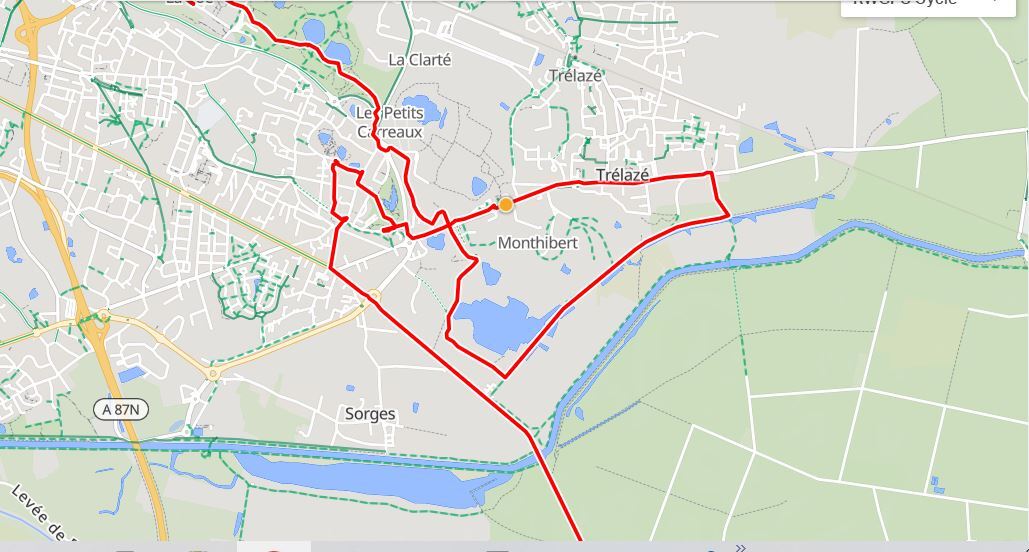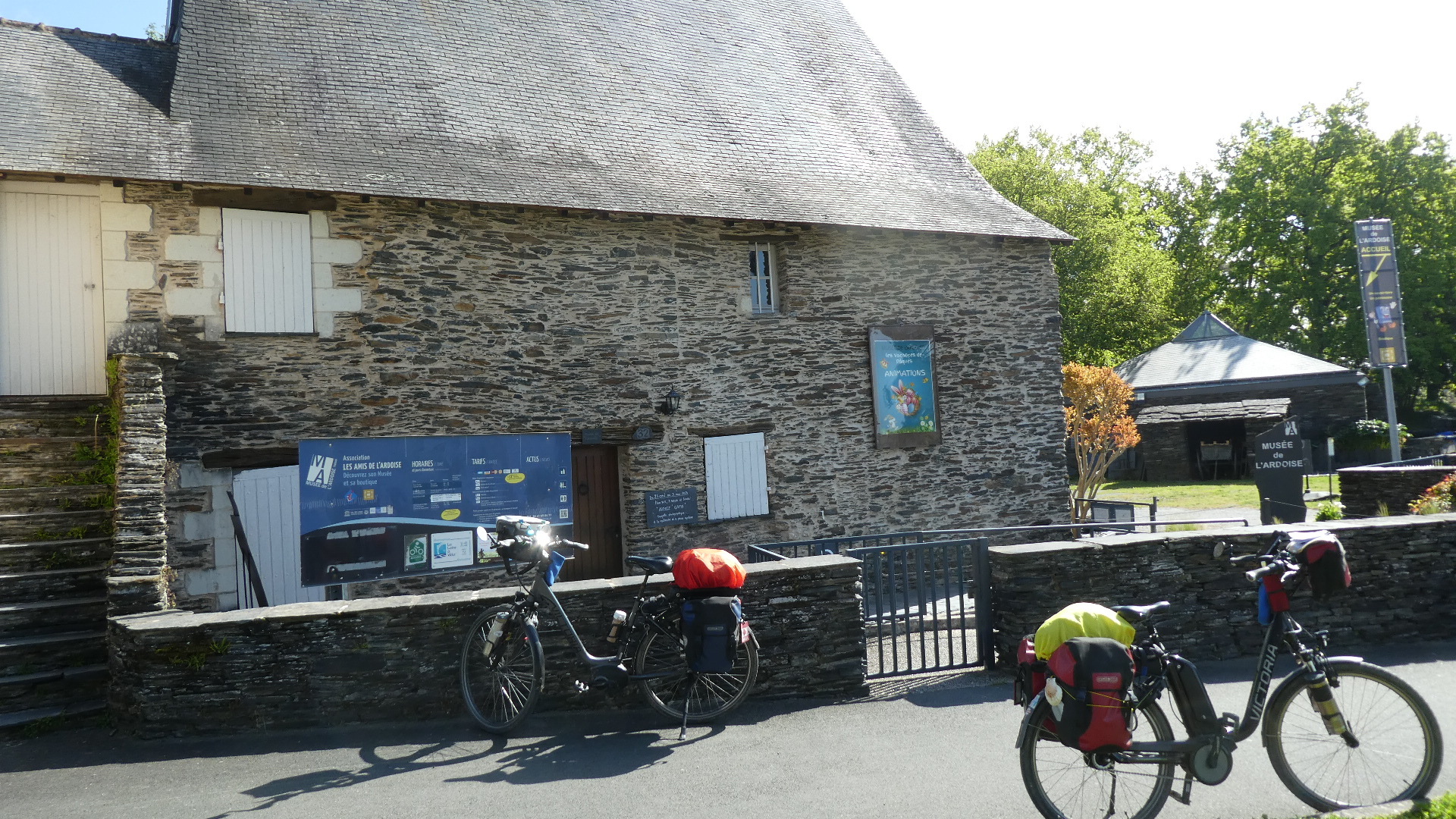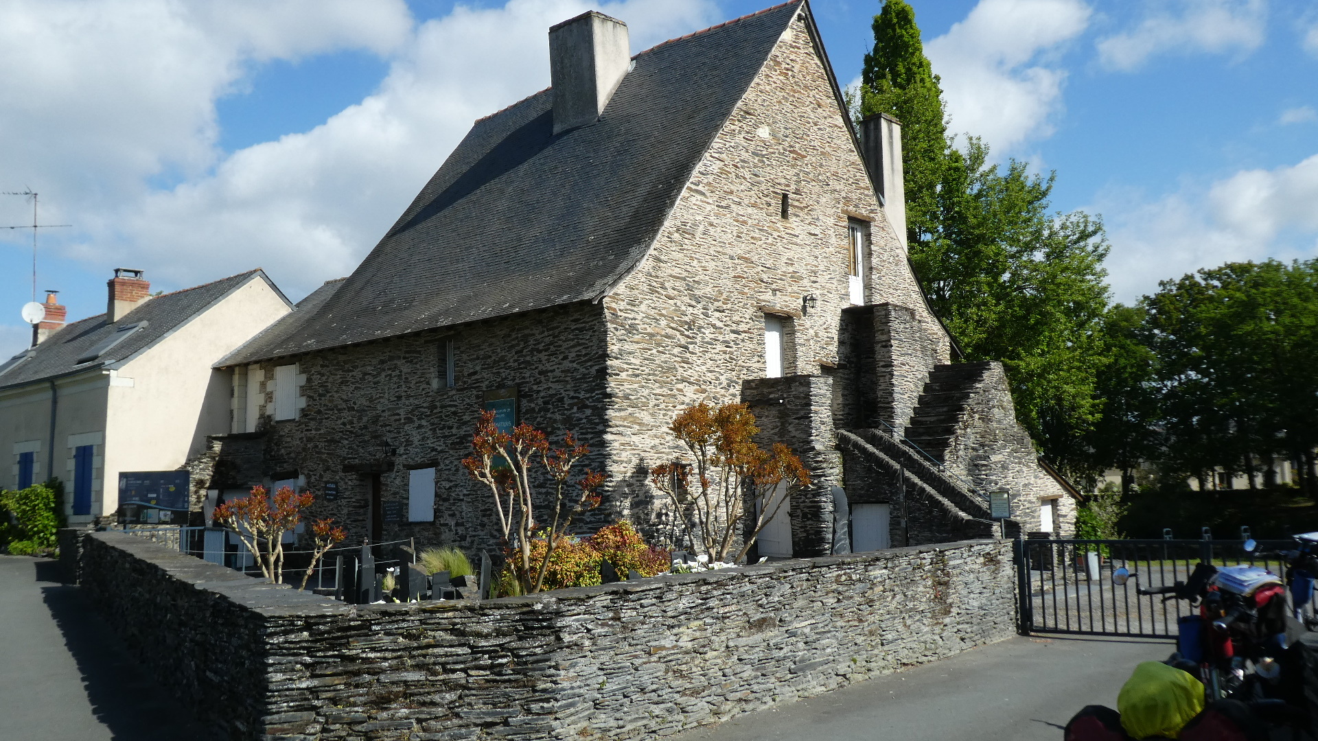 Once we were through the park, we had the ambition of visiting the slate museum, which we understood was in the nearby town of Trelaze. We had a track from the Tourism people that we thought would take us there, and we rather blindly followed it. If you look at the map below, you see us coming in from the upper left, through where it says "Les Petits Carreaux". Then we swing left around the big pond, and come to where a right, onto the dotted green, would have taken us to the Authion, and the little ferry. But on the way we met another cyclist, who stopped to tell us the ferry was not operating. La Dagueniere city hall strikes again. Nine years they've had to clean up their act!