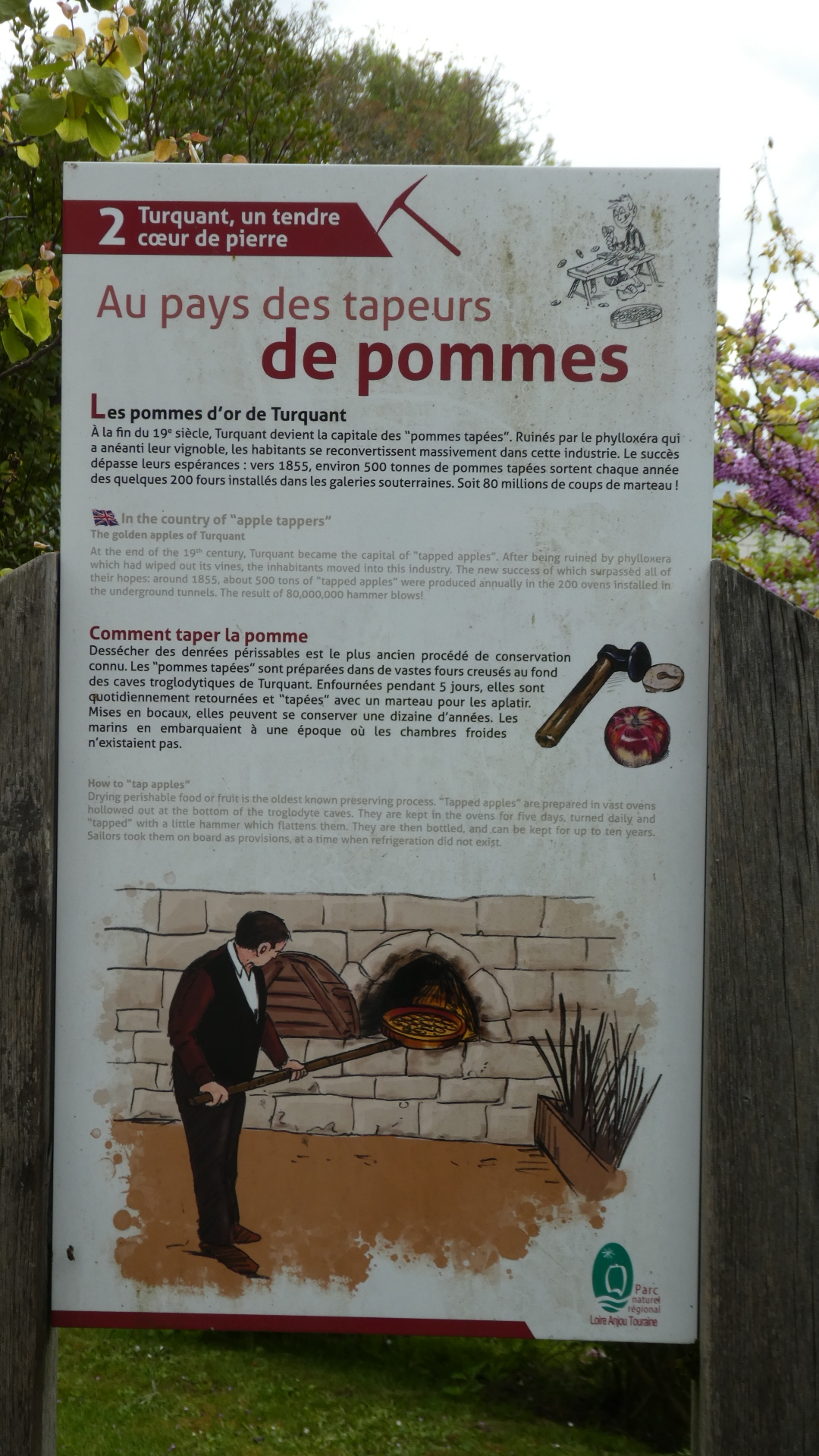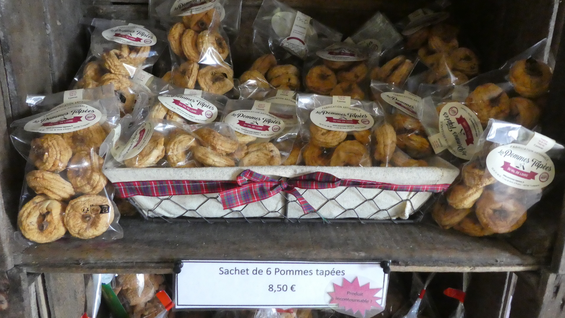 Among the artisans and restaurants burrowed into the ridge, was something that caught our attention and that we really enjoyed. This was a re-boot of an activity that had started in the 1860's. In 1863 the Grape Phylloxera, an insect pest, was introduced from North America, and wiped out the wine industry here. To stay afloat, farmers moved to apples, and developed a way to dehydrate them for better storage, and sales to sailors. The method involved putting whole apples in large tuffeau ovens at low heat for a span of days. Periodically the apples would be taken out and tapped flat with a hammer, resulting eventually with a dried apple disk. These "tapped apples" apparently were a big success.