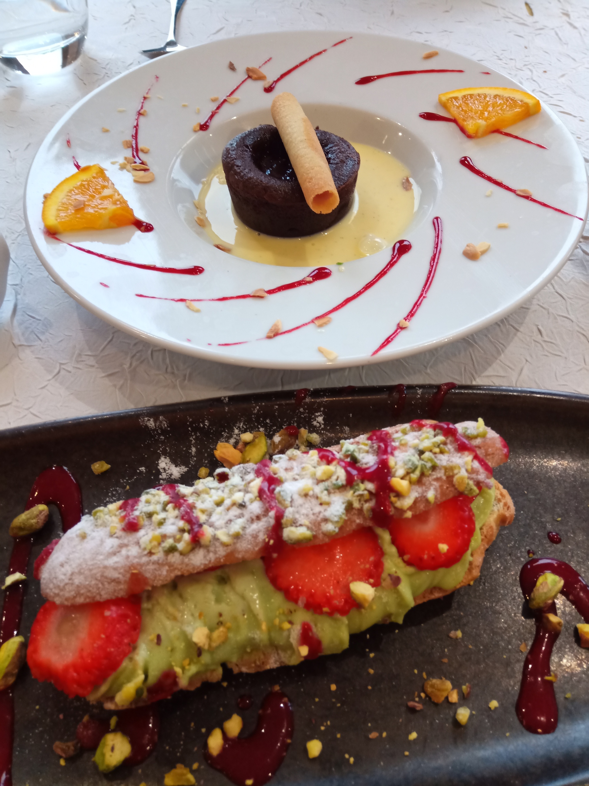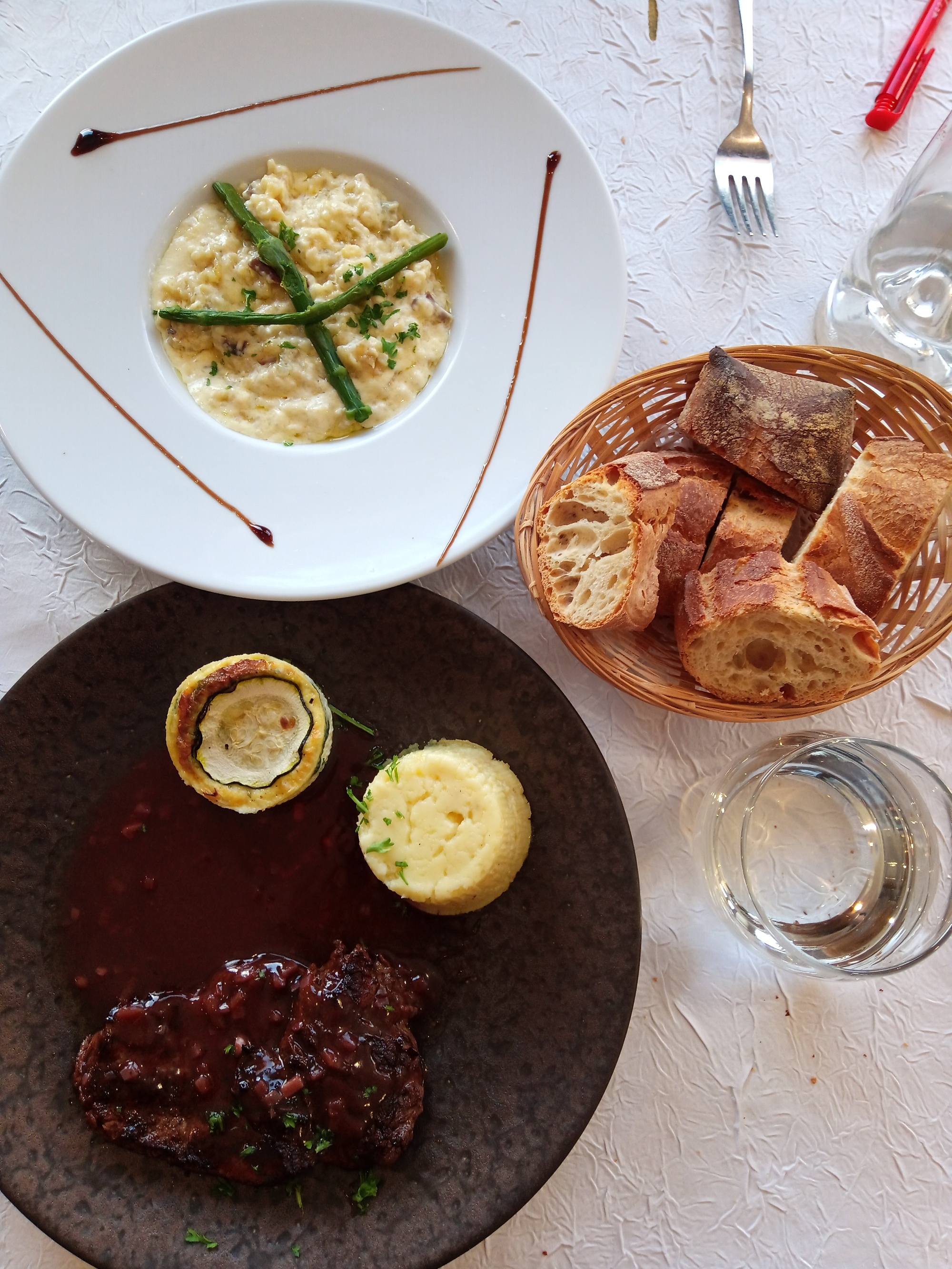 We are not big on restaurant meals, but after the long cold ride we decided to pass up the sandwiches and salad we had brought, and to dine at the hotel. The beef fillet was the choice I really wanted, but I have gambled and lost too many times, with it always coming from the kitchen raw, by my standards. I decided to gamble again, this time using a magic word given to me by Michel: carbonizé - i.e burnt to a crisp. This time it worked, and the steak came out just right. Flush with success, I tried to negotiate a full sized filter coffee. I came close - a small espresso with a pot of boiling water on the side. Not bad, we call that an Americano back home.