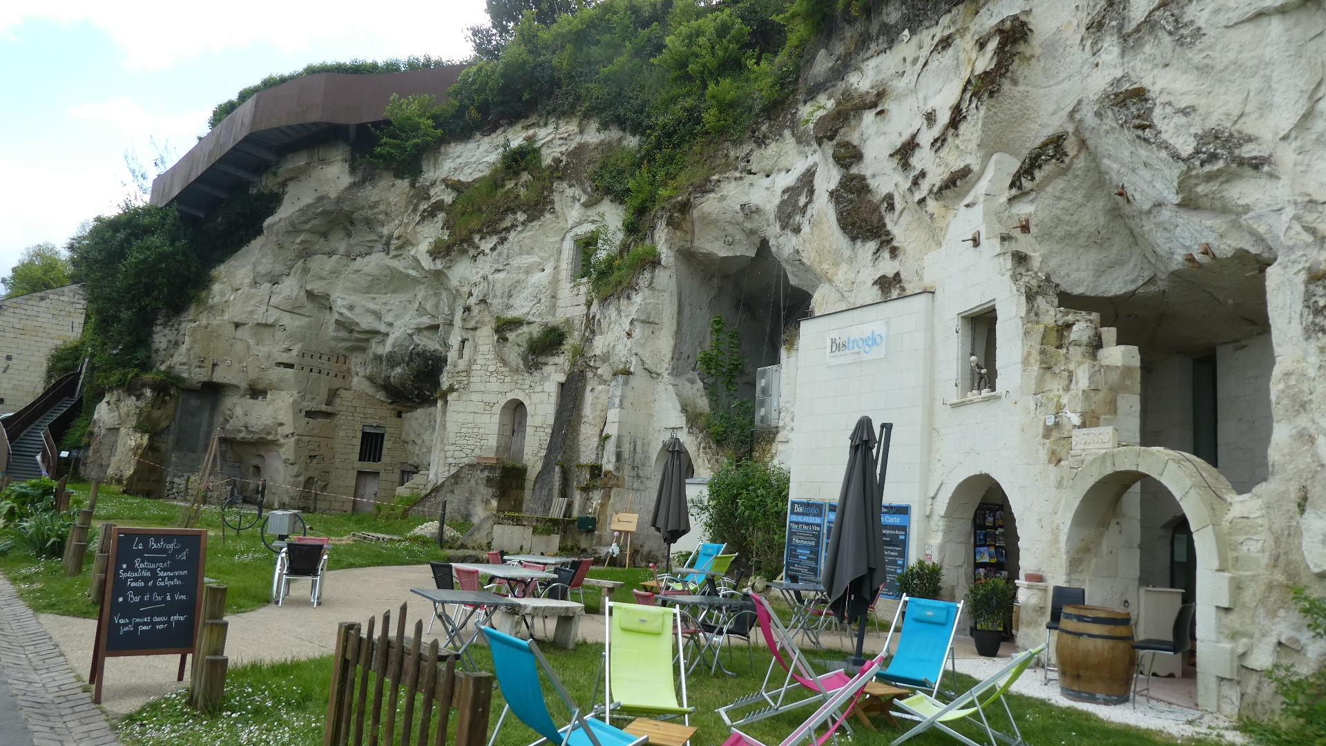 We passed innocently along the riverside, beside an island, and through nice forest - not a managed one this time, until we came to something we knew about, but had not appreciated the extent of before. That is the tuffeau cliff side - troglodyte ride, through Turquant and to Candes - St Martin, where the Vienne river joins the Loire. These 20 km or so offer many views of homes and facilities built into the cliffside, beautiful houses, buildings, and churches made of the tuffeau, troglodyte restaurants, and places adopted by all sorts of crafters and artisans.