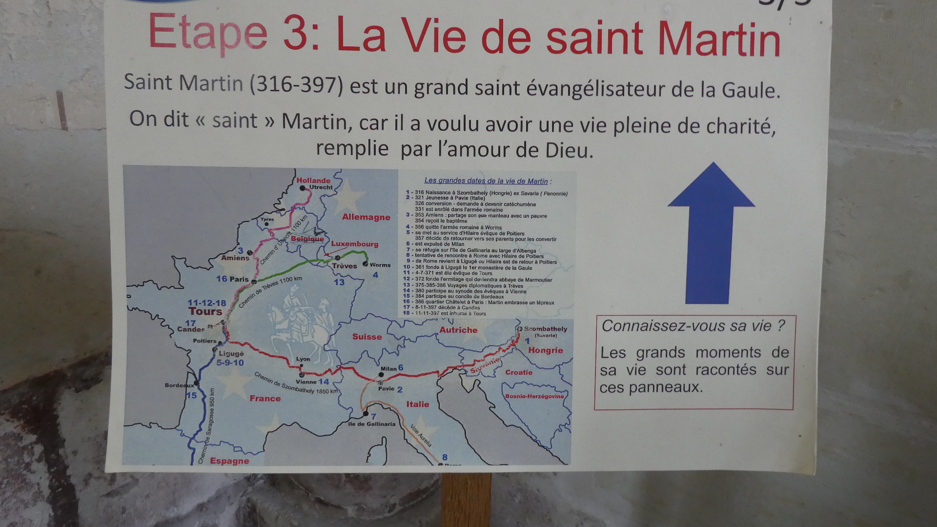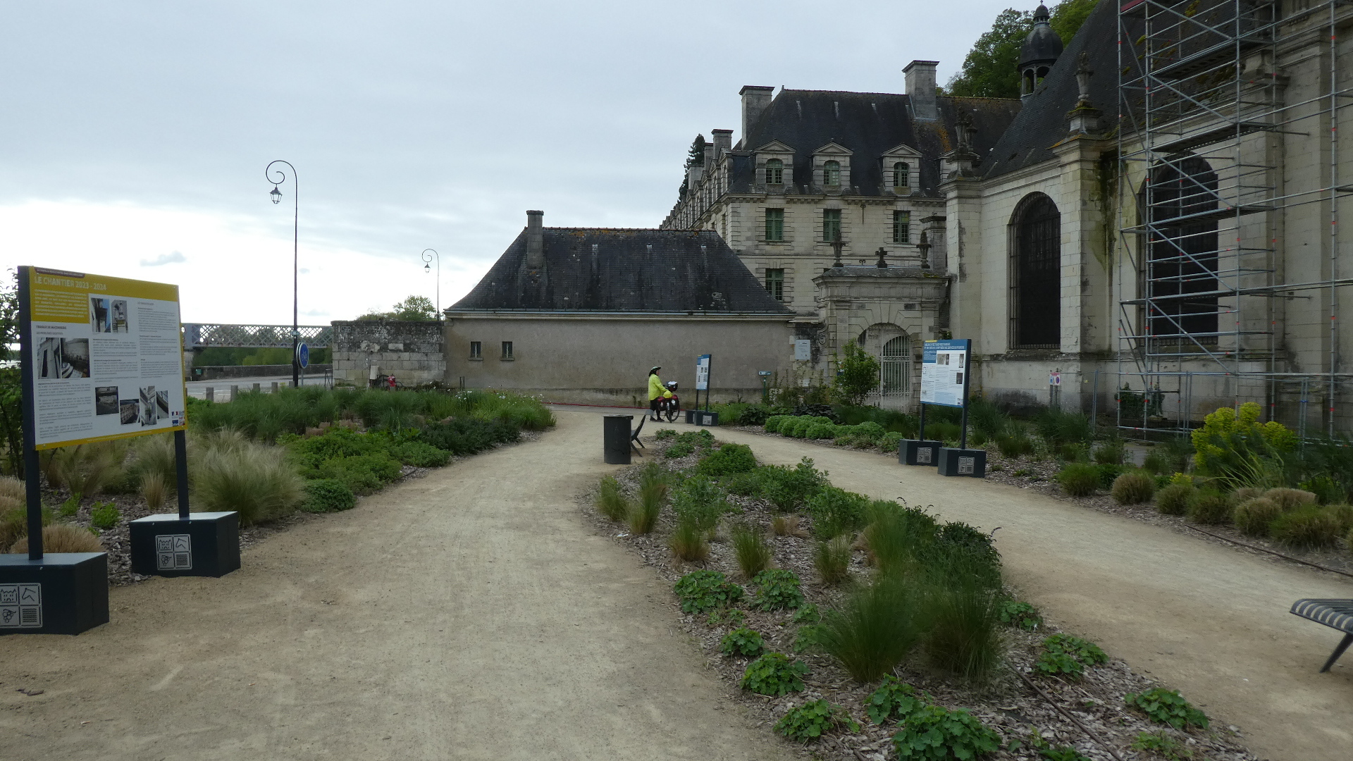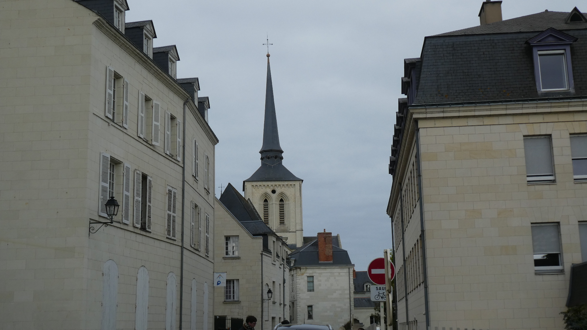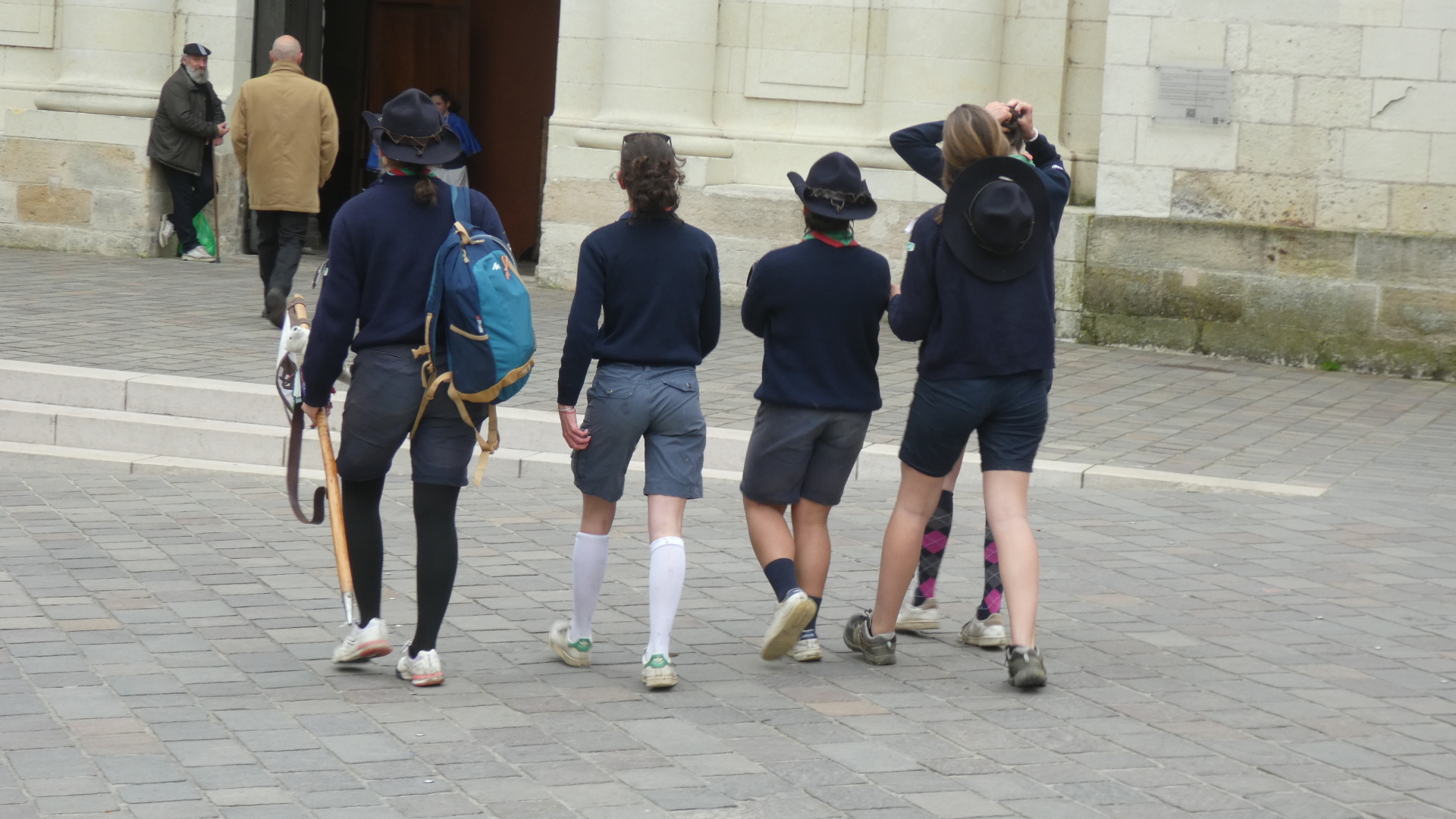 Our way passed the St Pierre church, where we were surprised to see many people flooding in for what would be a Sunday service. Among these was a group of cyclists, that we had seen yesterday outside Angers. I recognized them from the sort of sceptre one was carrying. I went over and asked them about it. They were Scouts, on an overnight trip out of Angers.