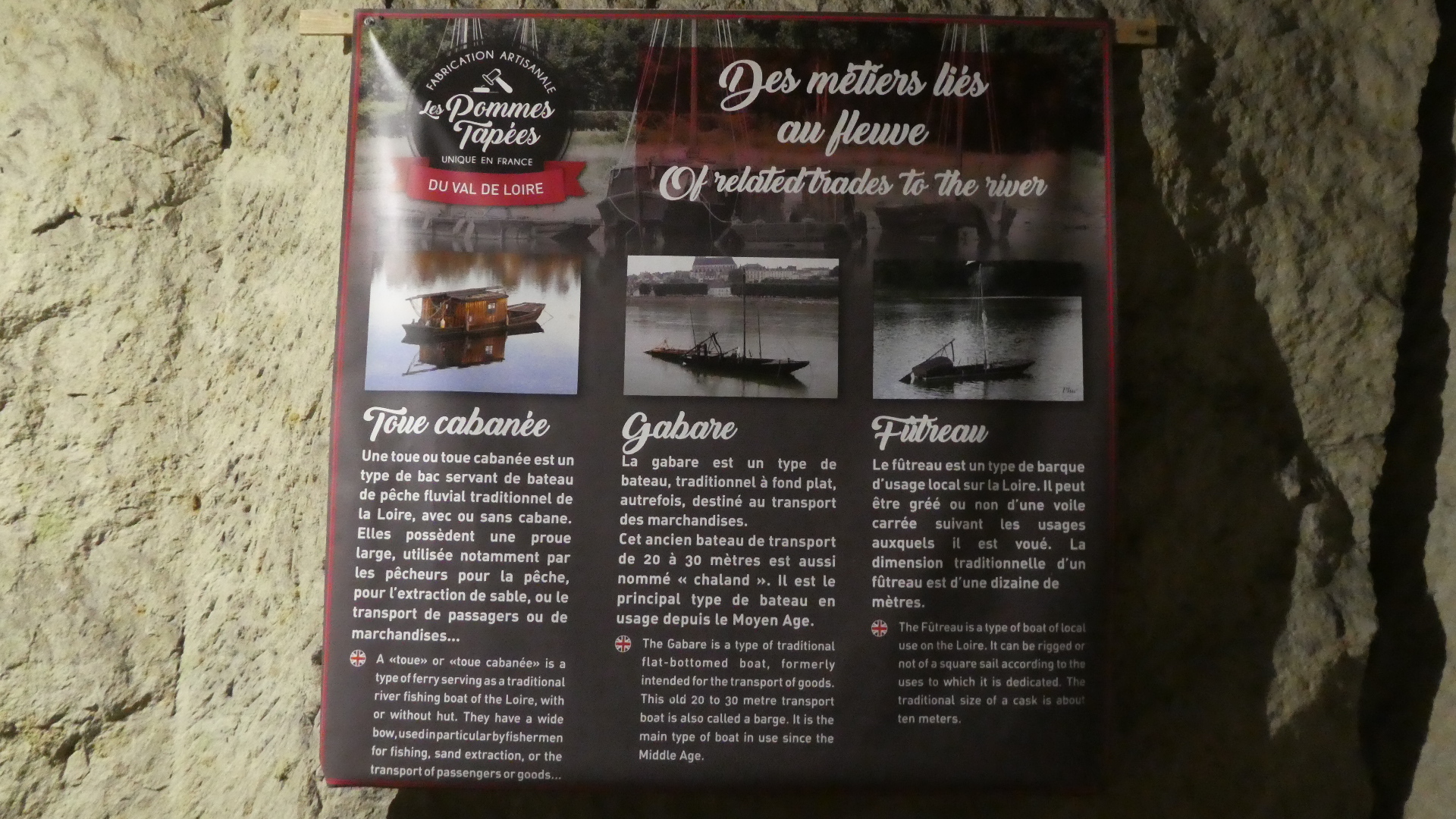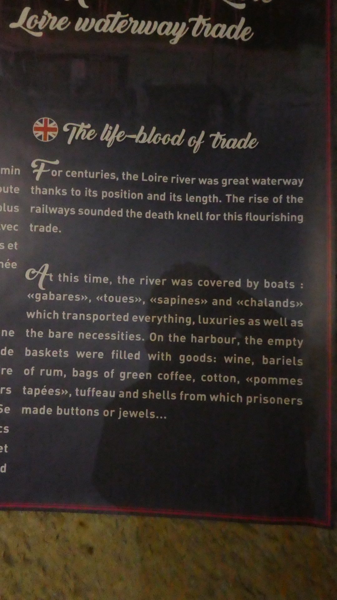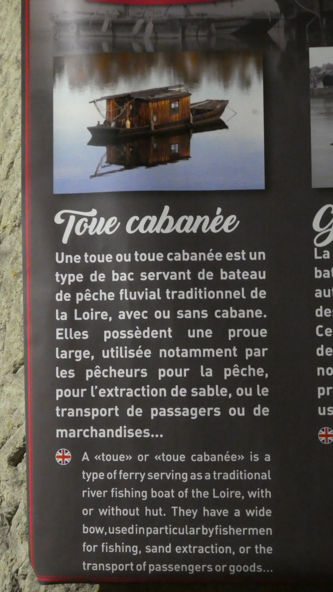 Another side display discussed the extensive trade along the river. Three types of boats were used. One, the Toue Cabanee, was described by Michel as such from a photo we took the other day, on the river.
