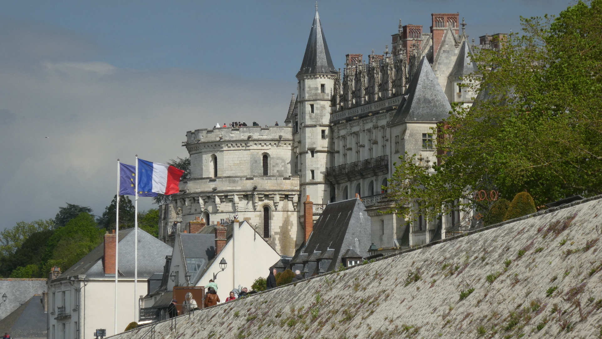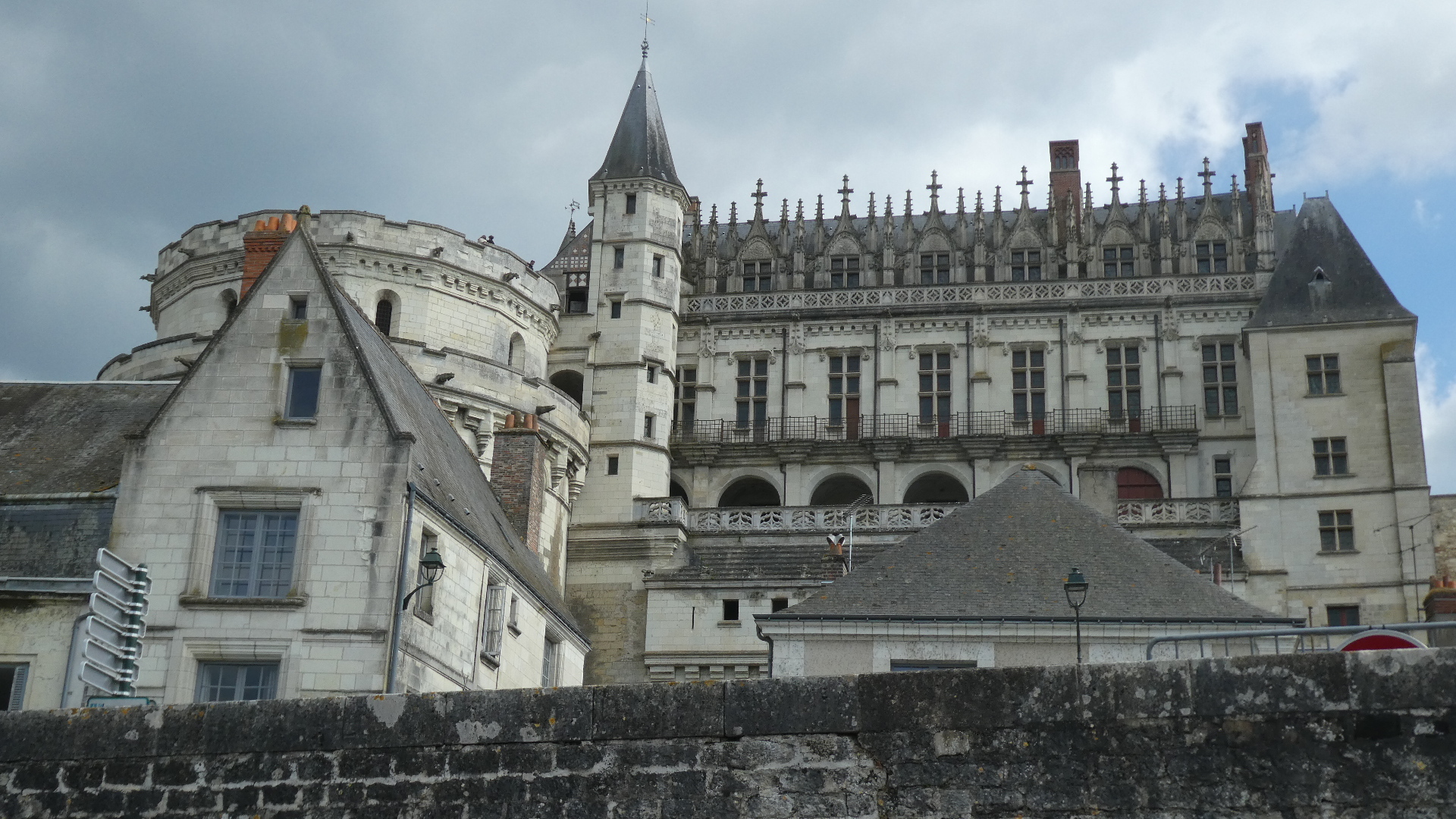 Soon we rolled under Amboise Chateau. Amboise Chateau has a very long history, starting about the 9th century. But in 1431 it was grabbed by the French monarchy (Charles VII), beginning a long history as a royal residence. The most famous period was when Francois I (1494-1547), who was raised there, imported an aging Leonardo da Vinci to live at very nearby Clos Luce in 1515. Leonardo died there in 1519. He was buried at the Chateau, but following the Revolution there is some doubt about where his bones ended up. The consensus is that he is at the Chapel of St Hubert, inside the Chateau.