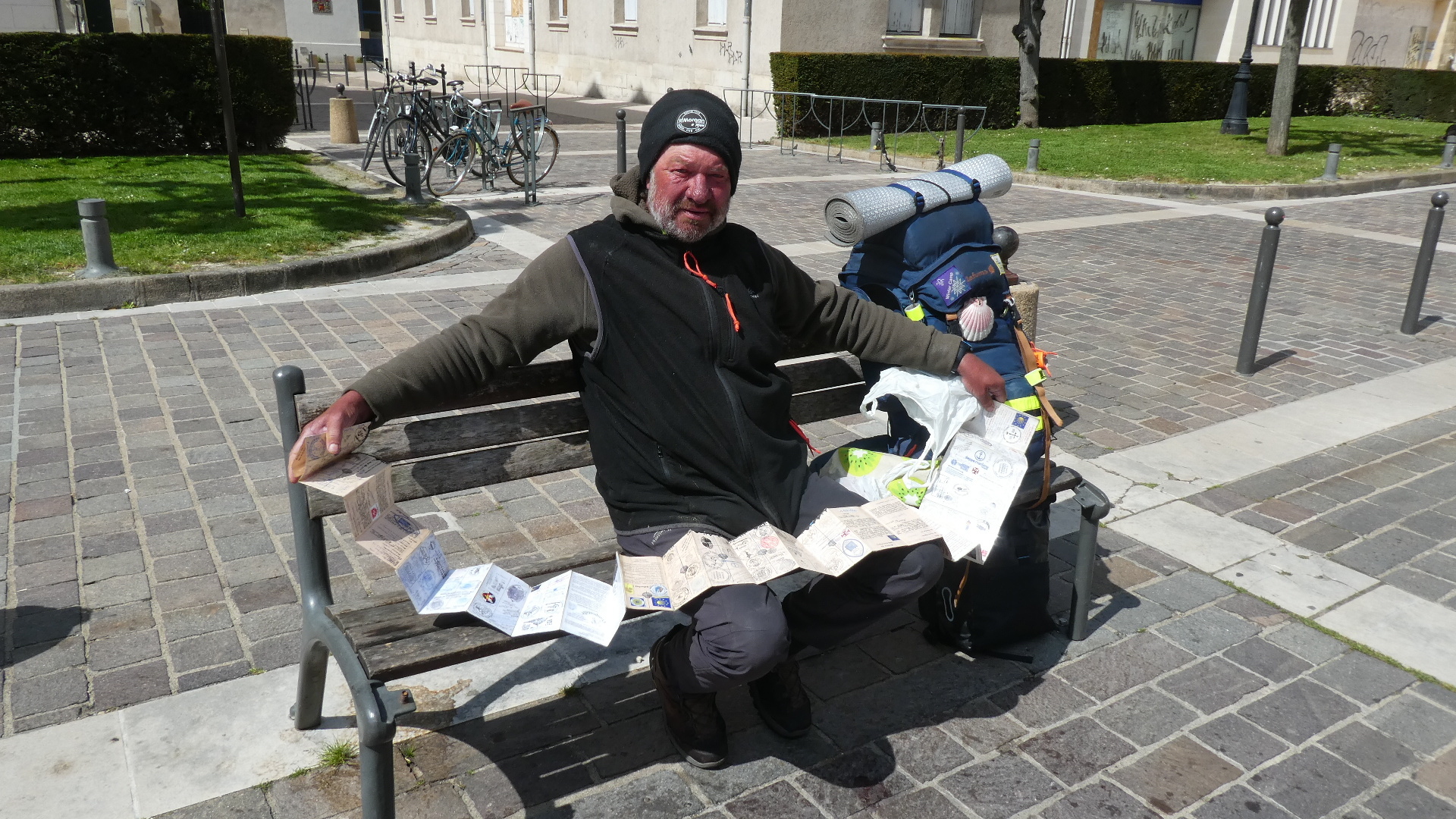 The other was a fellow on the next bench, who asked me to watch his pack while he went to the nearby washrooms. We had already established that he, like us, was returning from St Jacques Compostelle. But as he returned, walking toward me, I noticed that he walked with difficulty. I asked him if he always had that difficulty or if the Chemin St. Jacques had wrecked his legs. The answer was surprising. He was from Belgium, and had already walked 20 km beyond Tours on the way home, when he was struck down by Lyme disease. He had just spent three weeks in hospital here, but both legs were swollen to the knee. The hospital stay had cost a lot of money (not sure why, since Belgium and France are of course both in the EU) and he was now broke and hungry. He had slept last night on the cathedral steps. He did however have a friend coming down from Belgium tomorrow to do a rescue. I dug out some cash from my belt and encouraged him to go find some food. And Dodie found some packaged baked goods .in our bag, to give him a boost right now. Interestingly this man was a fisher on the North Sea, typically catching shrimp. First North Sea Belgian shrimp fisher we have met! Given that background, we might have expected the man to speak Flemish, but he spoke to us in French. Maybe he knew both.