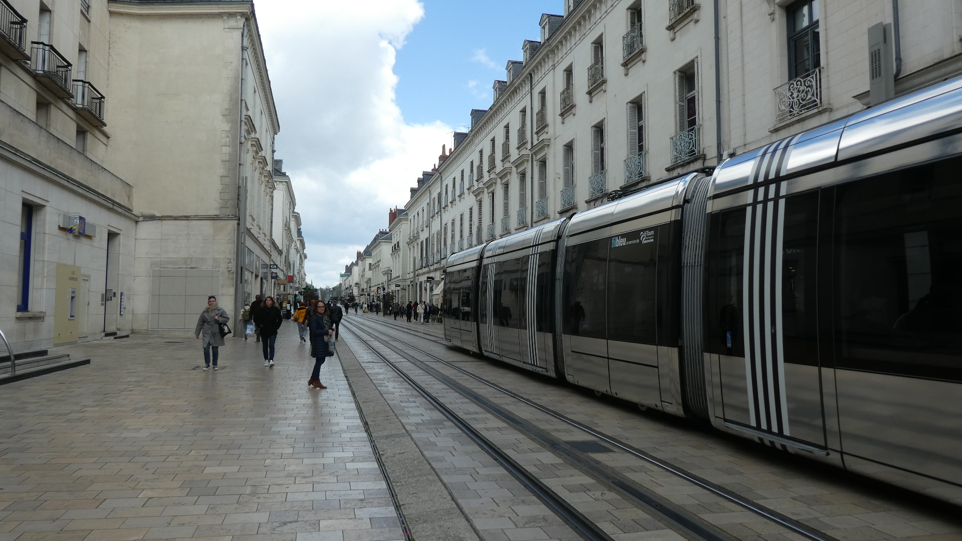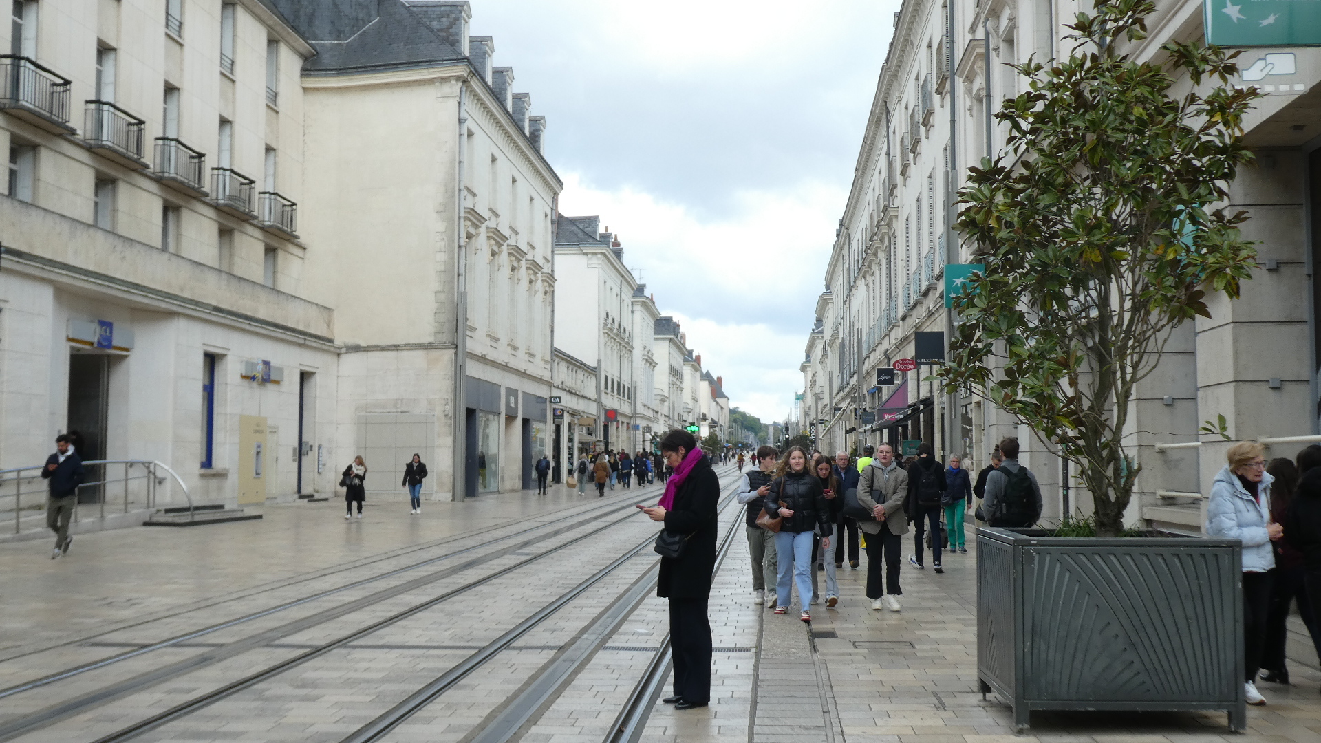 Next we came to a main pedestrian street. This is the one with the big name or posh stores, but it had a major flaw. The entire street was taken up with tramway tracks, and these were real ones, in use. As a result, the people might stray off the sides, but periodically they would be swept away by trams. Not such relaxing shopping!