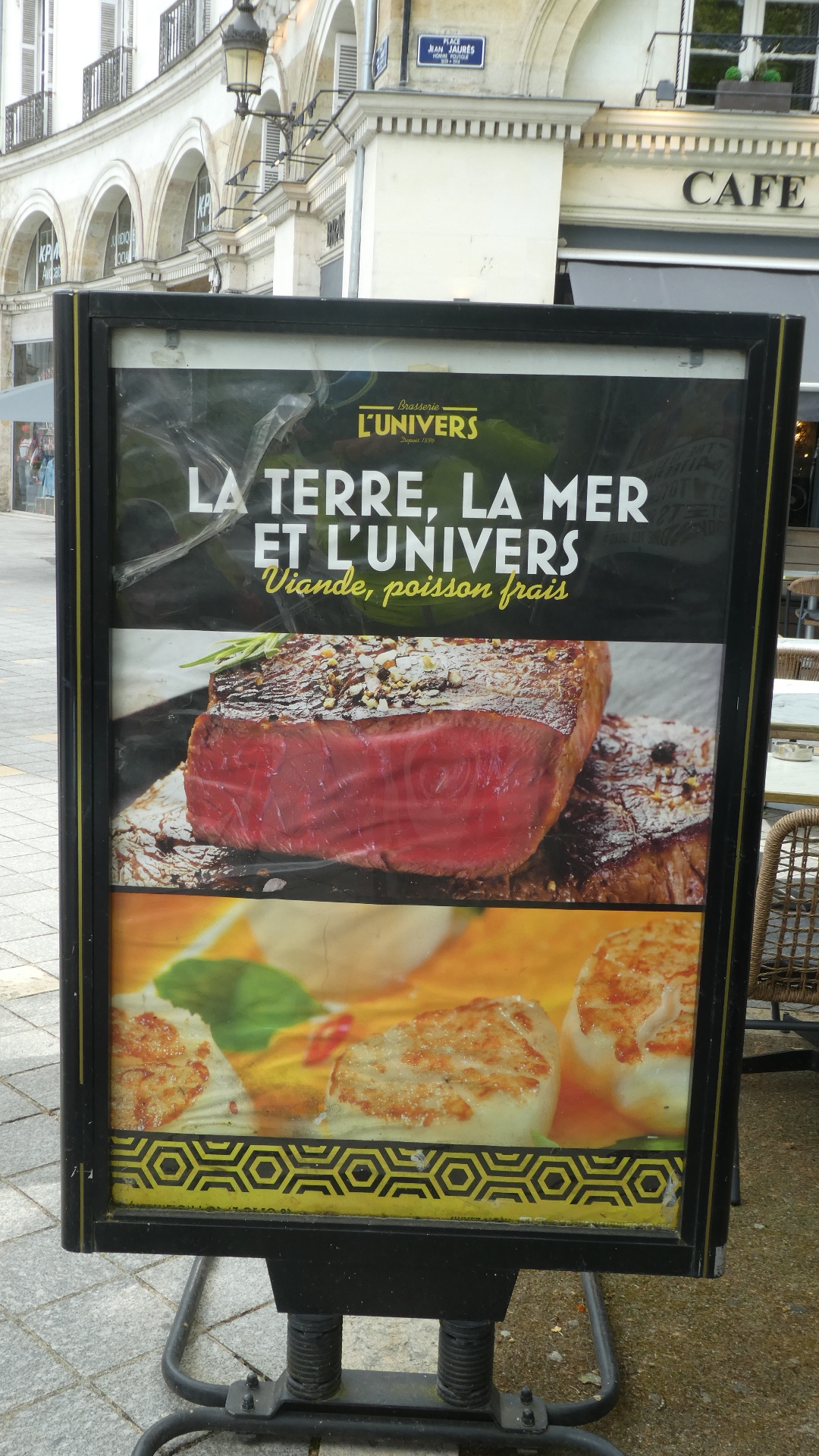 Standing opposite the Hotel de Ville to take my photo, I was beside the Cafe l'Univers, and their sign intended to entice me to come in for a steak. I don't think my magic word "carbonisé" would even work for this one!