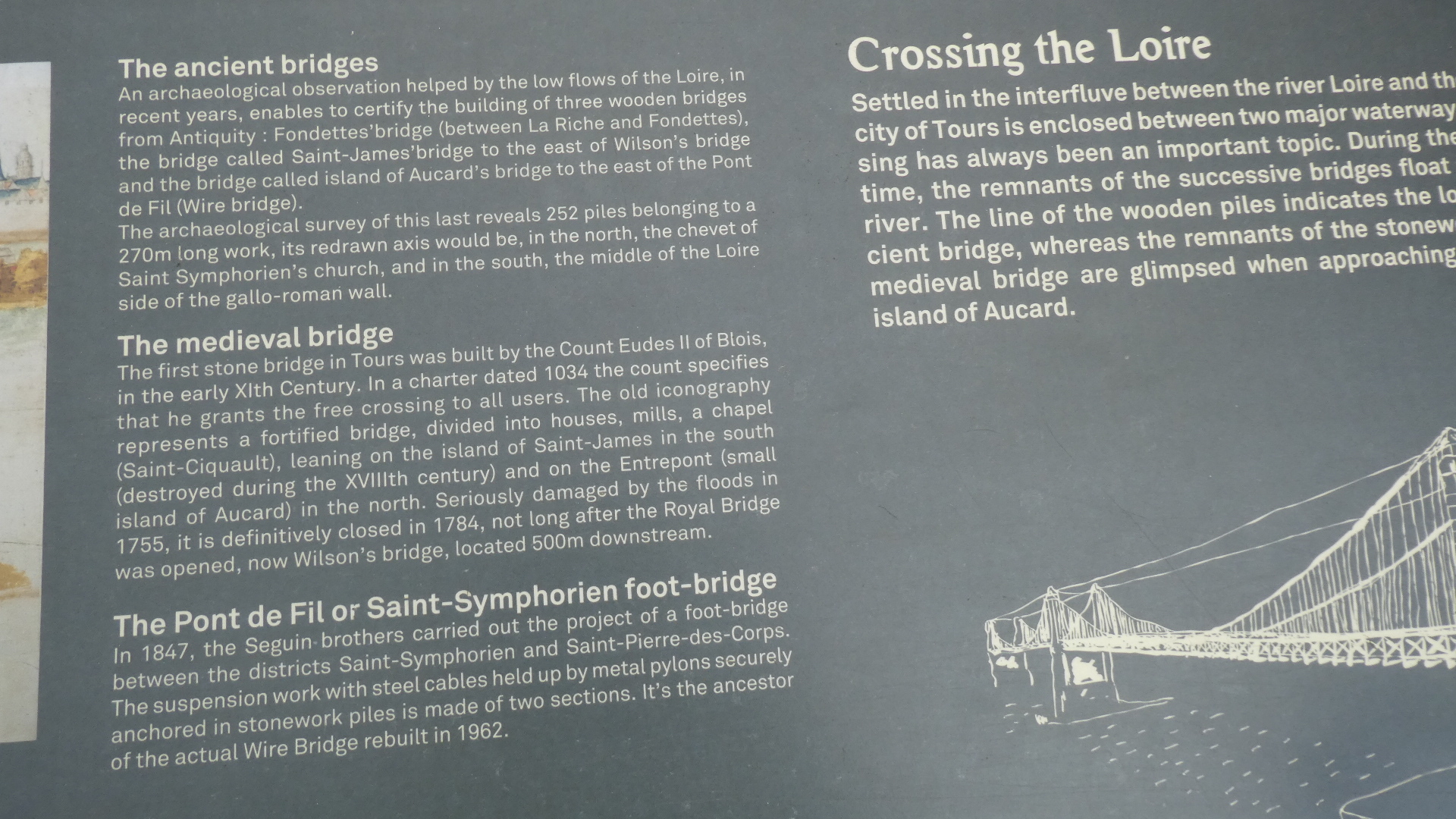 We were already on the correct side of the Loire for Amboise, and so did not have to cross. But there is always a chance to find a medievsl bridge to photograph. Opposite the Saint Symphorien passerelle, there was a sign setting out the chances of find a medieval bridge here. The answer was that we were too late, the bridge having been closed in 1784. The replacement, the Wilson Bridge was opened shortly thereafter, says the sign reproduced below. But the Wilson was already behind us, so all we have is the rather lame passerelle. It was built in 1847, but has had some destruction and reconstruction since.