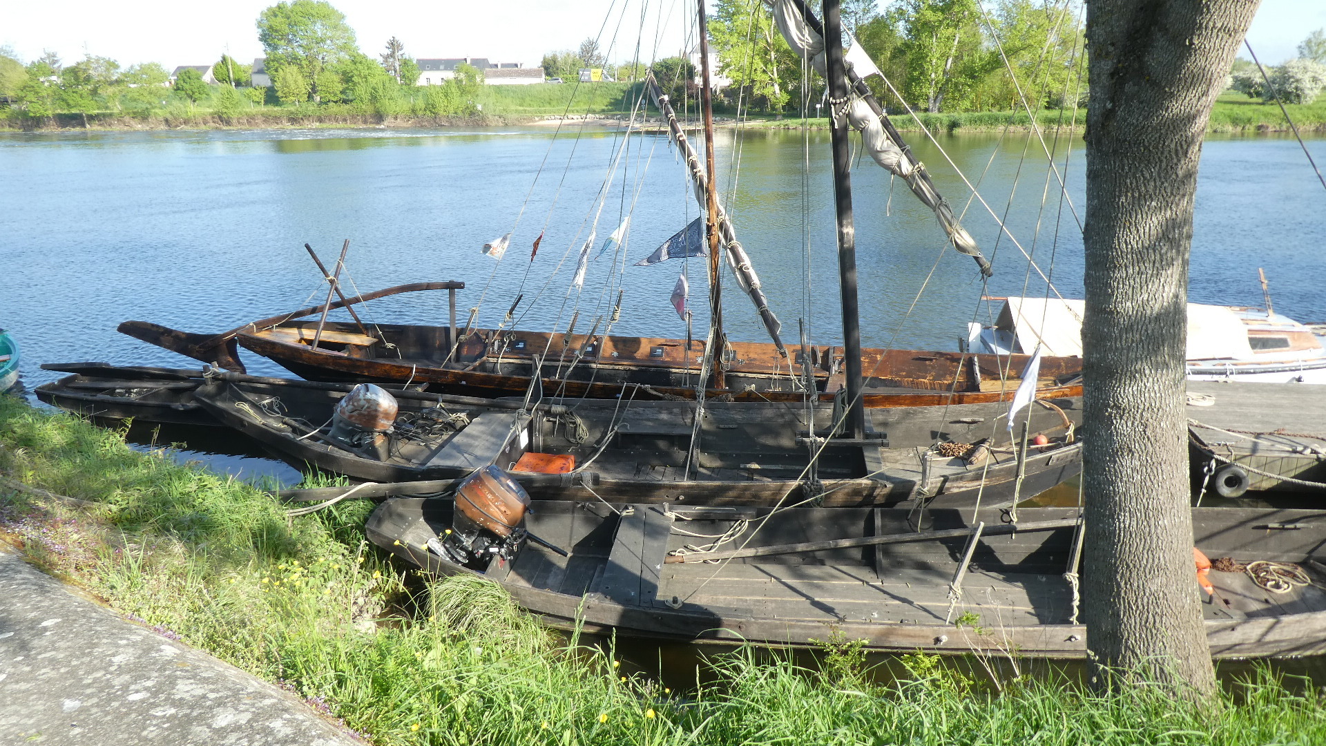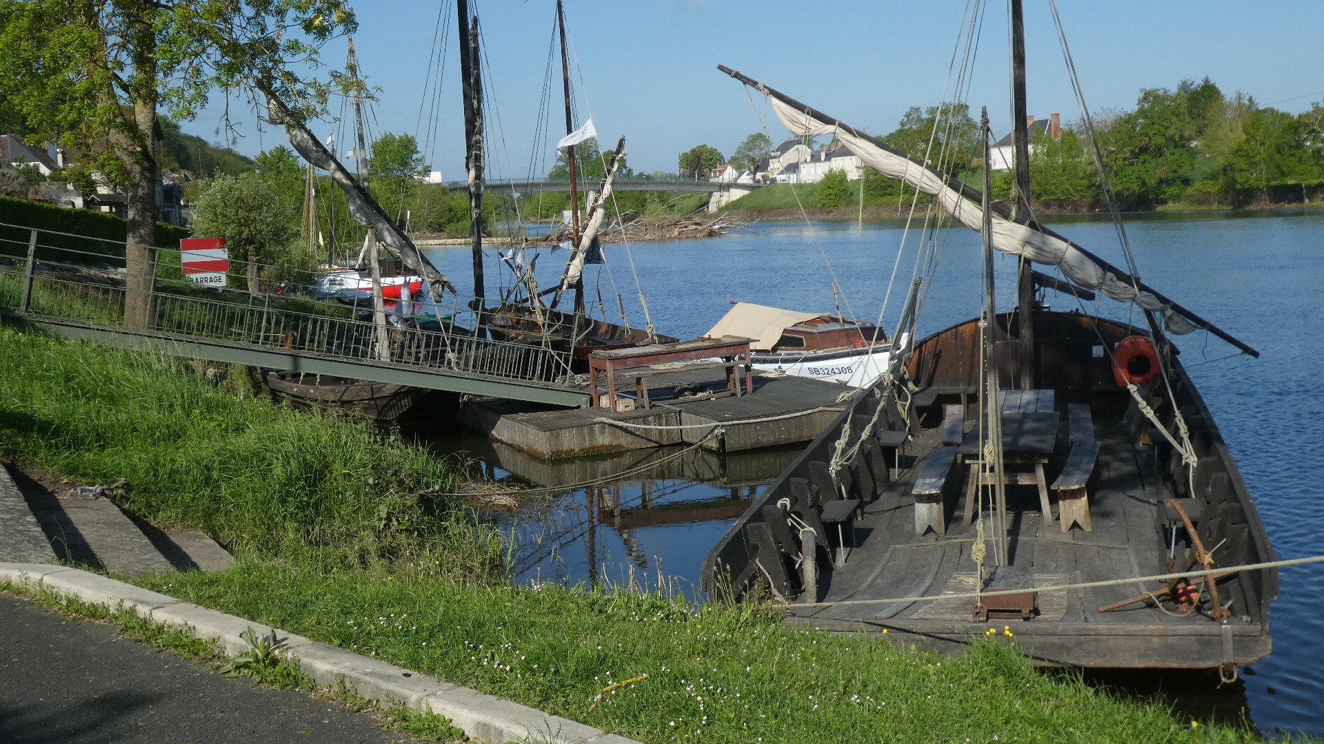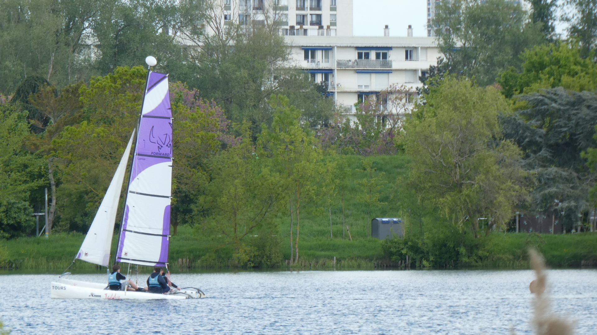 Just before Tours there is a further lake, off the Cher river, in the Parc de la Bergeonnerie, with a sailing club on it. That's how we could see a colourful sailboat and some city type buildings behind.