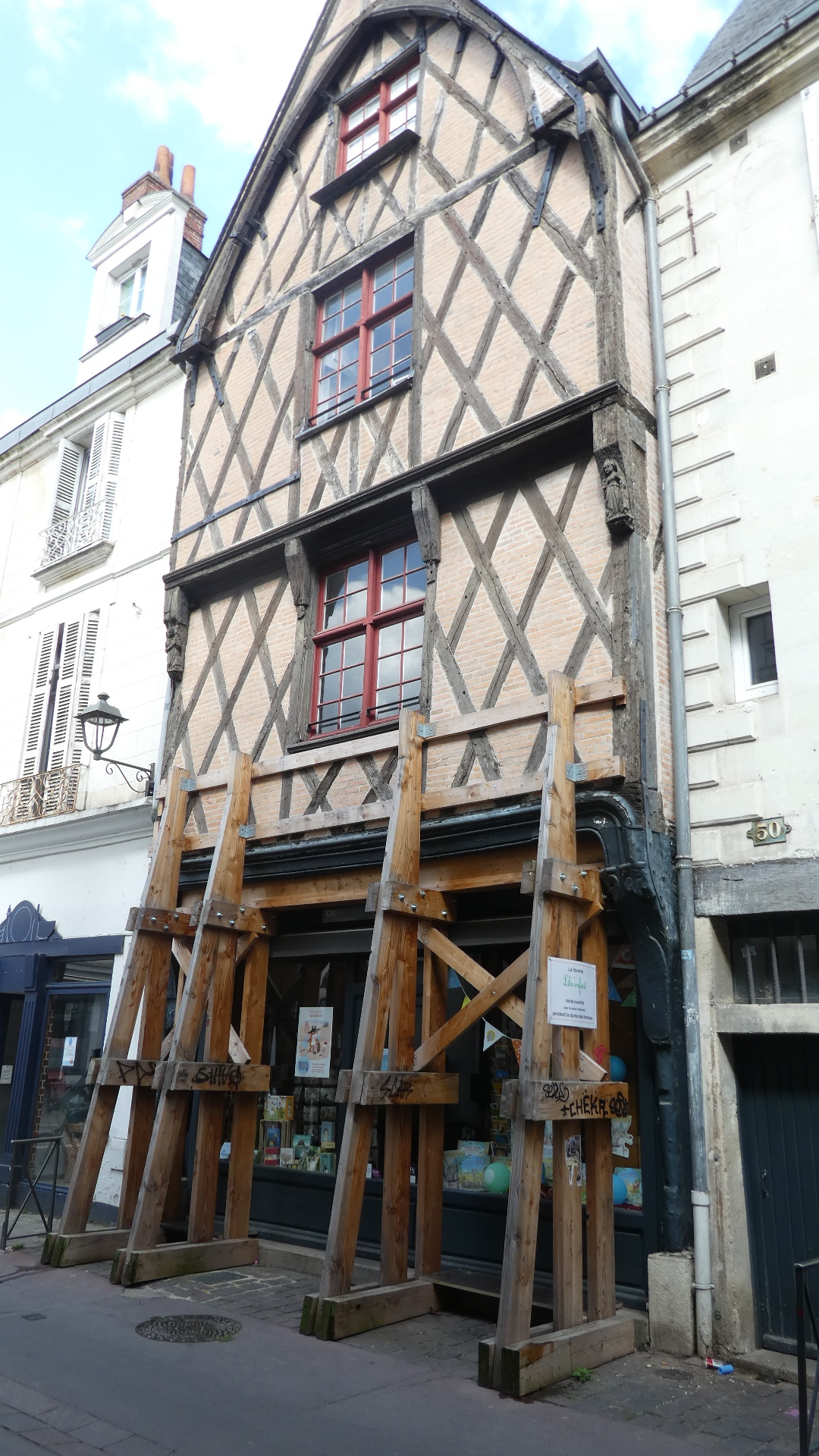 We finally took a turn, and entered what must have been the true old town. For example, here (below) was a fachwerk house, being held up by supports.