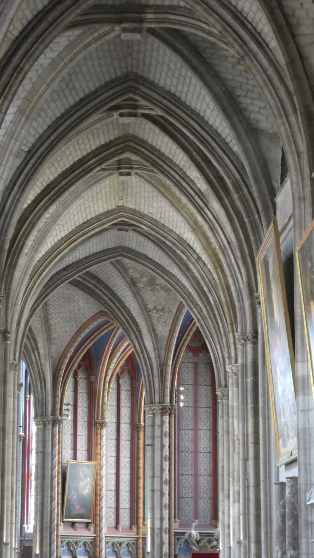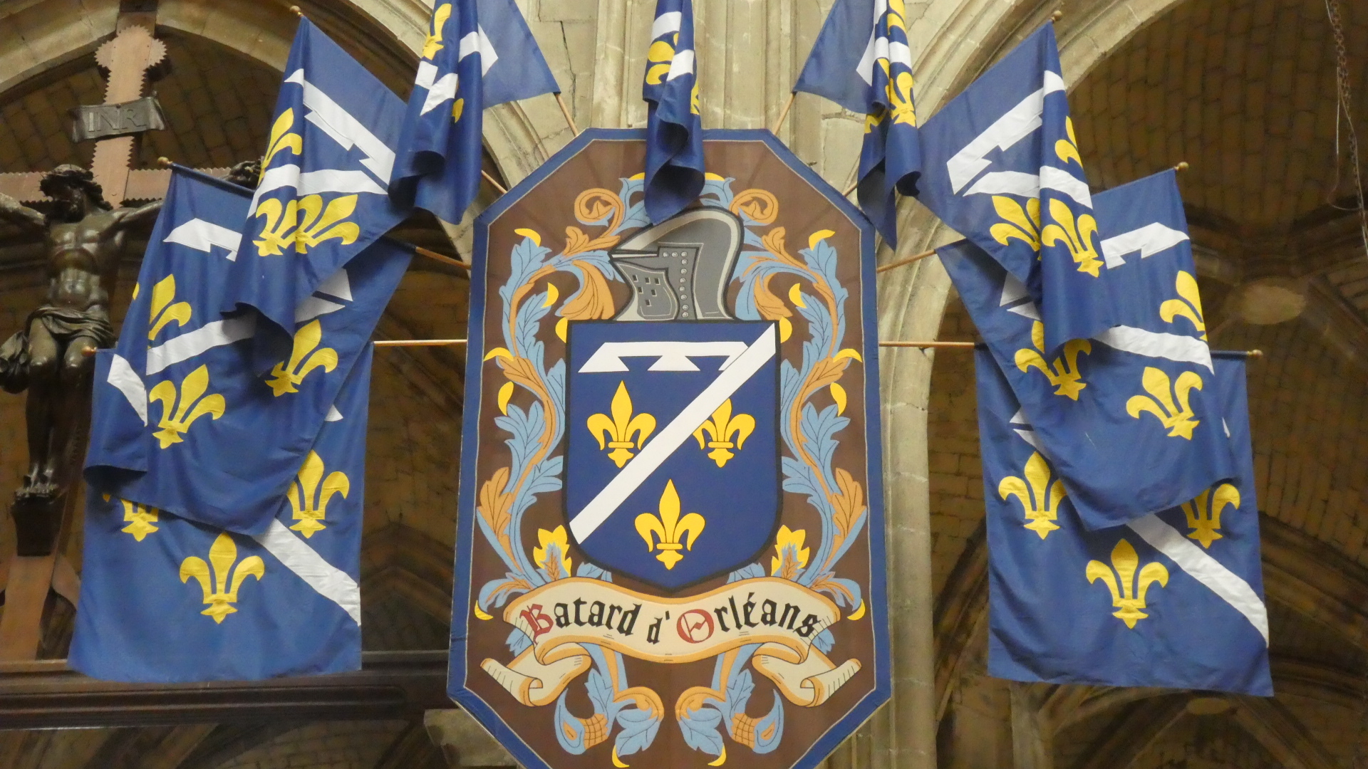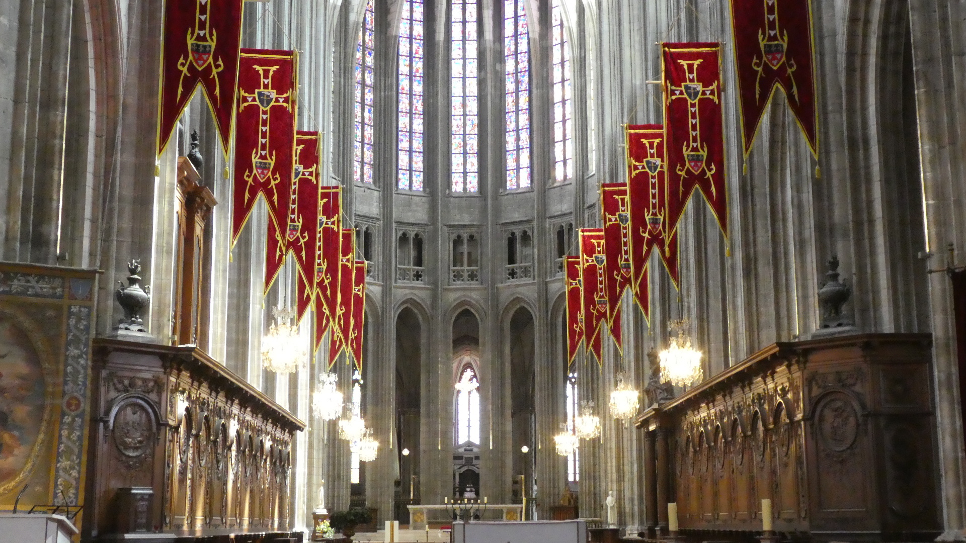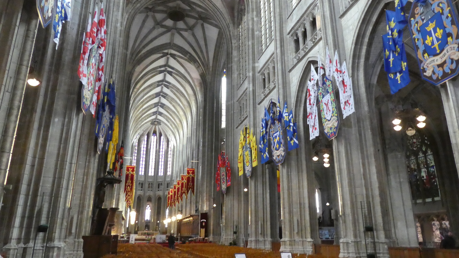 We have been inside a lot of churches and cathedrals by now, and risk becoming "churched out". But Orleans cathedral really was special. It had the tall arches, of course, but also coupled this with colourful flags, and with colourful stained glass, particularly ten huge panels telling the story of Jeanne d'Arc. To this was also added colourful decoration of the columns, and very nice carving in the choir. The whole effect was rather gay, and not at all like some of the cold, gray, and plain, if huge, spaces we have been in.