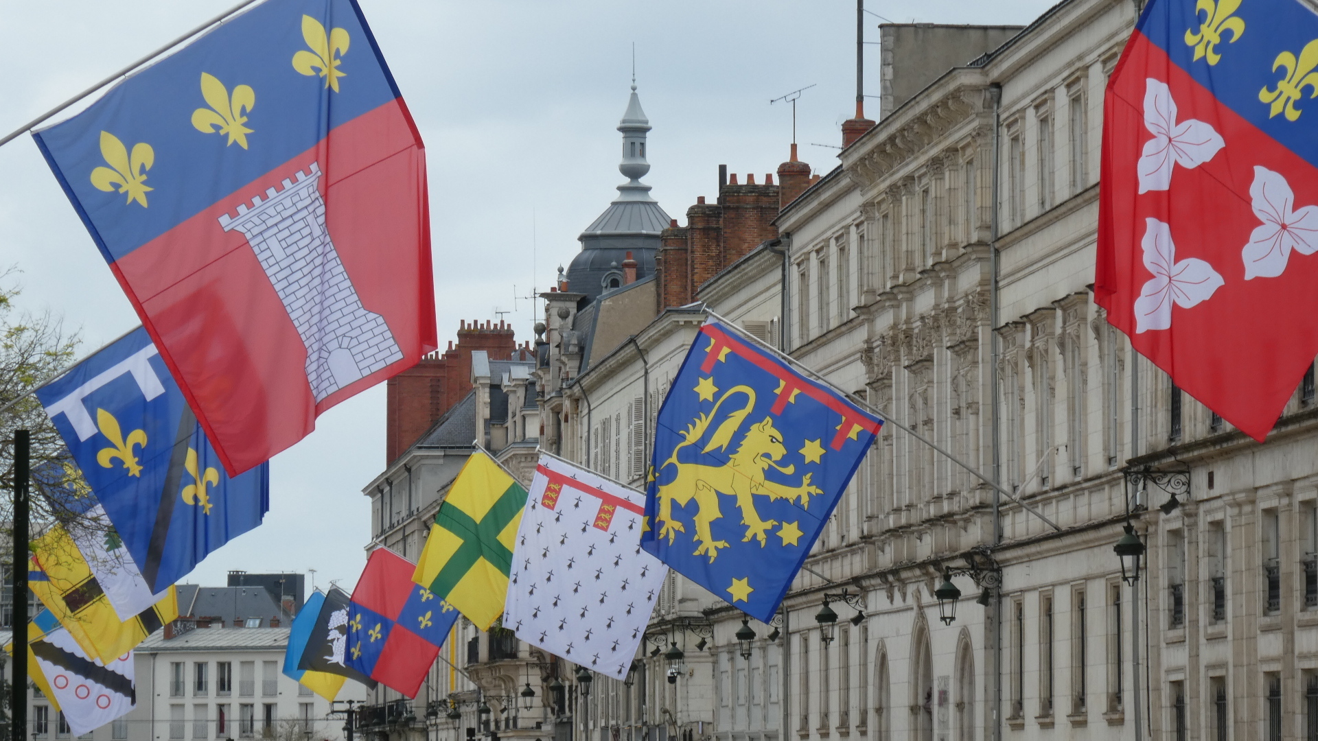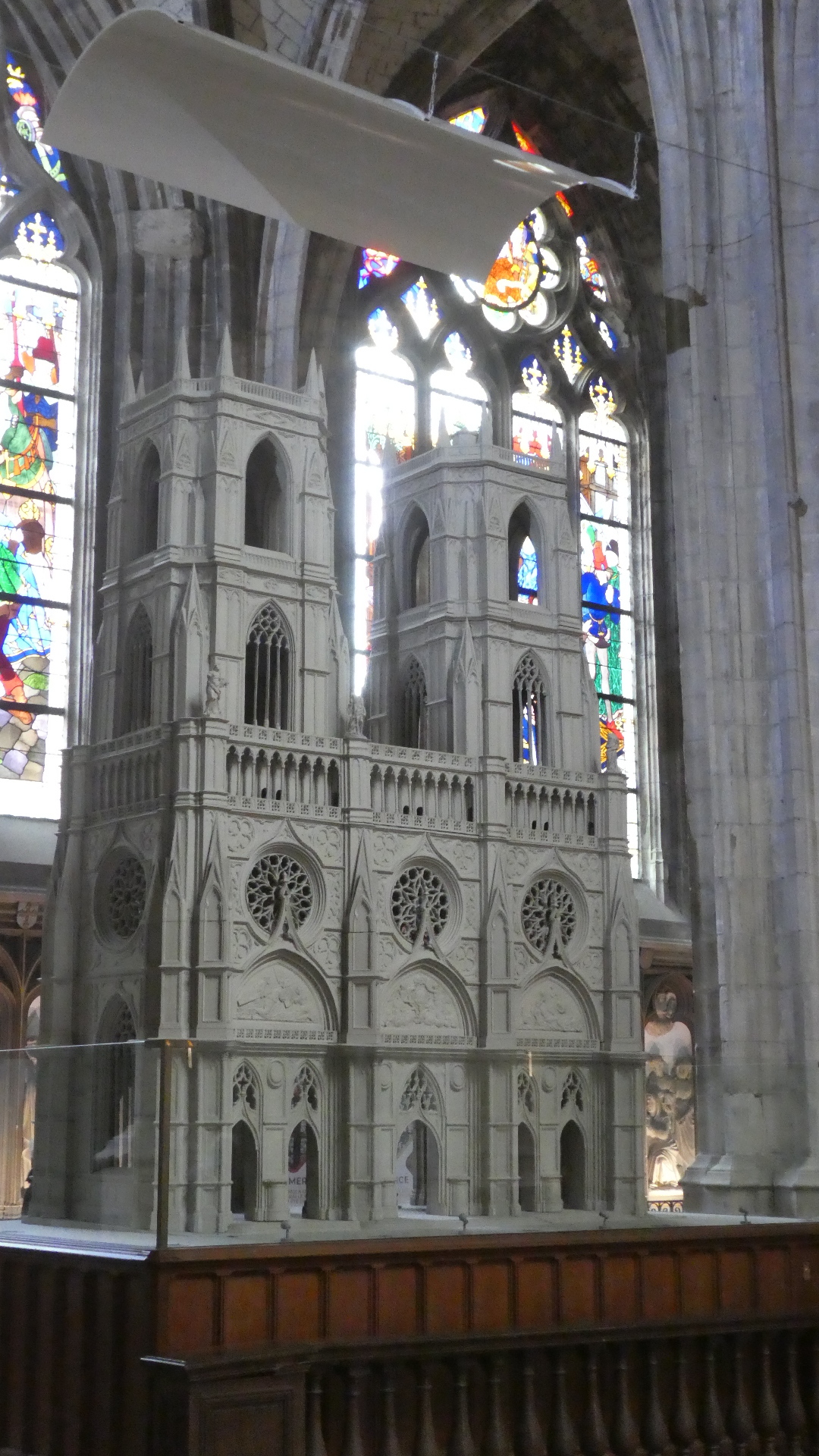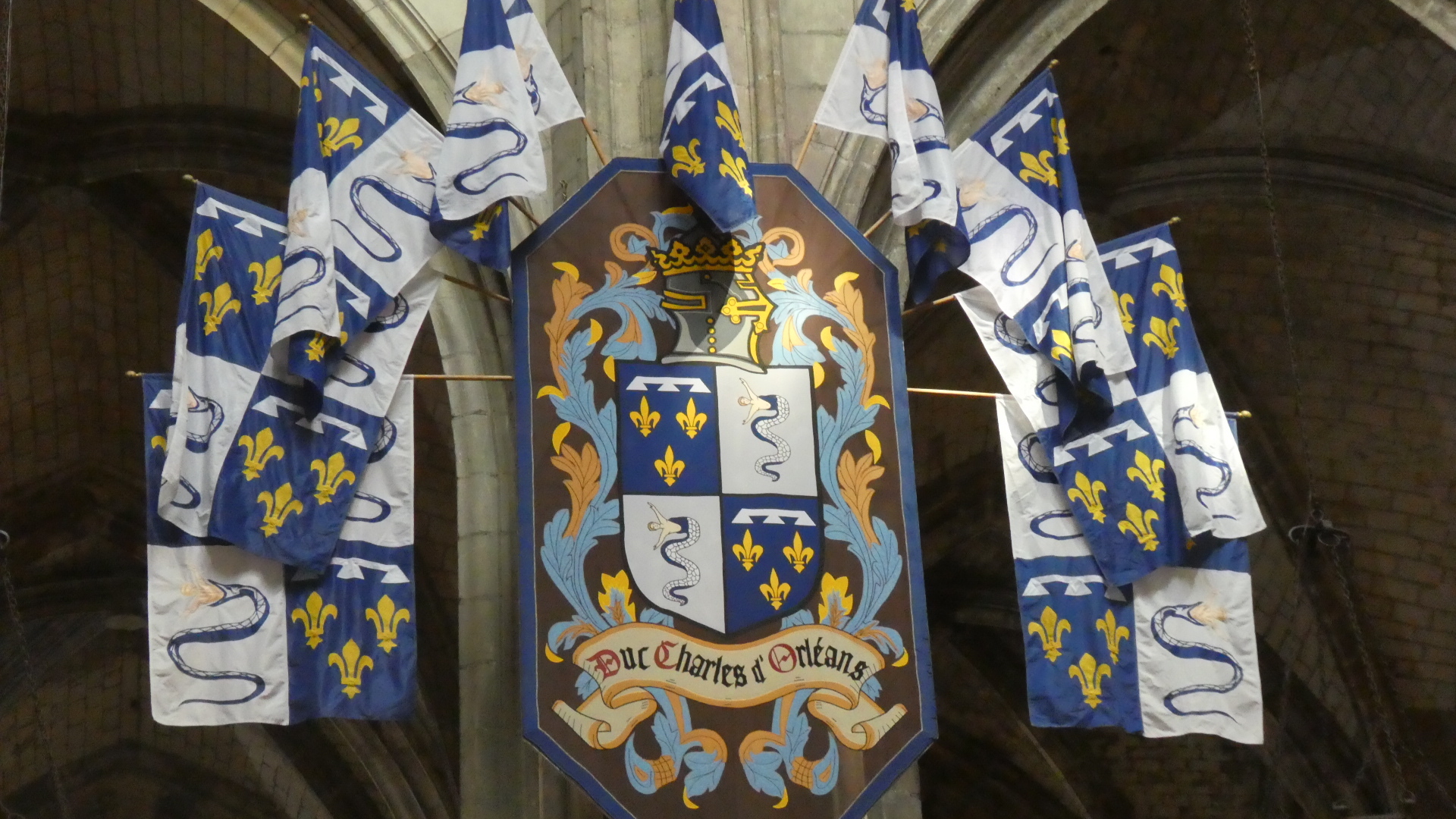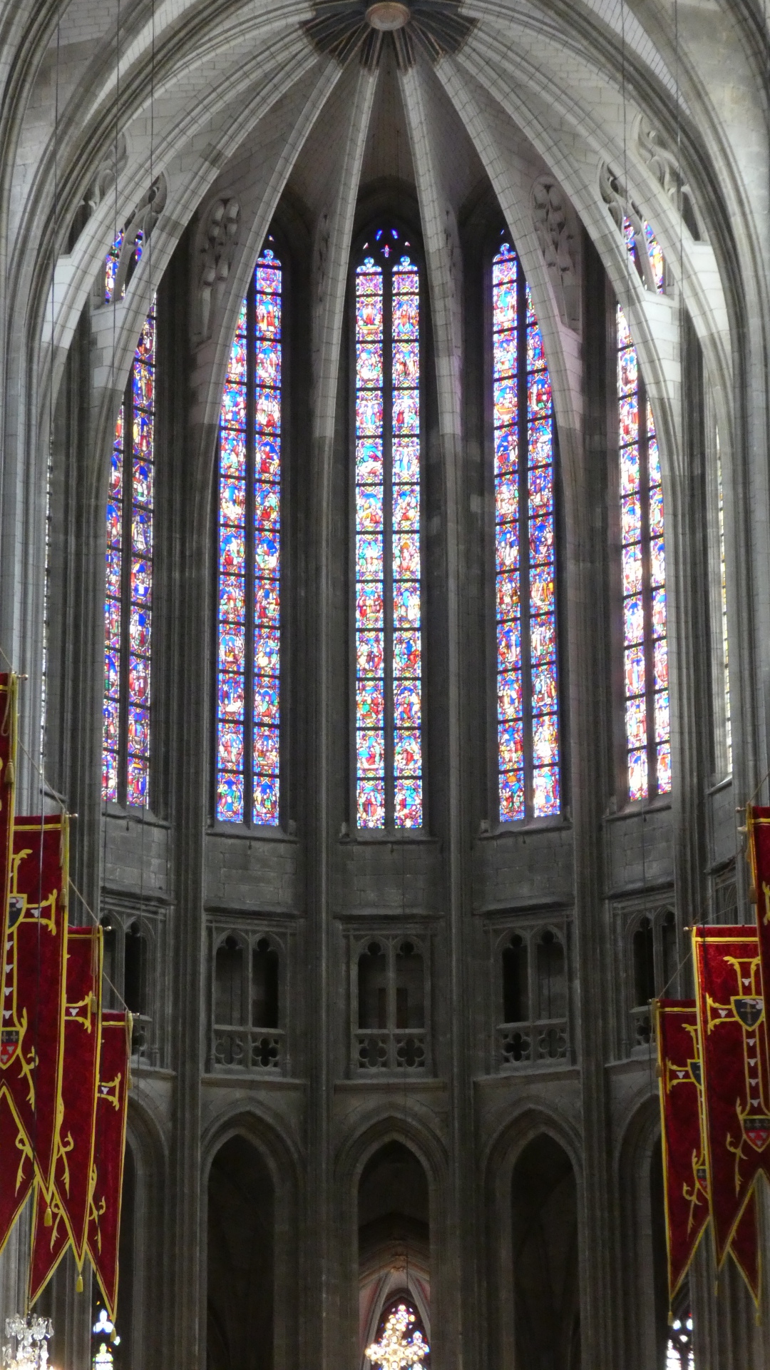 We have been inside a lot of churches and cathedrals by now, and risk becoming "churched out". But Orleans cathedral really was special. It had the tall arches, of course, but also coupled this with colourful flags, and with colourful stained glass, particularly ten huge panels telling the story of Jeanne d'Arc. To this was also added colourful decoration of the columns, and very nice carving in the choir. The whole effect was rather gay, and not at all like some of the cold, gray, and plain, if huge, spaces we have been in.