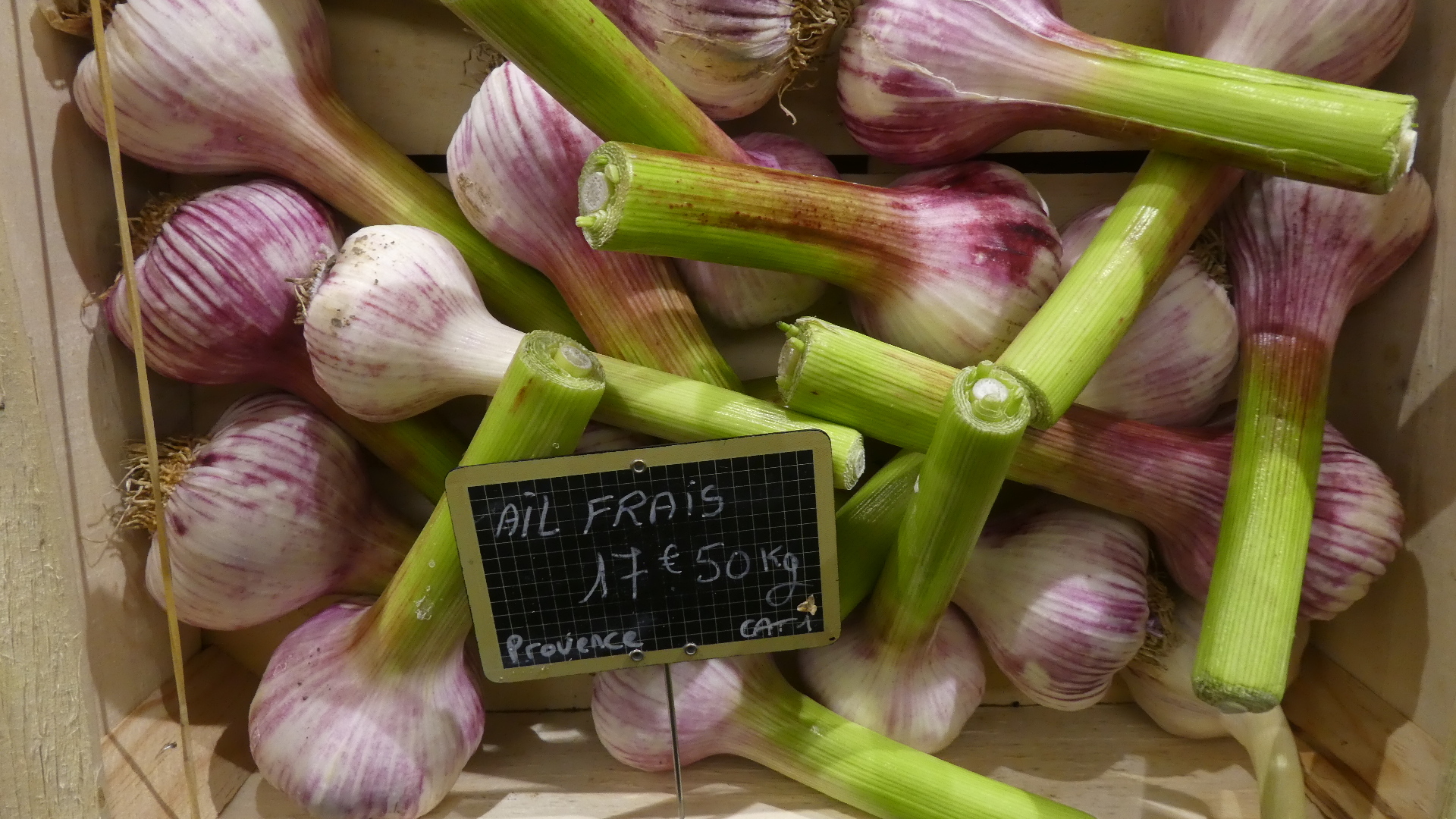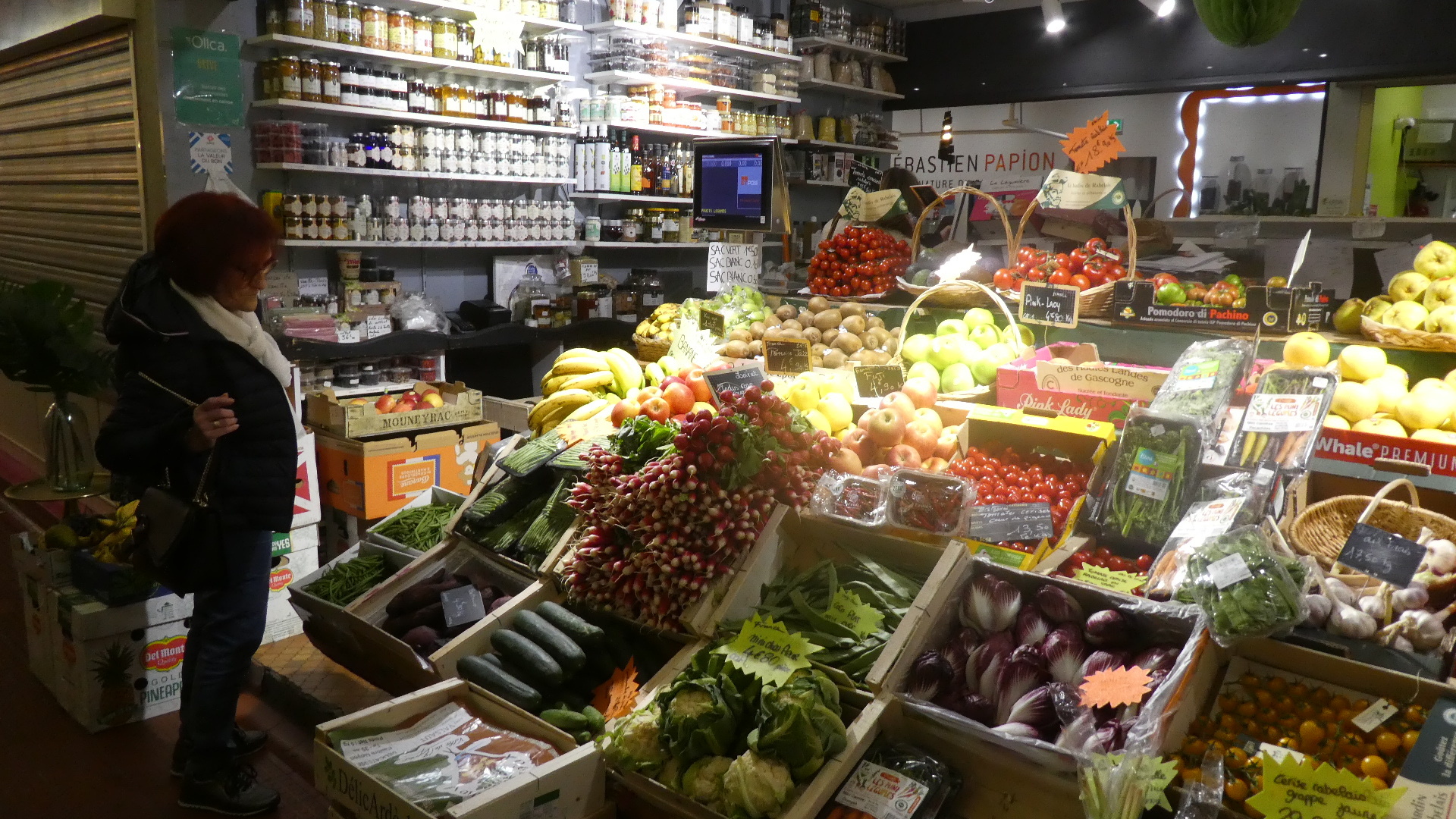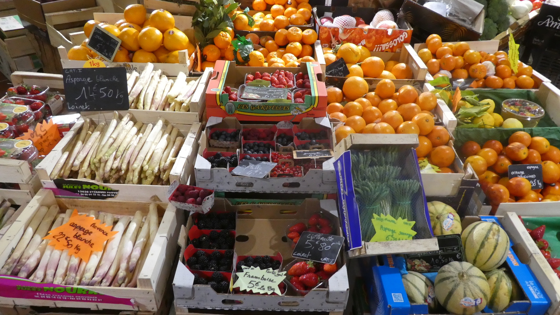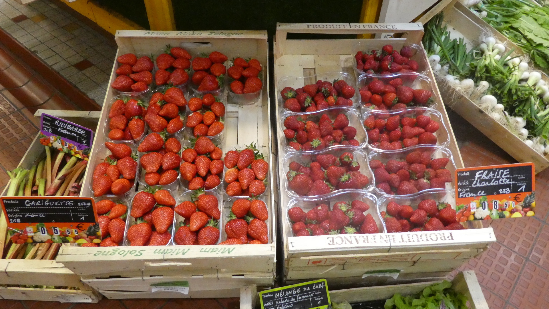 Now here is one that Dodie could not resolve. I wondered between the two strawberry varieties, which would be the good one. I proposed buying one (berry) of each, but she apparently correctly observed that they were sold by the container, and those up to 8.50 euros each. Too costly for basic research! Now we may never know! (The smaller, darker ones look more like what we grow at home.) Someone like Keith Klein might recognize the variety names, though. Left is "Gariguette" , right is "Charlotte".