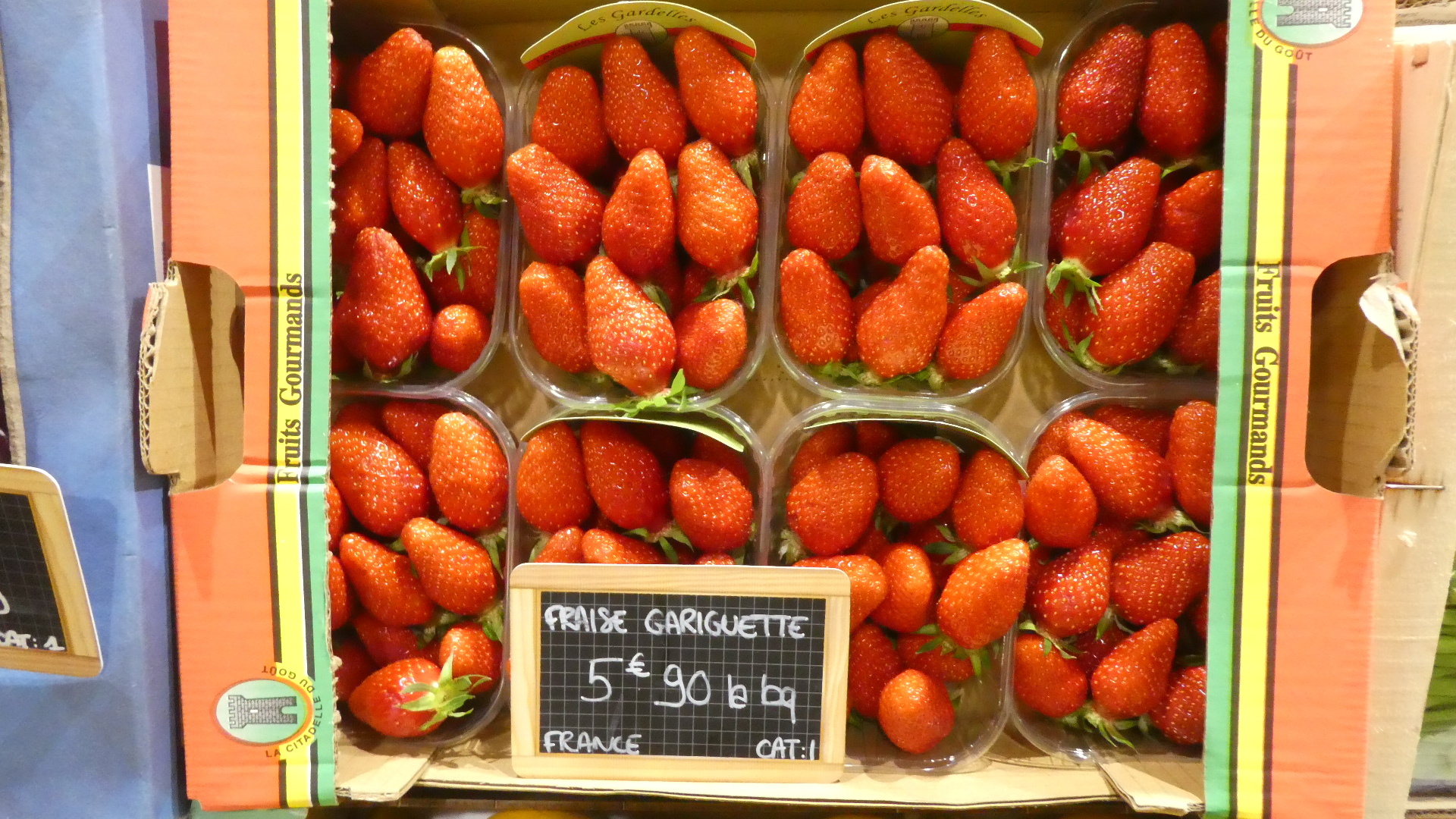 We began back at the market, not really to reevaluate what we had seen, but to find some food for tonight and tomorrow. In the meantime, I had looked up the strawberries, and found that Gariguettes are well regarded in France. So ok, we gave the a try, while still not buying each variety found at the market today. The produce man said they would be flavourful but not sweet, and we agree with this.