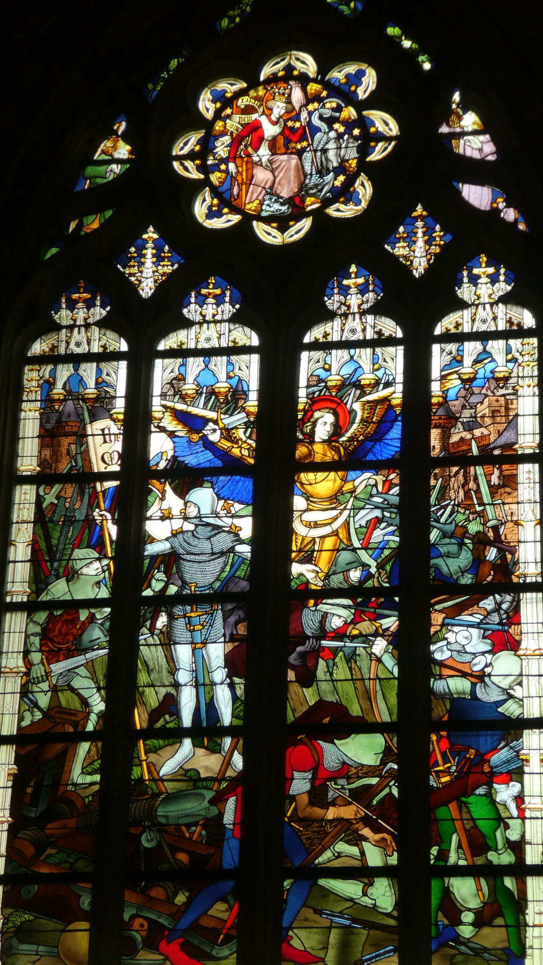 And here, randomly, is Joan panel #6: "Thanks Be to God". The whole history of the Hundred Years War is of course very long, and even the Joan of Arc slice of it, which is towards the end, is complicated. We can pick up in 1422, when Charles VII declared himself king. At this time, British monarchs had lots of territories in France, and John, Duke of Bedford was governing some part on behalf of the infant Henry VI of England. Bedford decided to knock out Charles VII, and moved to take Orleans, as a base to attack Charles, south of the Loire. Orleans looked done for, except that 14 year old Joan got word from God that she should go and tip the scales. She went to see Charles (at Chinon) and got the OK to come back with a small army. In battles here, she the managed to dislodge Bedford. This really boosted the French, and a few years later they managed to totally expel the British. Joan continued in some other campaigns, but got captured, and was eventually tried and burned at the stake in Rouen in 1431.
