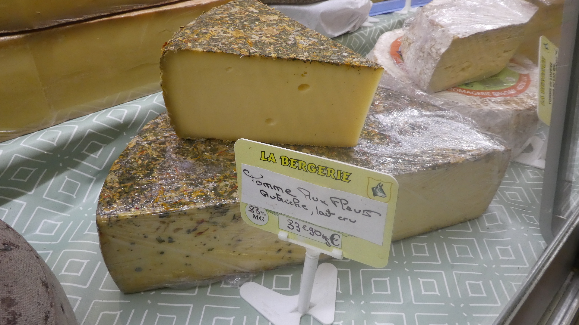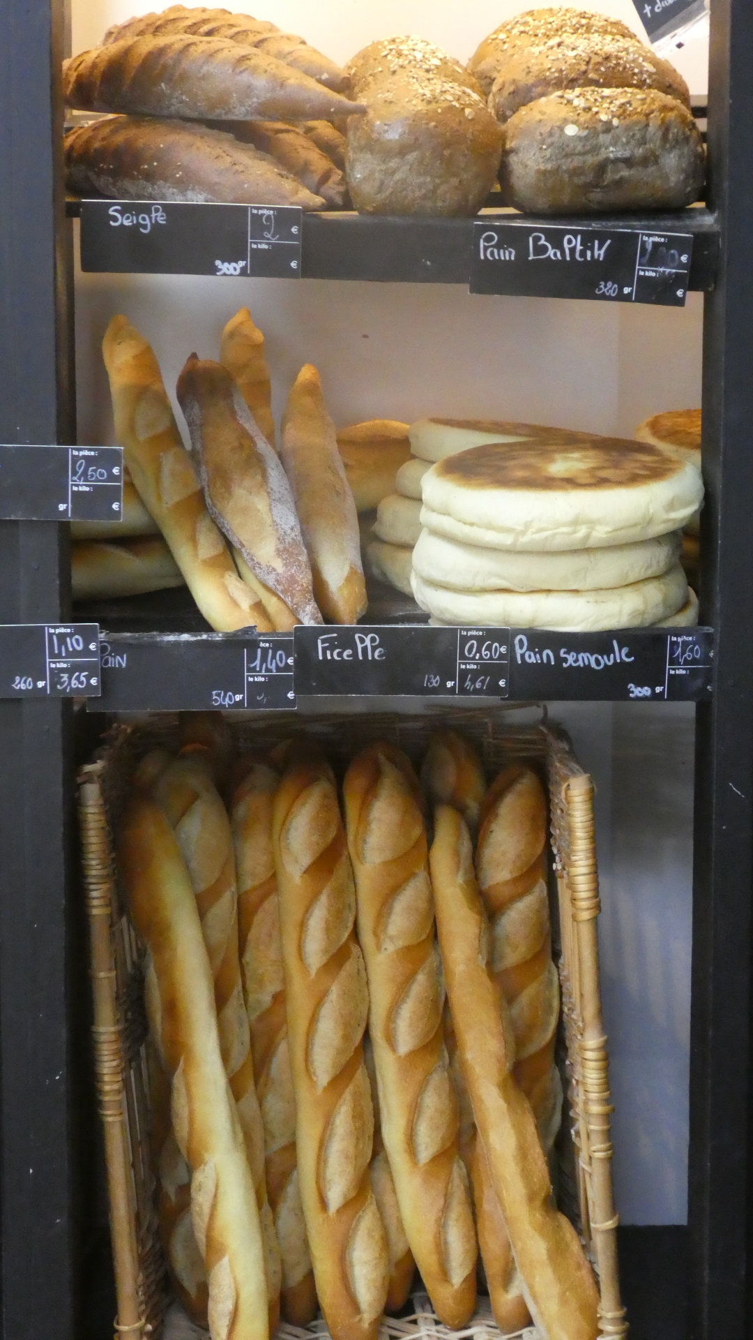 The next area where I needed Dodie to weigh in was at the cheese counter (one of many!). They had this Tomme cheese with what looked to me like imbedded peppers, maybe. I asked for a slice, and the lady went for the wedge above. "No, no", said I, I am talking about the one below, with the enbedded - whatevers. "They are both the same", said the lady, and "No, they are not", said I. Again, a staring standoff between me and a French woman. Dodie had to step in "Yes, they are the same, but give the baby his cut from the bottom one and save the grief". It turned out, of course, they were the same, just that the cheeses have a coating of the whatever, on the outside. Does not really affect the flavour. I know. I tried licking it (later!).