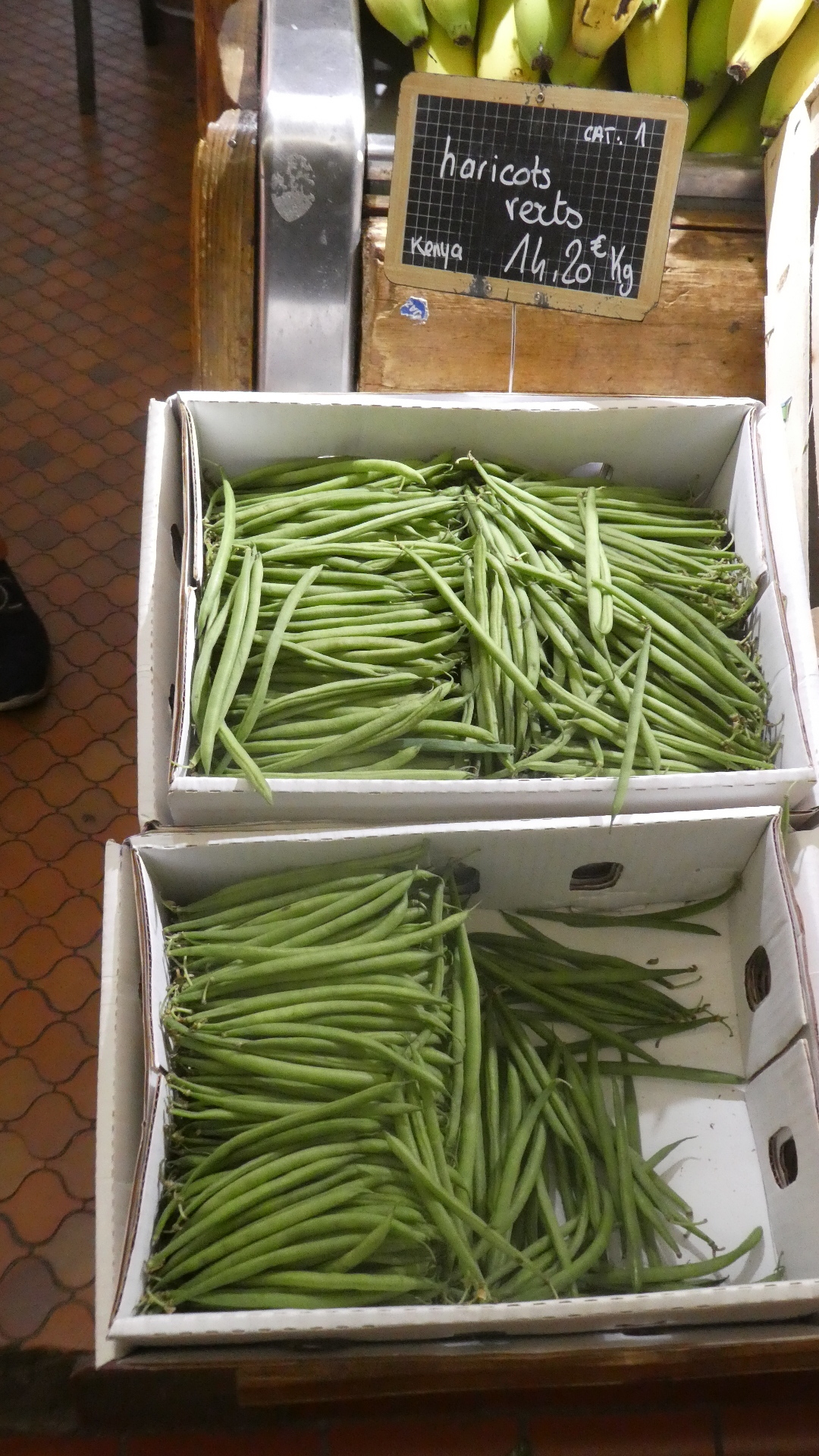 One of the items always found at French markets, and at home only of you grow your own, and at that it's not so easy, is the ultra thin green string bean. So I like to photograph them when I see them. In this case, like the lady in the photo, someone or more ladies were always standing in front of the beans when I tried for my shot. I finally had to go to Dodie, and in my usual way, ask her to go push the offenders out of the way, something she will never overtly do. So I gave her the camera and sent her after the shot. She waded in among the three old ladies blocking up my beans, blended right in, I thought, and came back with the shot. Right on!