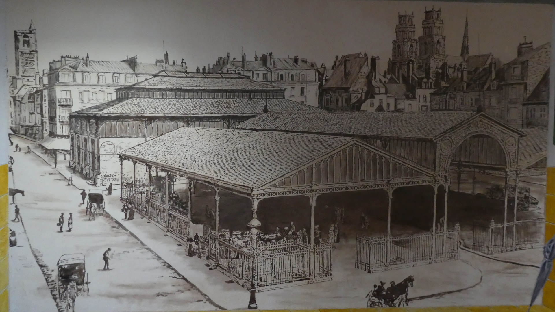 We went first to the covered market - Les Halles. At the entrance is a graphic of what this used to look like, but now it's a modern building.