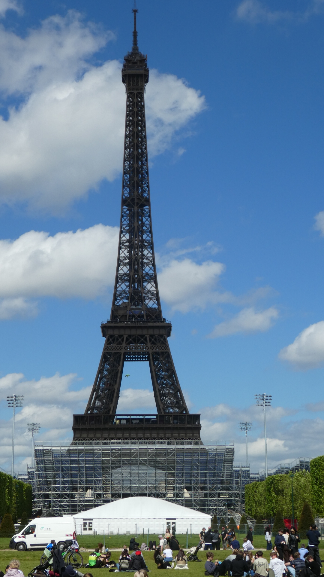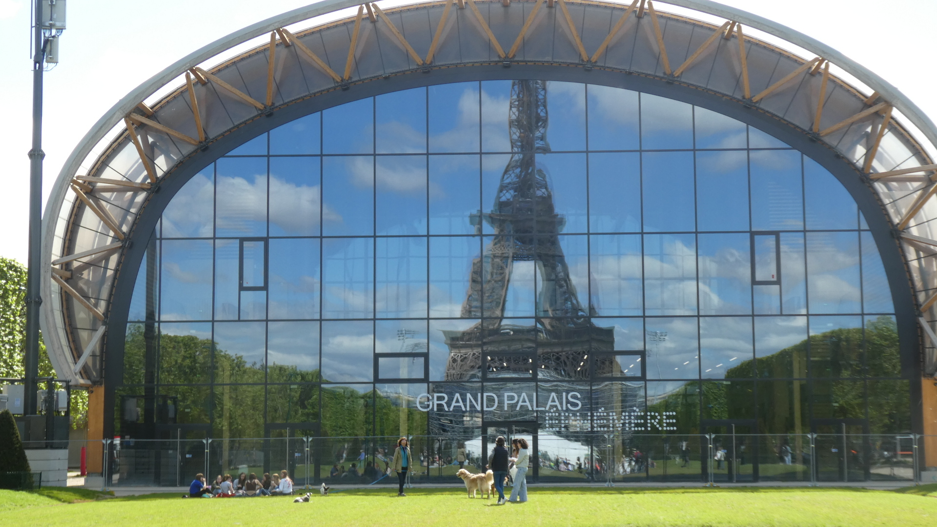 Paris is hosting the Olympics in July-August, and the Eiffel Tower area - the Champs de Mars will be site of the opening ceremonies. Grandstands have been erected, and there is a structure called the Grand Palais Ephemere nearby. This temporary structure at the Champs de Mars is standing in for the original Grand Palais exhibition hall, that is undergoing renovation. The temporary structure here will host wrestling and judo Olympic events.
