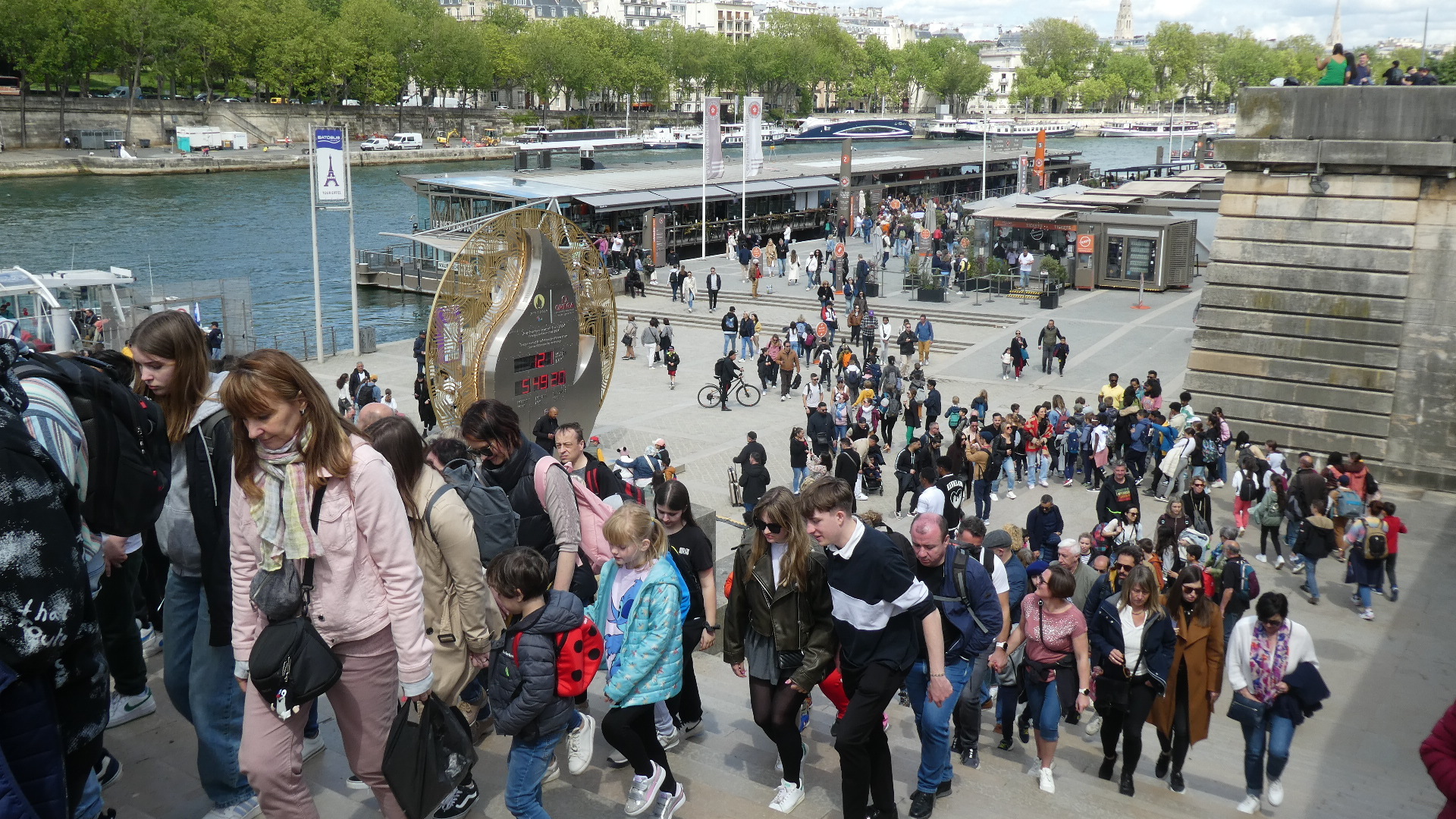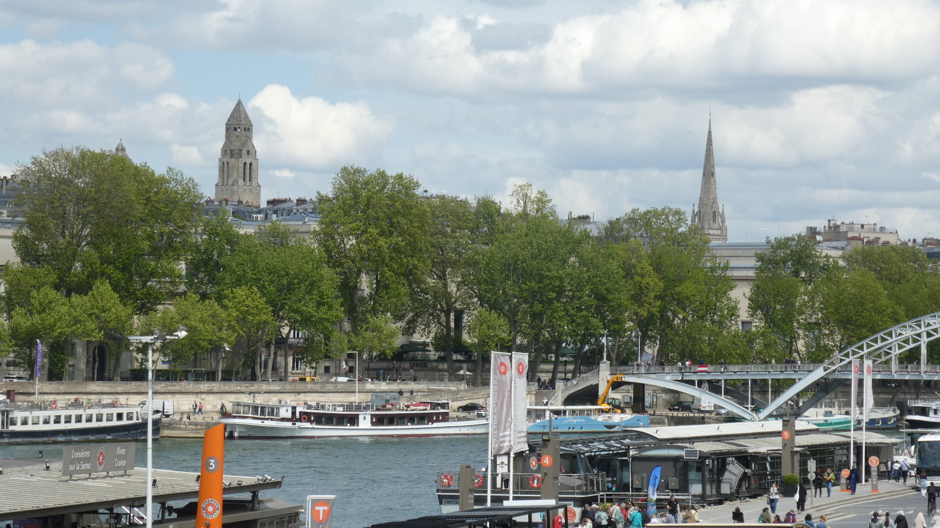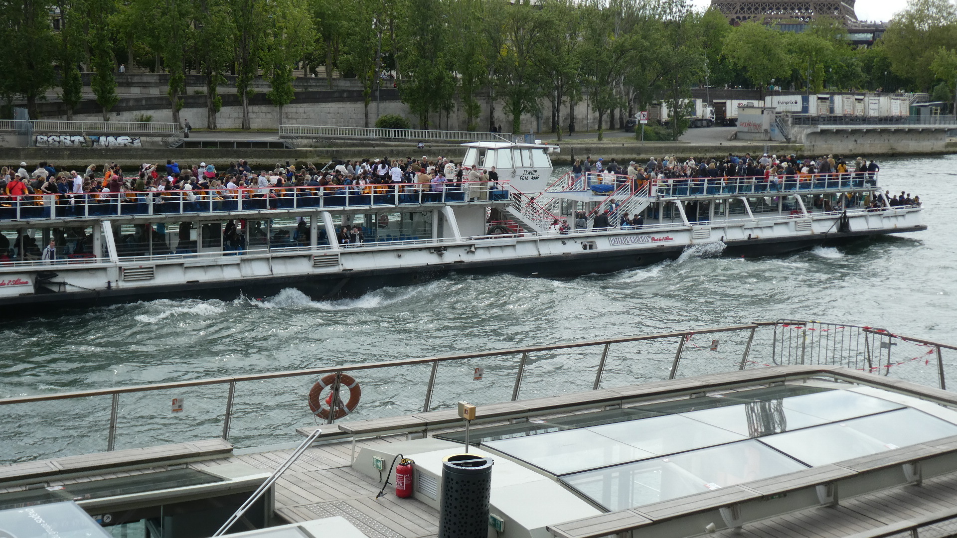 The Eiffel stands by the river, and near it is a river boat dock. The boats go up and down the Seine, and give great views of the famous buildings and monuments that line or can be seen from the waterway.