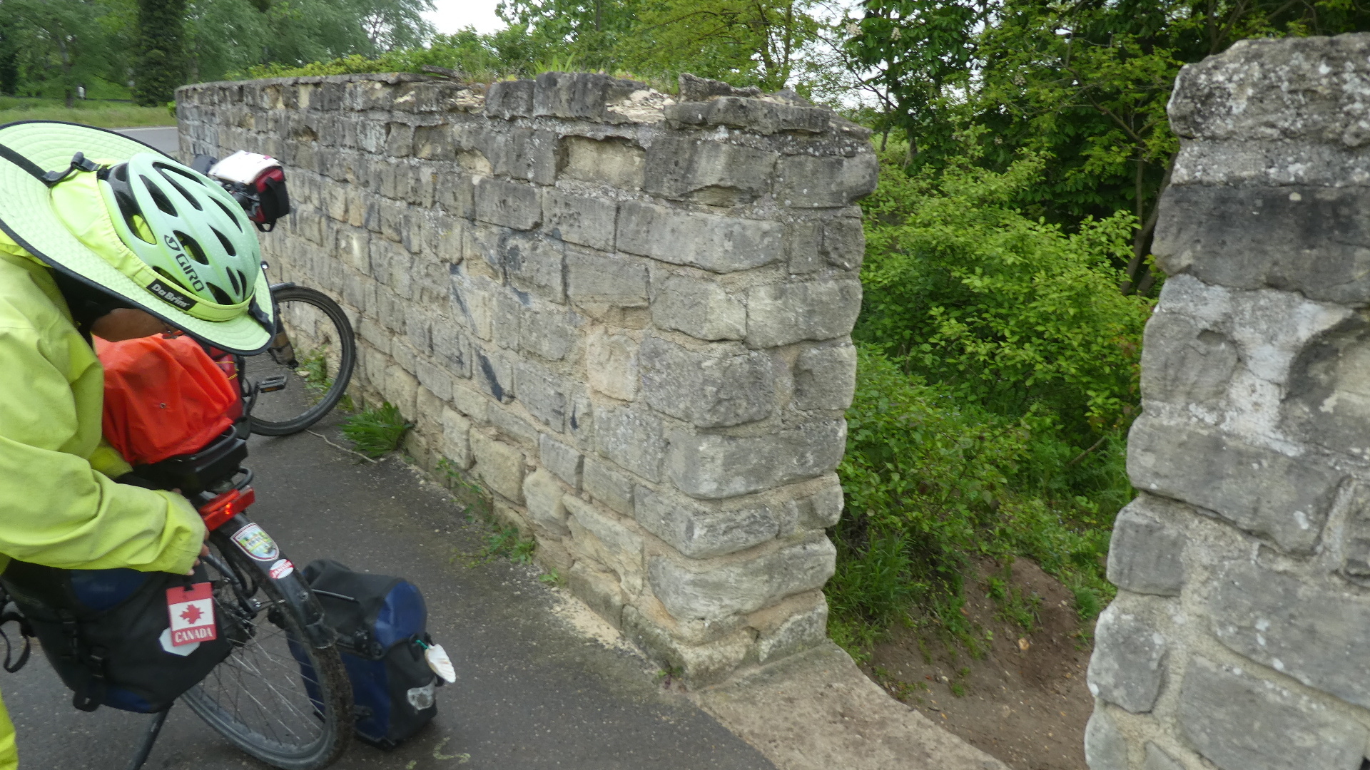 We did use the GPS to make our way to a road, though we were hemmed in by a stone wall for much of the way. We reached a break in the wall, but had to heave up bikes up a steep ledge.