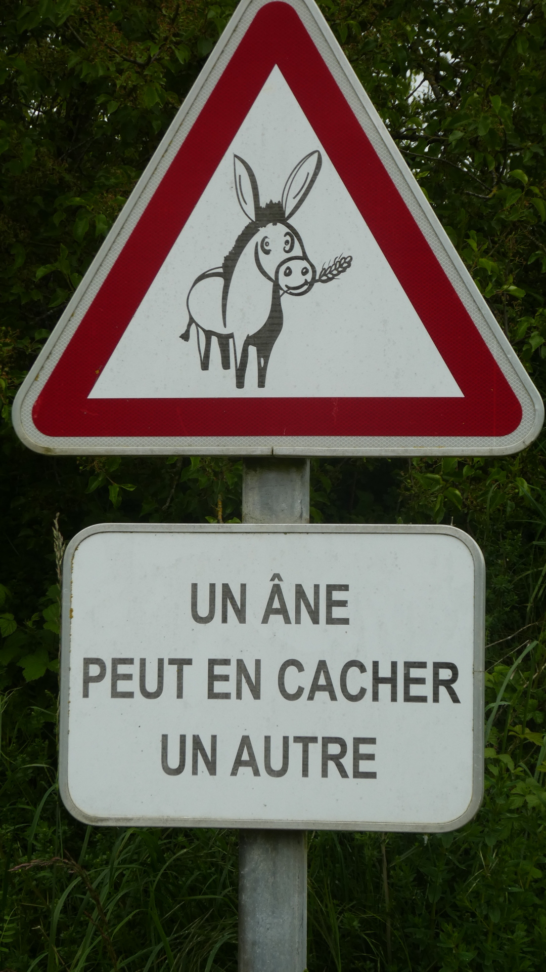 One town seemed to specialize in donkeys. That's where we found the sign below. Anyone who has travelled in France will get the pun. In France, every level train crossing has the warning "Un train peut en cacher un autre" - one train can hide another.