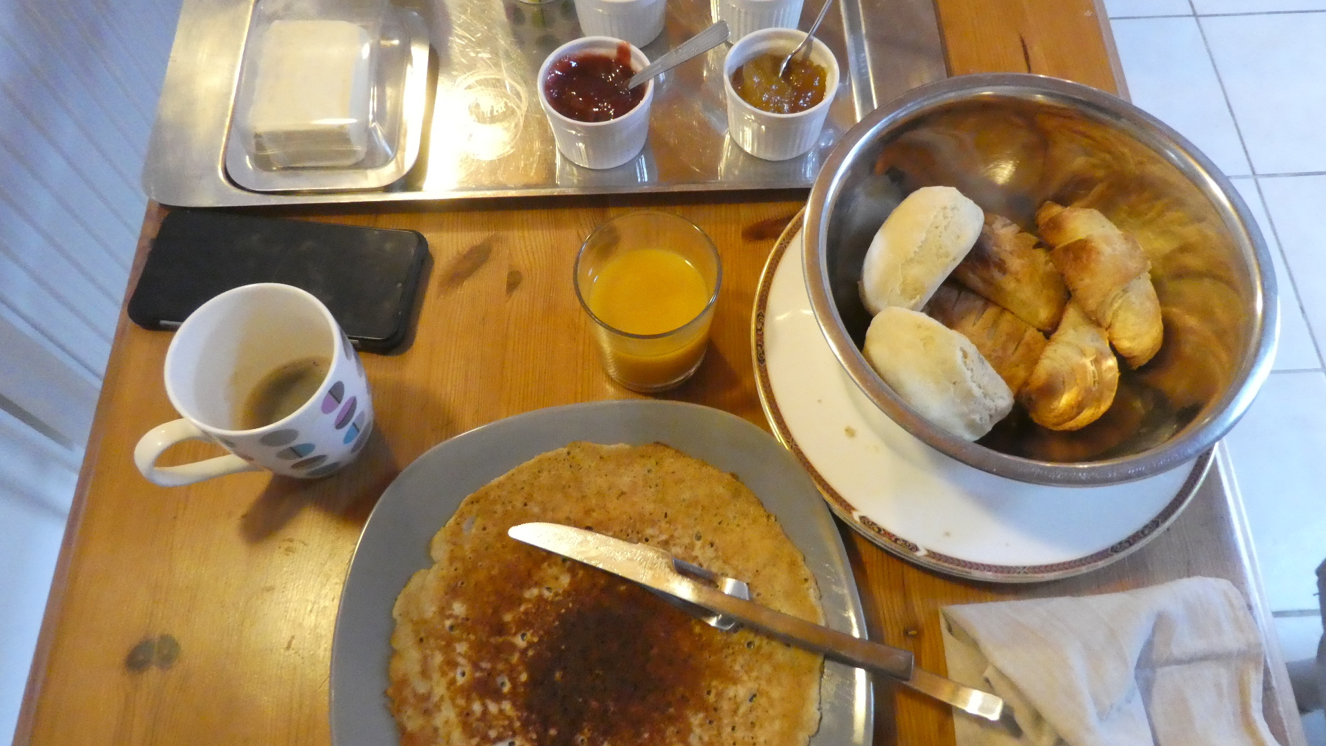 Backing up a bit, our place here at Ian and Clare's place is the same as a little cottage, with kitchen and sitting room downstairs and bedroom and washroom upstairs. It feels like a place in the country, because it is (though technically in the tiny town). Ian began our day by bringing over some breakfast, which included vegan oat pancakes, croissants, pains au chocolat, and so forth.