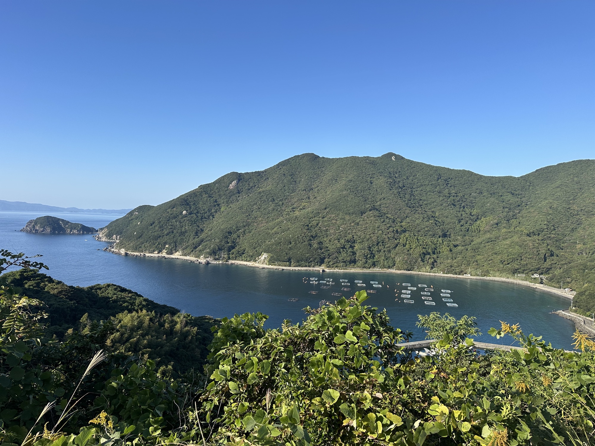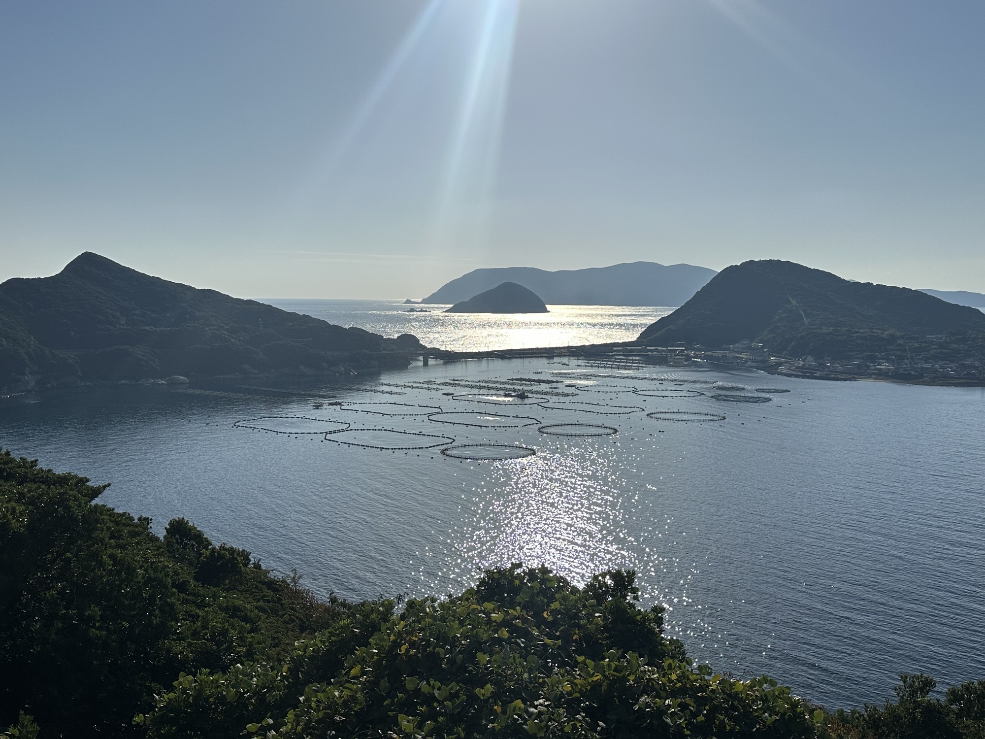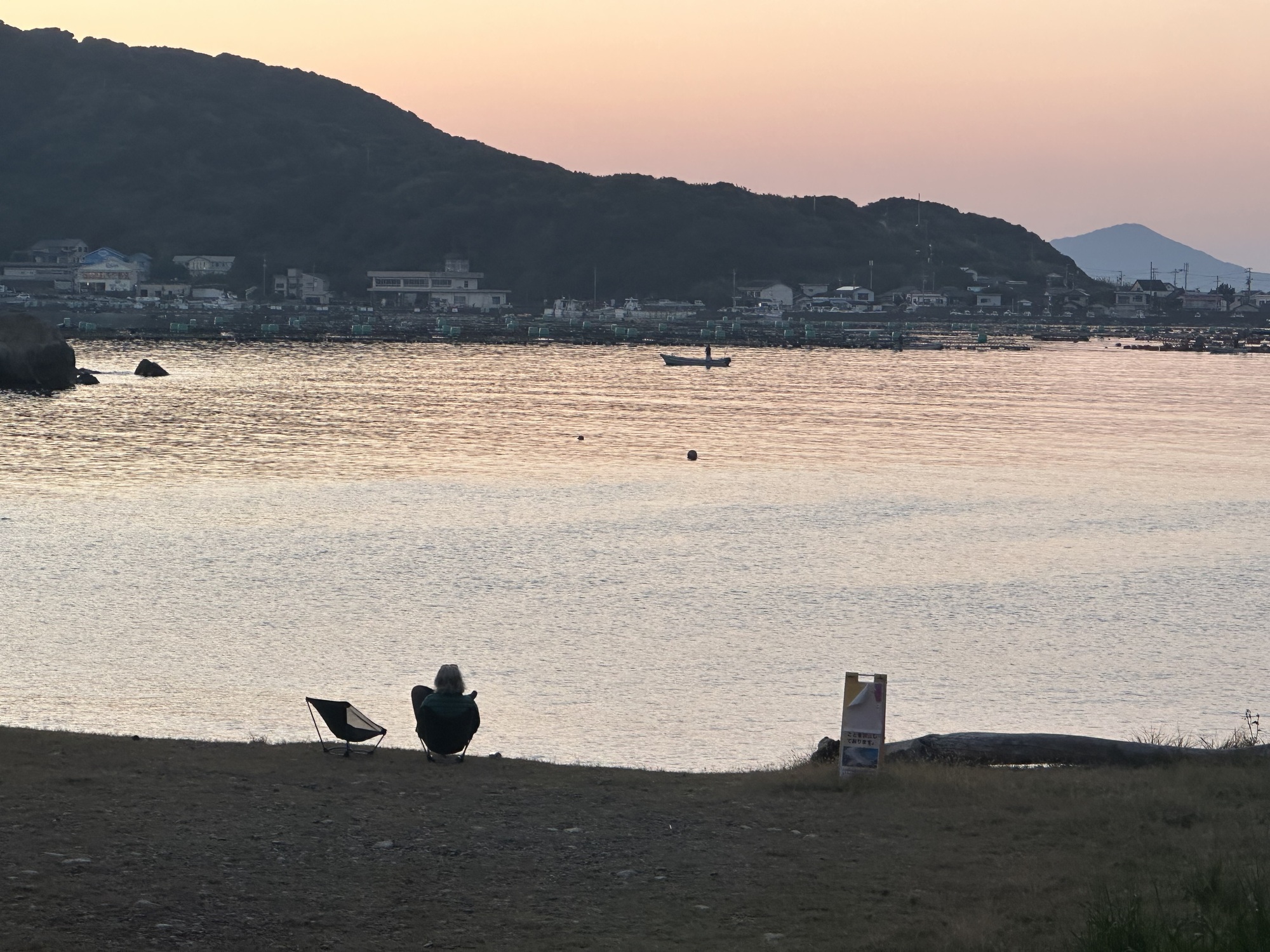 Well, we left the rice paddies behind and got on the highway, which took us up, up, up into the hills (as roads here like to do). We were heading for another beach campground, this one on a southern peninsula, but there was an up and over to get there. We stopped at the last town before our destination to stock up on food, then swooped up and down on minor roads for the last 15km until we encountered the campground sign. Which pointed us down, down, down a steep switchbacking road to the seaside campsite in an idyllic sheltered little bay… filled with fish farms. I’d been looking forward to a swim, but the sight of the fish farms changed my mind.