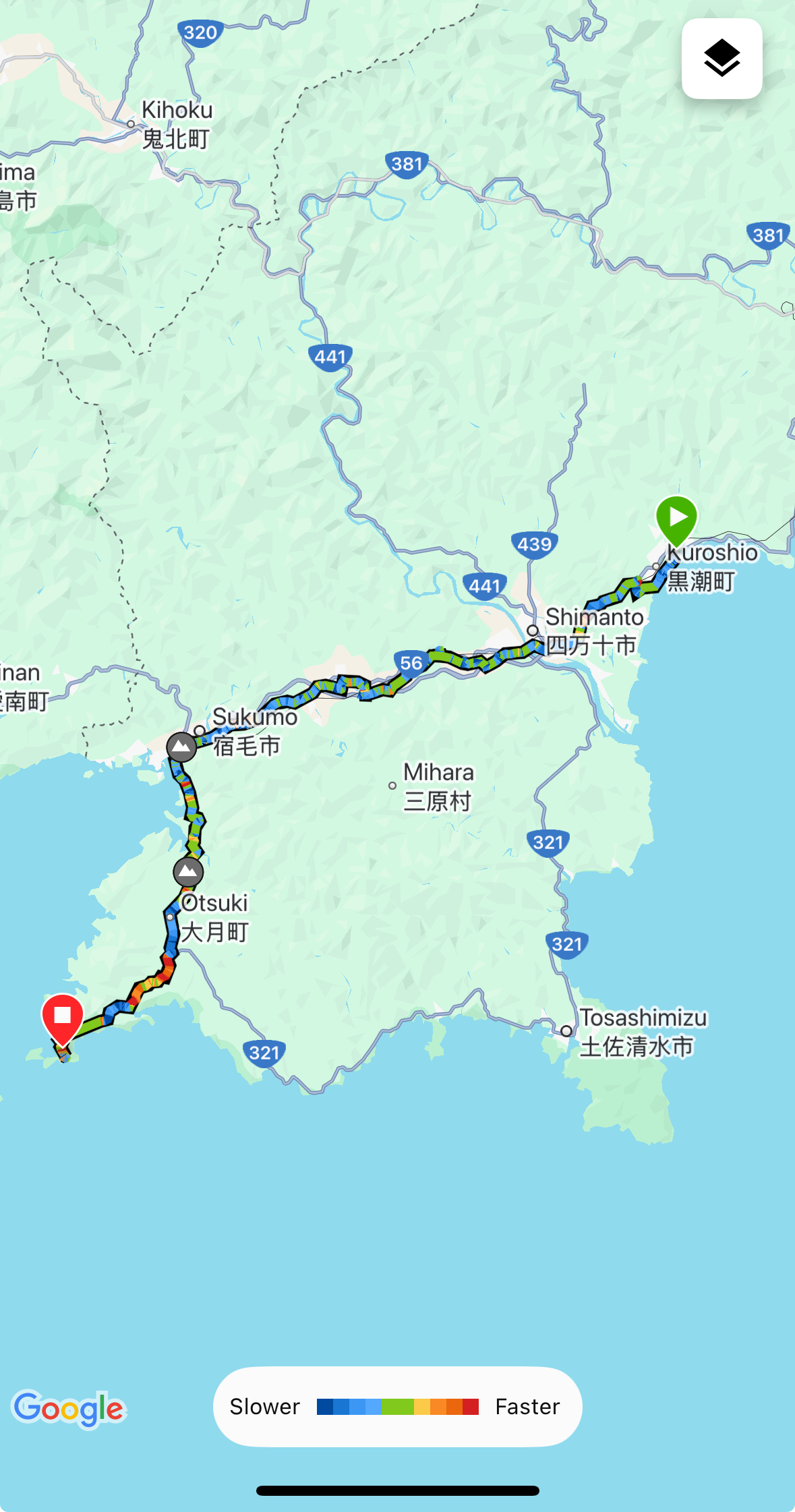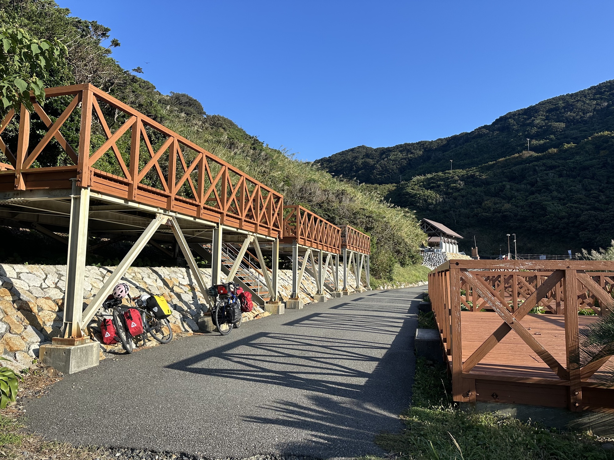 The campground was actually a series of decks, making clever use of the very non-level terrain. And we were again the only campers. However, we arrived while the camp manager was still on duty, so no free camping for us tonight. However, there were hot showers and many, many outlets. We got cleaned up and all our devices got charged, ready to meet the challenges of the day ahead.