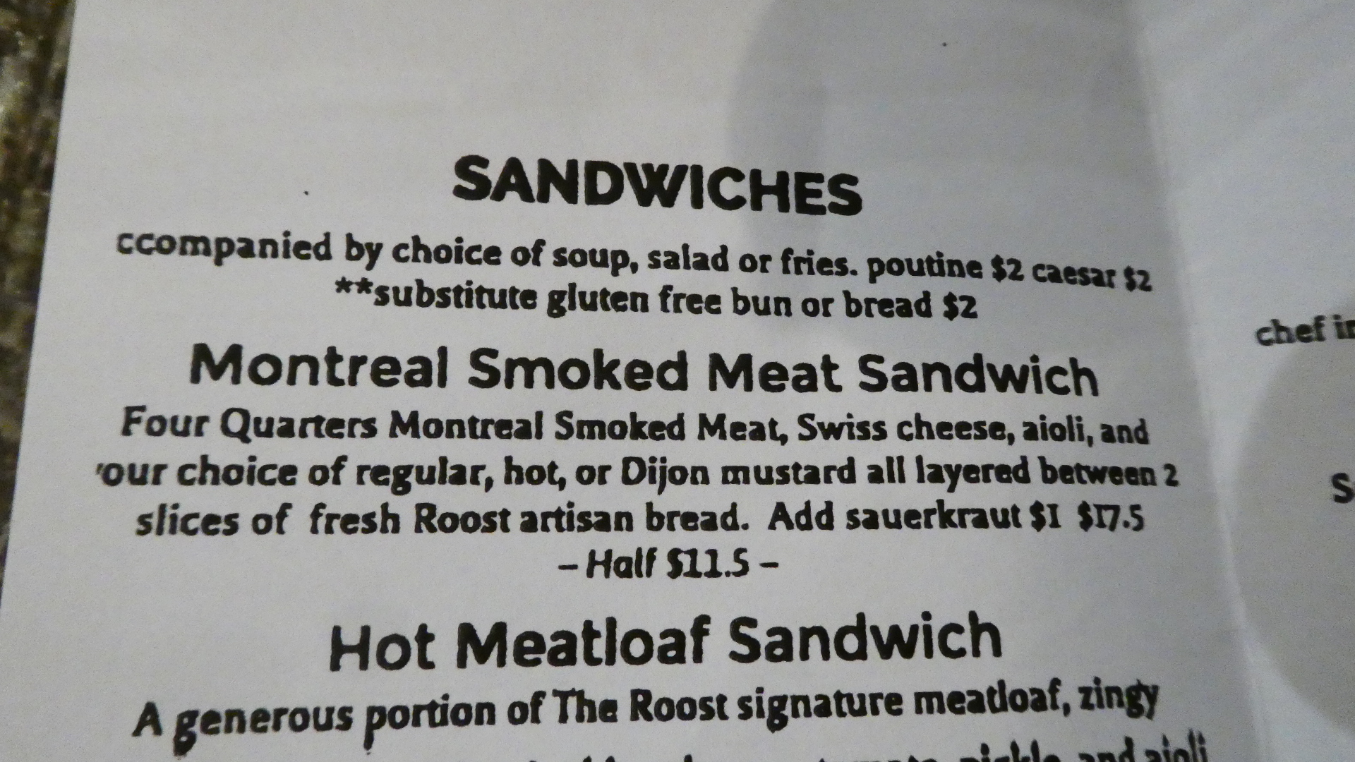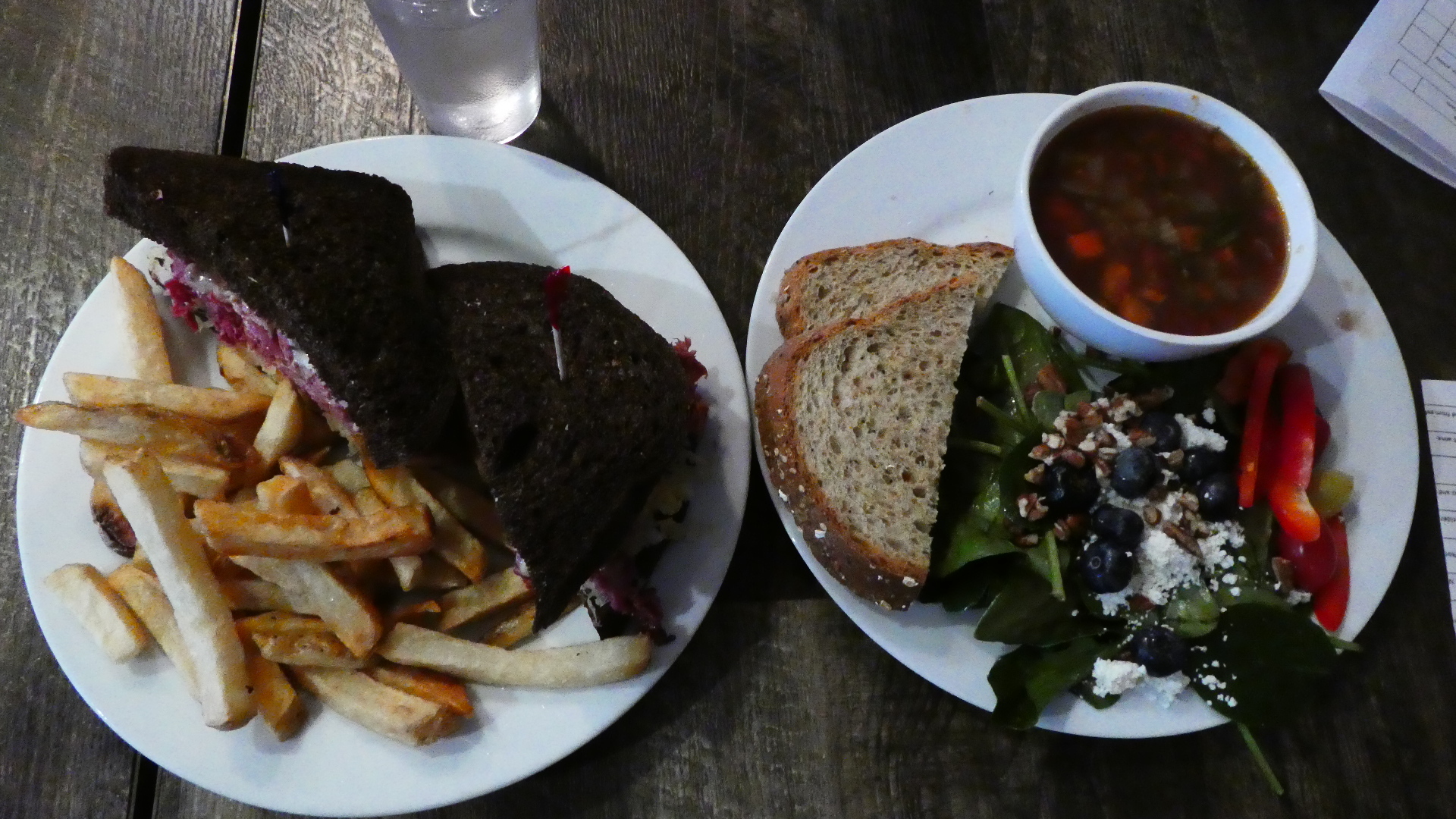It turned out to have some nice looking baking, and also decent sandwiches. On the list was a Montreal Smoked Meat sandwich. Sue said later she was cautious about that, because it literally never is "the real thing", no matter what they say on the menu. But I am the always optimistic sucker that buys Eclairs in Portugal, Pastel de Nata in Montreal, and probably Nanaimo Bars in Gimli, Manitoba, so in I dove.