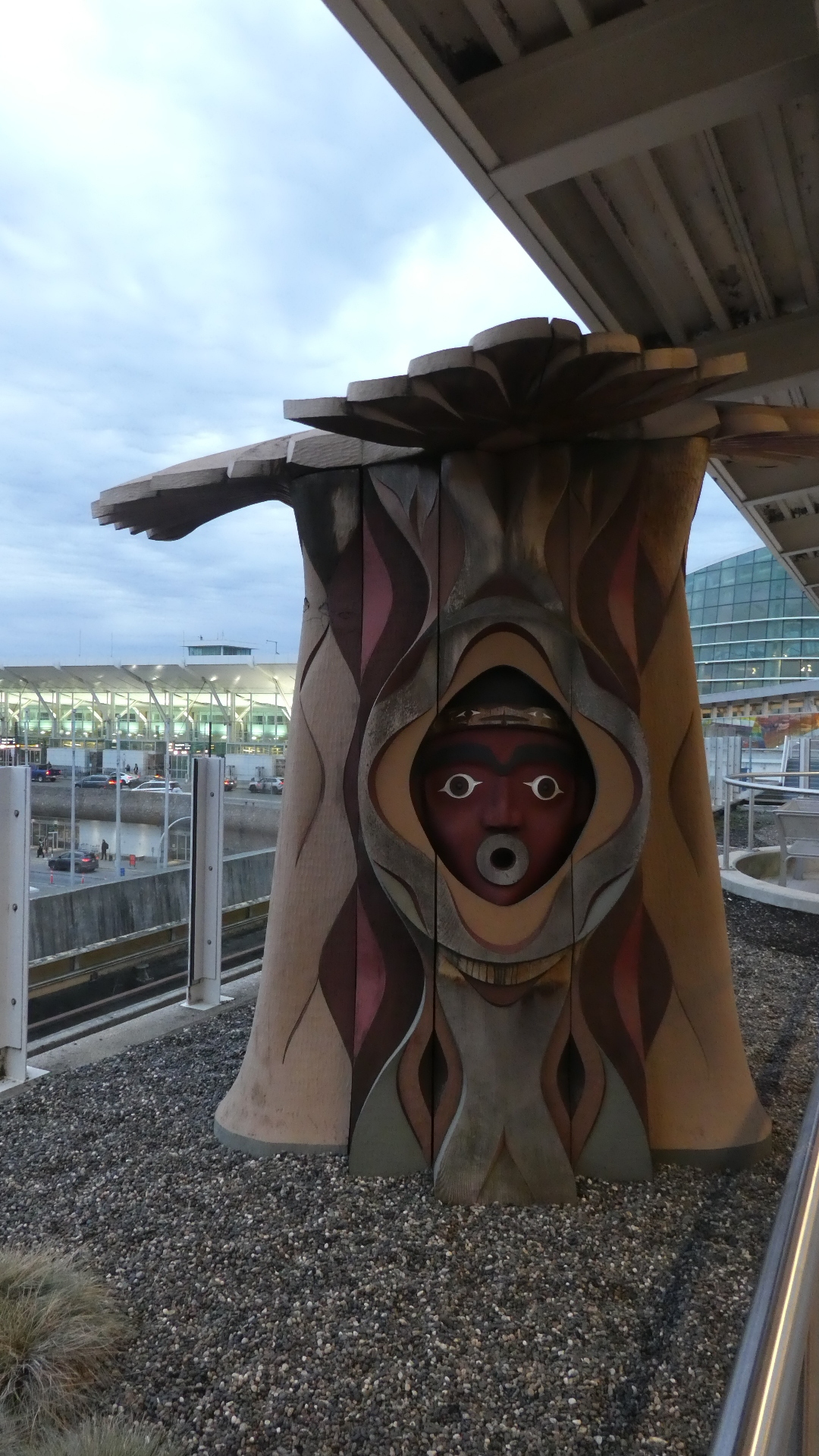 Dragging the two heavy bike cases and the two heavy duffles was a bit of a chore, along the long corridors of the ferry terminal, onto the bus to the Skytrain, onto the Skytrain, and finally on the skybridge into the airport. At the airport I also traditionally remark on the Indigenous carvings, which I have sometimes described as unwelcoming (whether intentionally or not). But this time we ran into one that was rather cute, maybe even welcoming!: