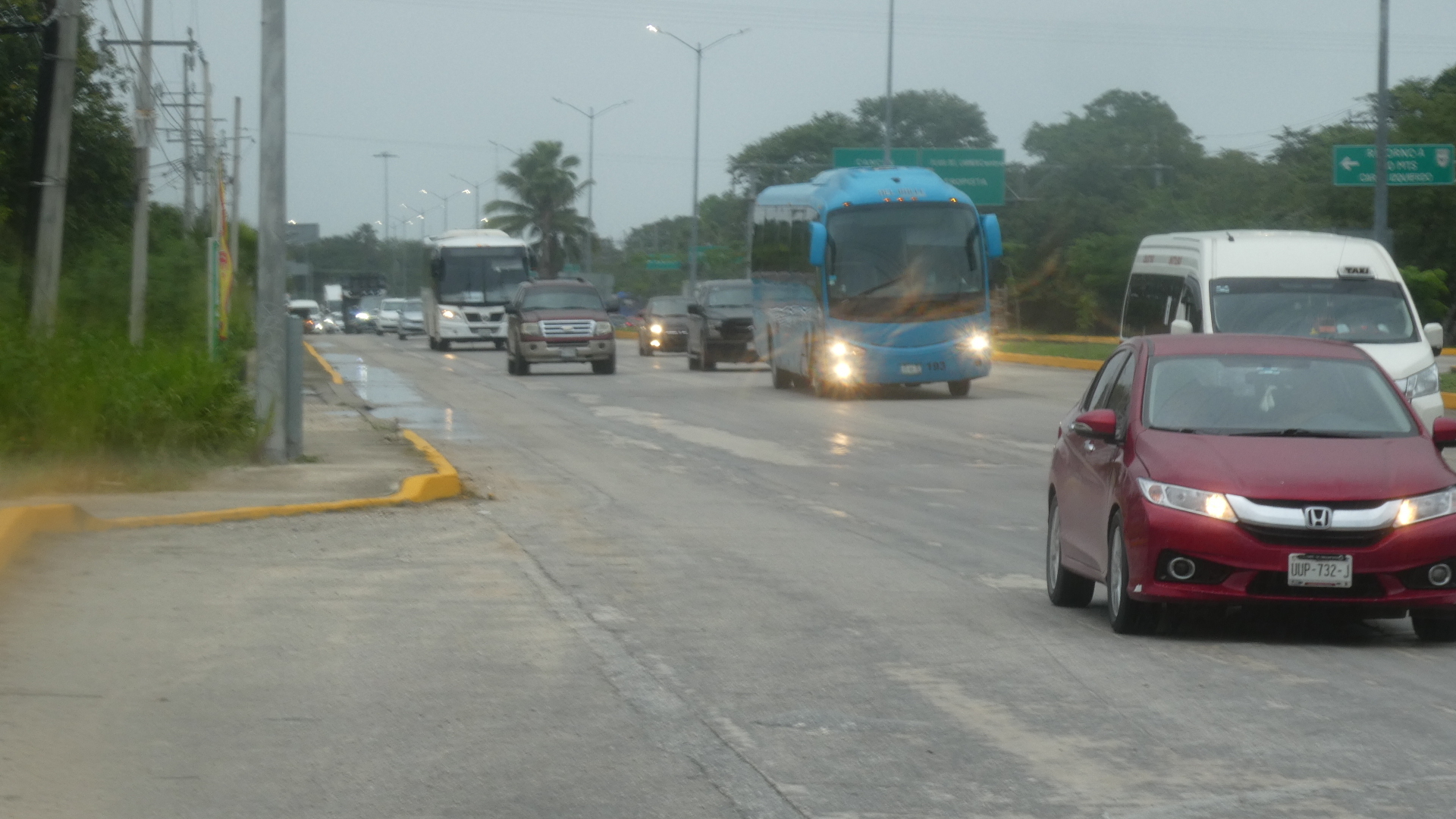 Did I mention that it has been raining in Playa, sometimes quite heavily? Yes, and it decided to do it again as I walked, increasingly forlornly, down the unforgiving and busy 307. I did not make to Tulum, or anything, but I sure got tired, and wet. Finally I stopped in to a rare hotel along the way and tried phoning Dodie. Inexplicably, she had her phone turned off. But just then a taxi pulled up, to drop off some people who clearly did know what they were doing. I approached the driver, and suggested 200 pesos for a ride to my hotel. It would have to be 300, he said, because we were so far out of town, and on the wrong side of the road, meaning a drive to a turnaround spot. Say what? OK, but we still agreed on 250 pesos.