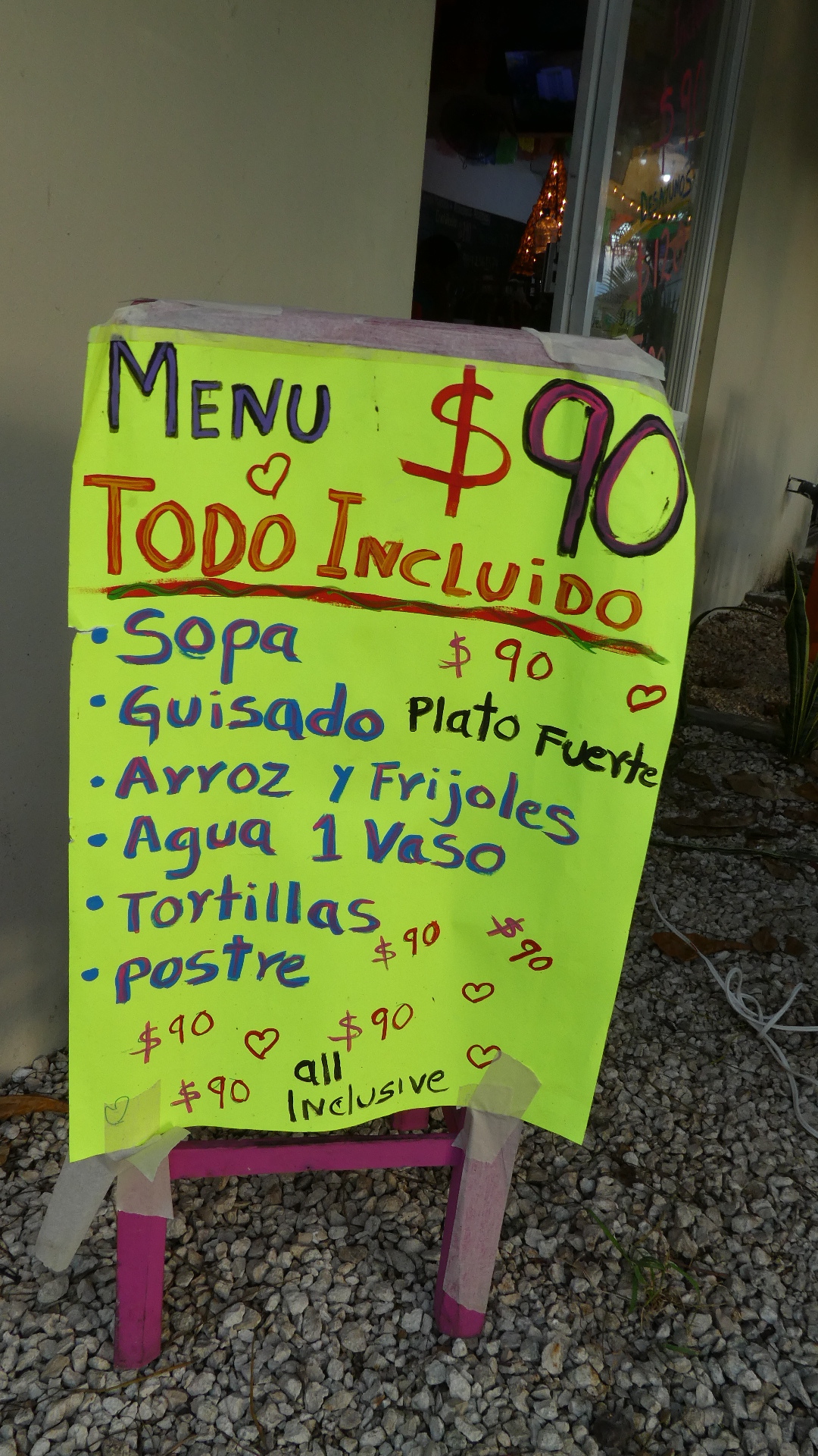 Our final research bit was outside a nearby restaurant. There you could dine for 90 pesos - $7, vs, the $20 we had just paid. So what could you get?